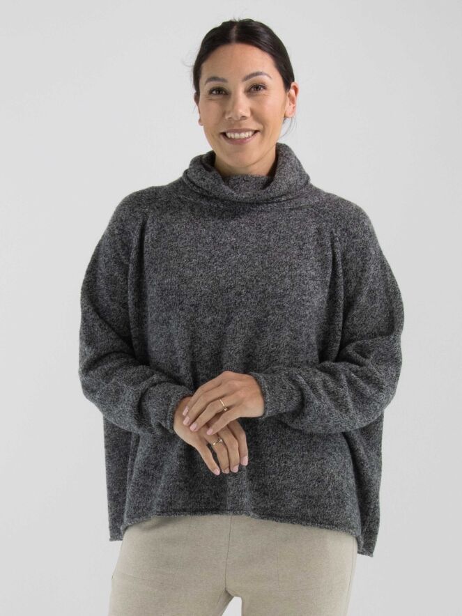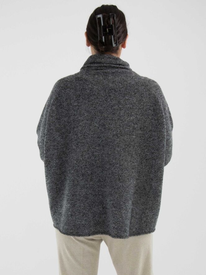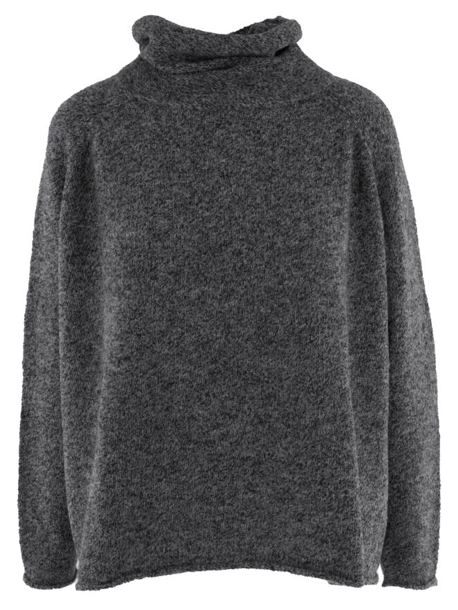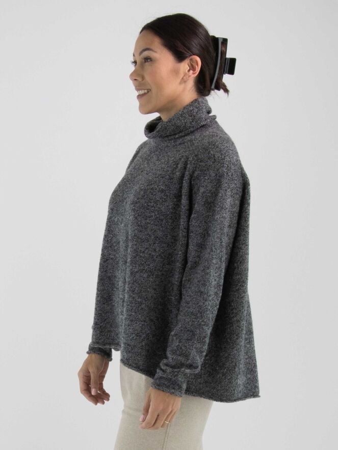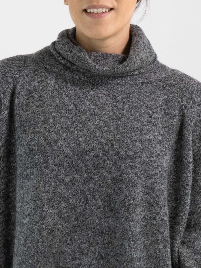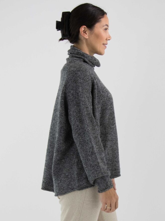 Pull ample chiné de Rundholz Black Label dans des tons de gris avec du noir. Il présente un col roulé tombant et doit être lavé à la main.