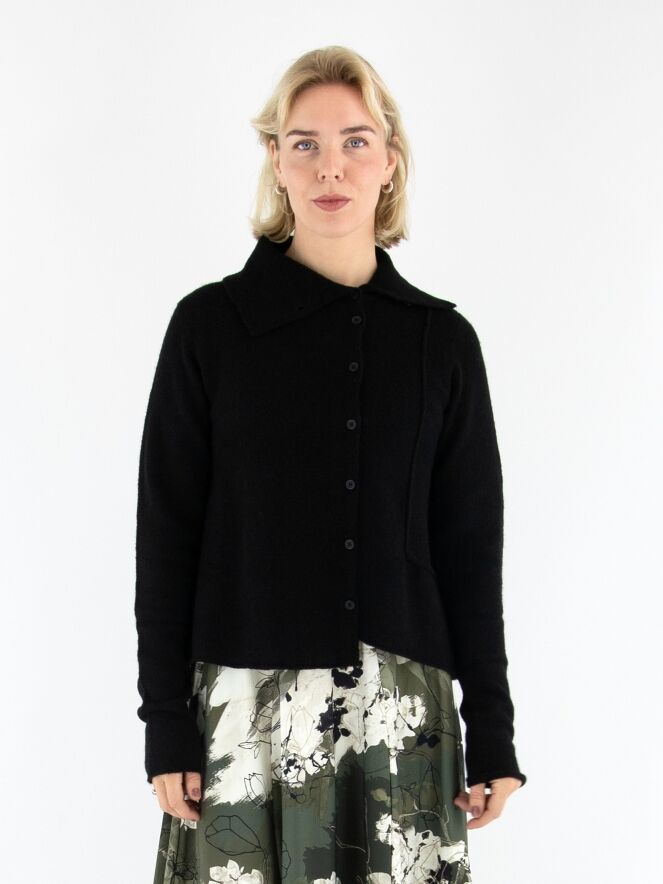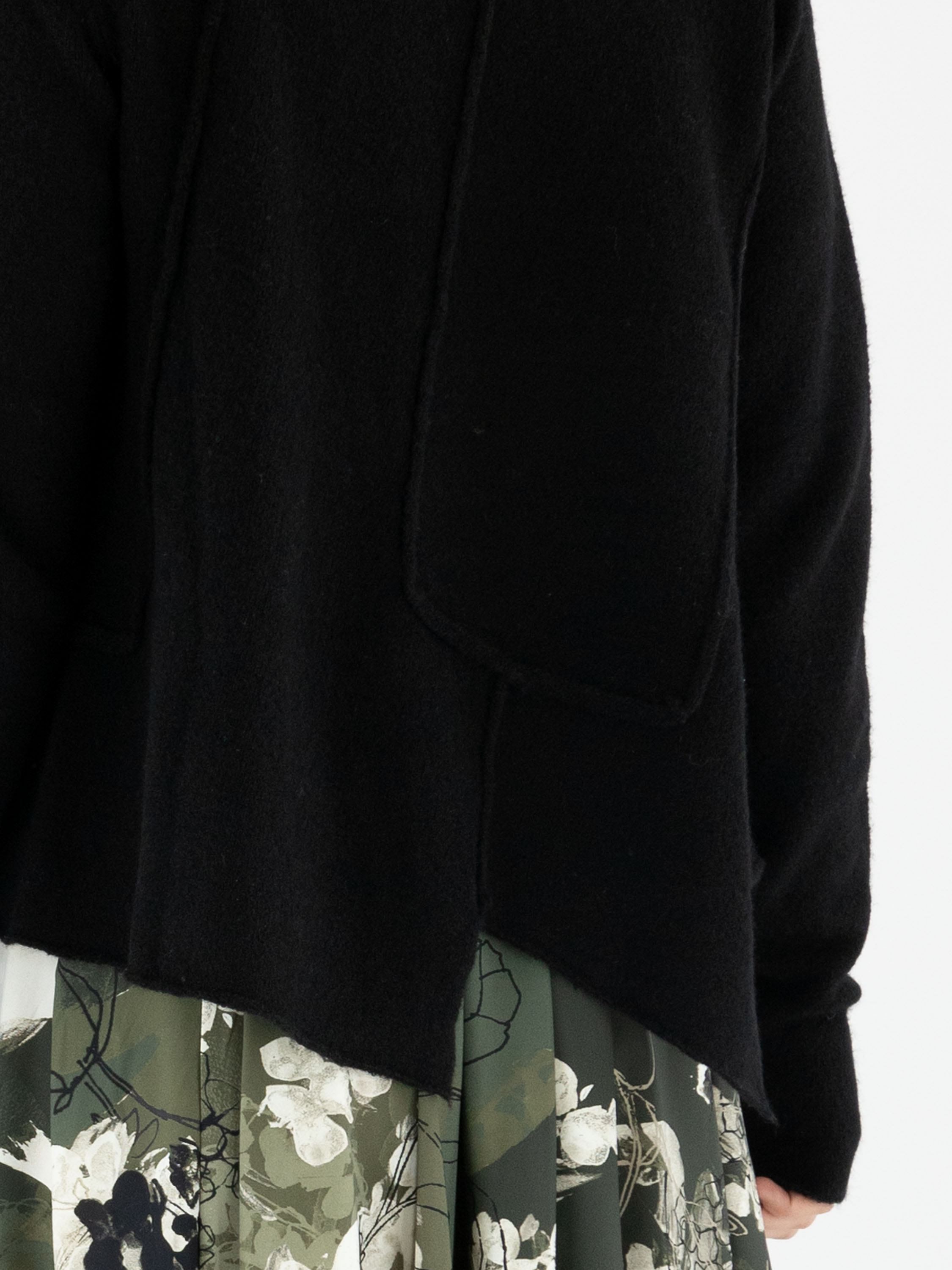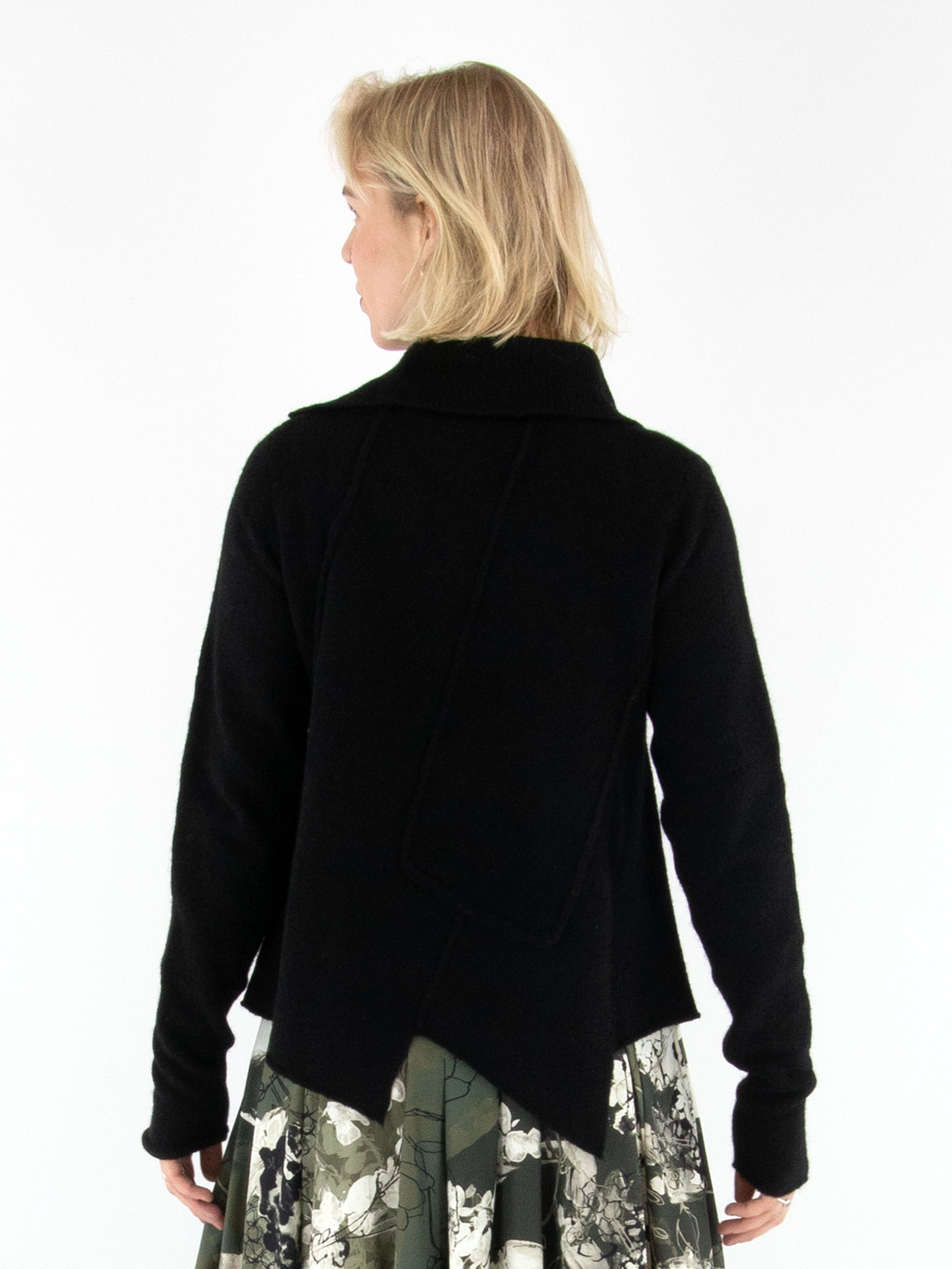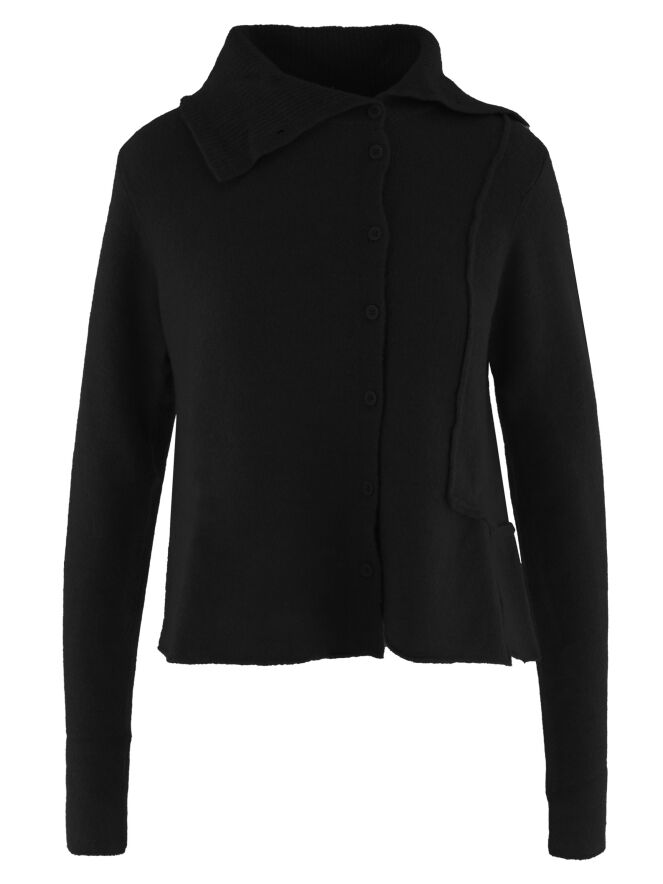Gilet de Rundholz Black Label en noir. L’avant et l’arrière présentent plusieurs coutures inversées. Le col roulé tombant est finement côtelé et l’ourlet est coupé de façon asymétrique. Ce gilet doit être lavé à la main.