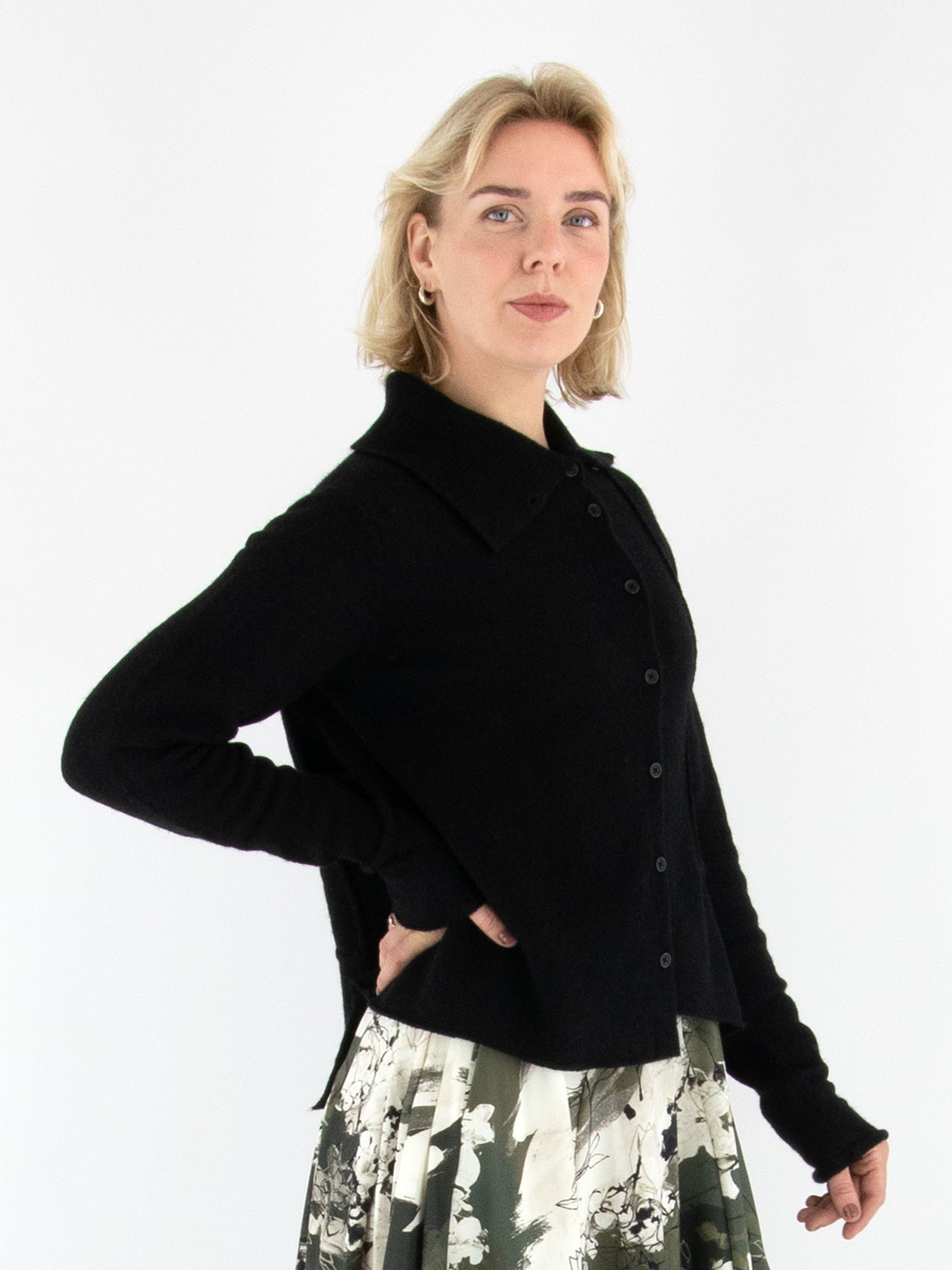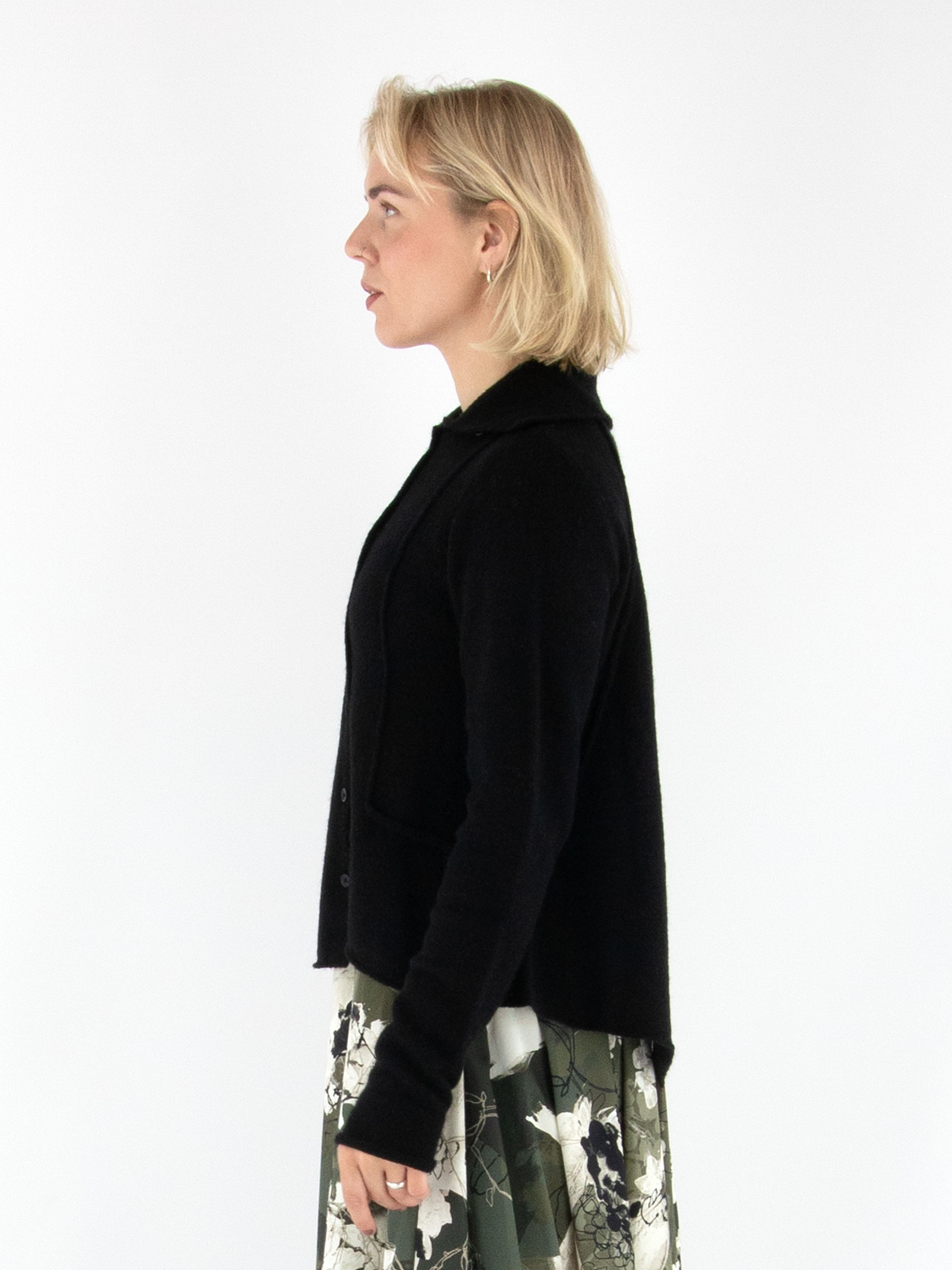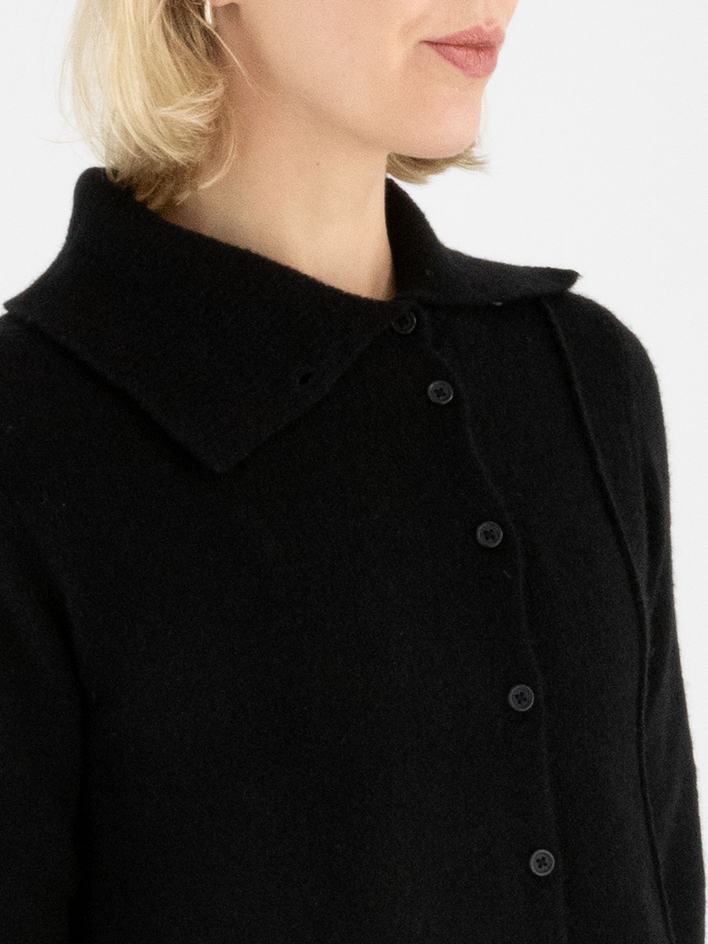 Gilet de Rundholz Black Label en noir. L’avant et l’arrière présentent plusieurs coutures inversées. Le col roulé tombant est finement côtelé et l’ourlet est coupé de façon asymétrique. Ce gilet doit être lavé à la main.