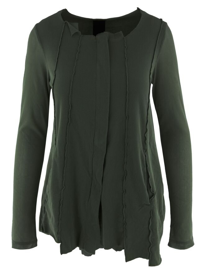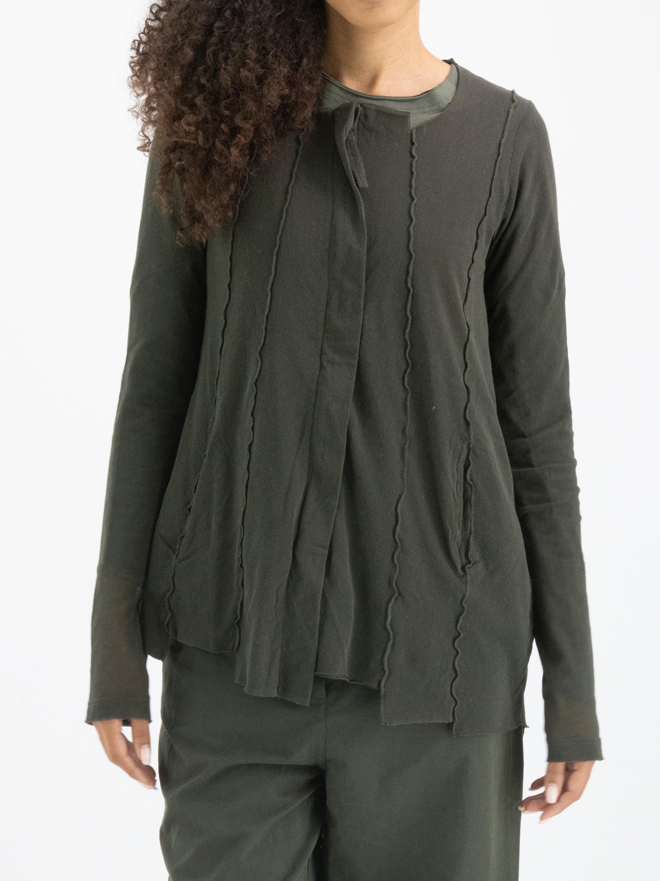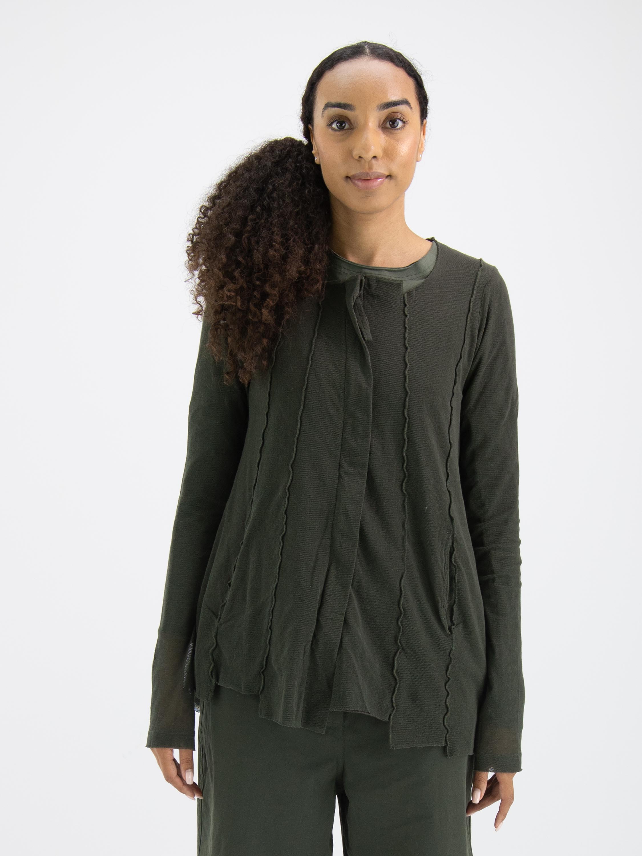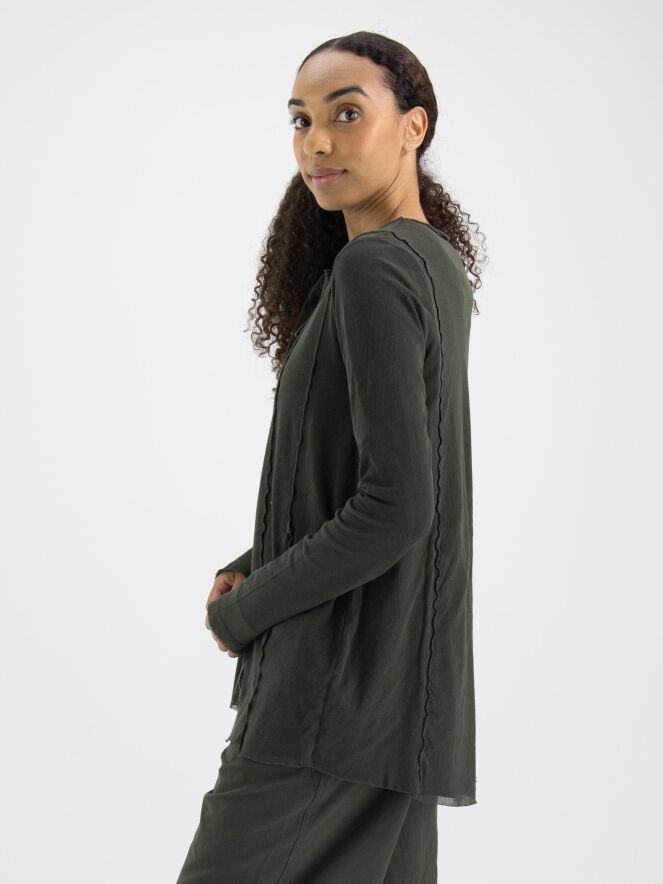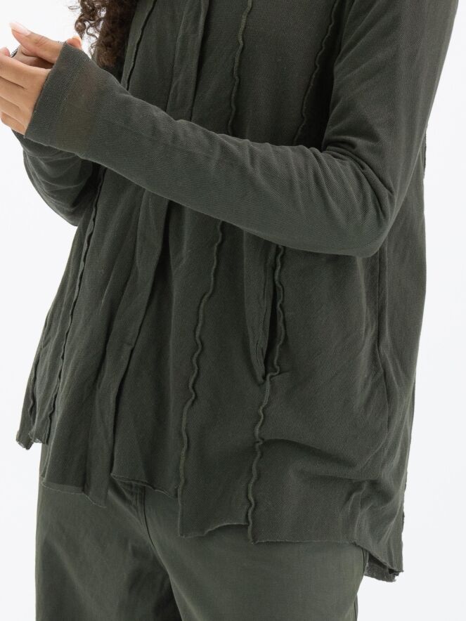 Un gilet de Rundholz Black Label de couleur kaki. Le gilet est recouvert d'un tissu transparent en voile qui se révèle magnifiquement dans les manches longues. Depuis l'encolure ronde irrégulière, plusieurs coutures inversées descendent. Ce gilet peut être lavé à 30 degrés.
