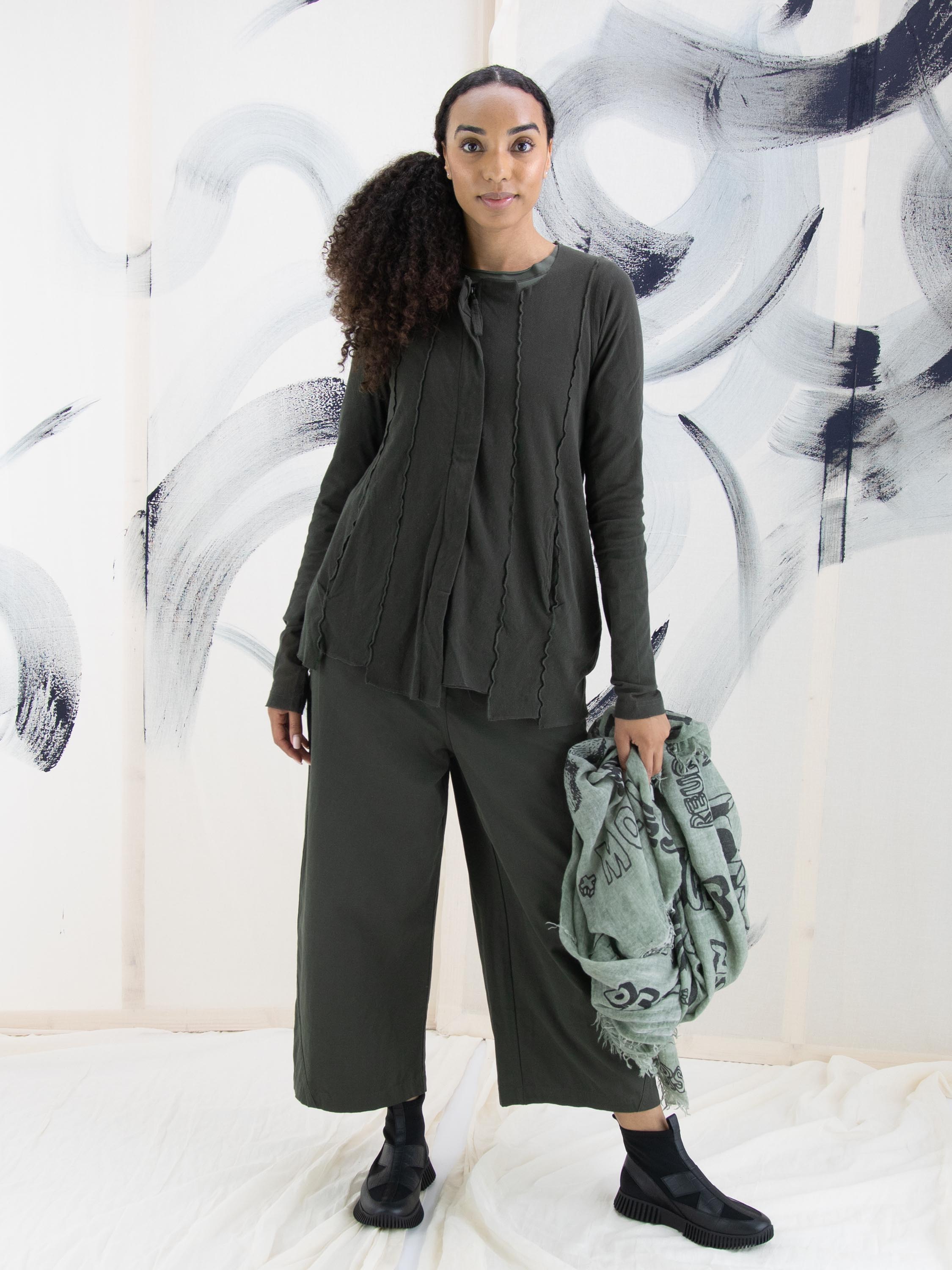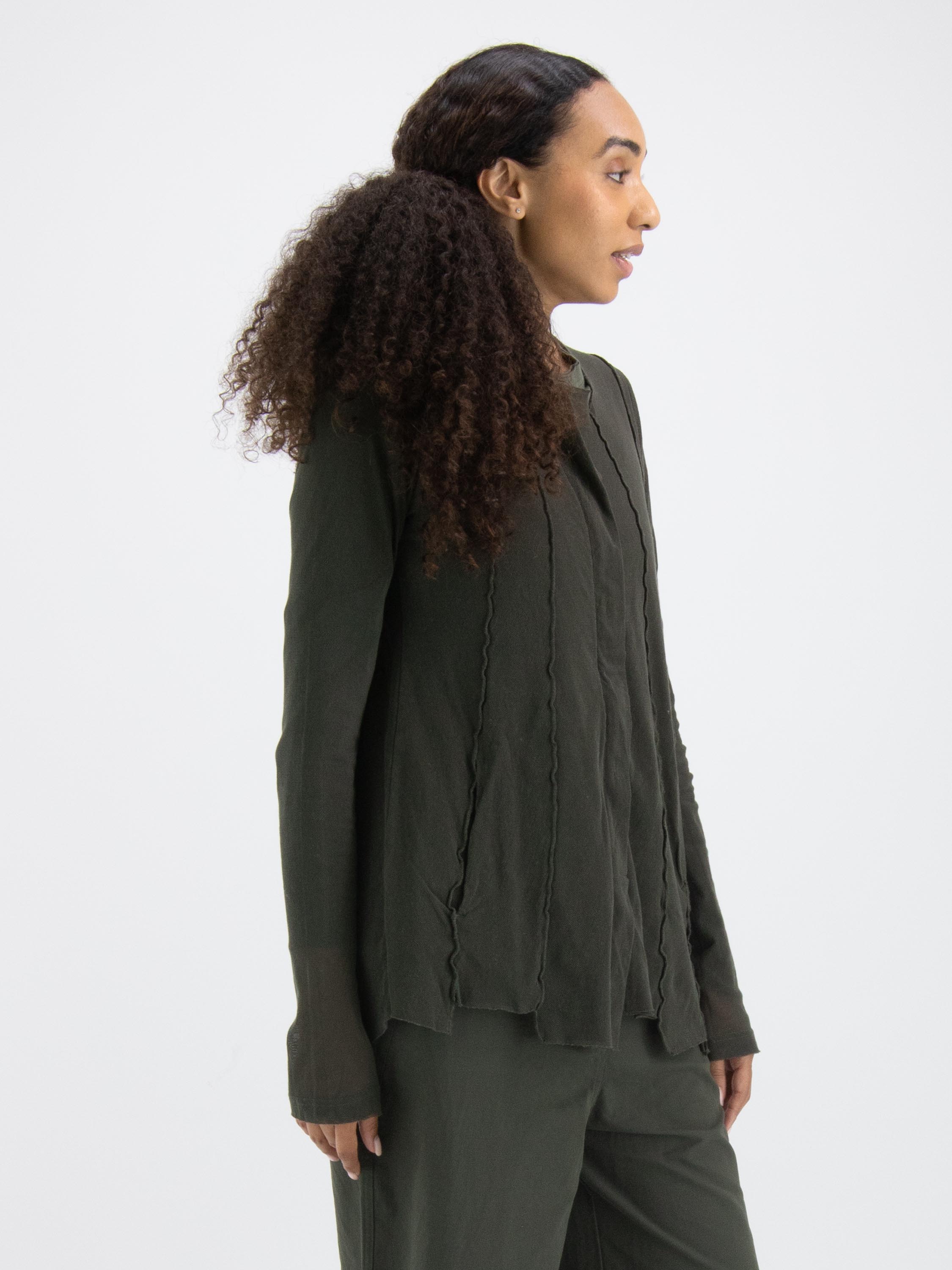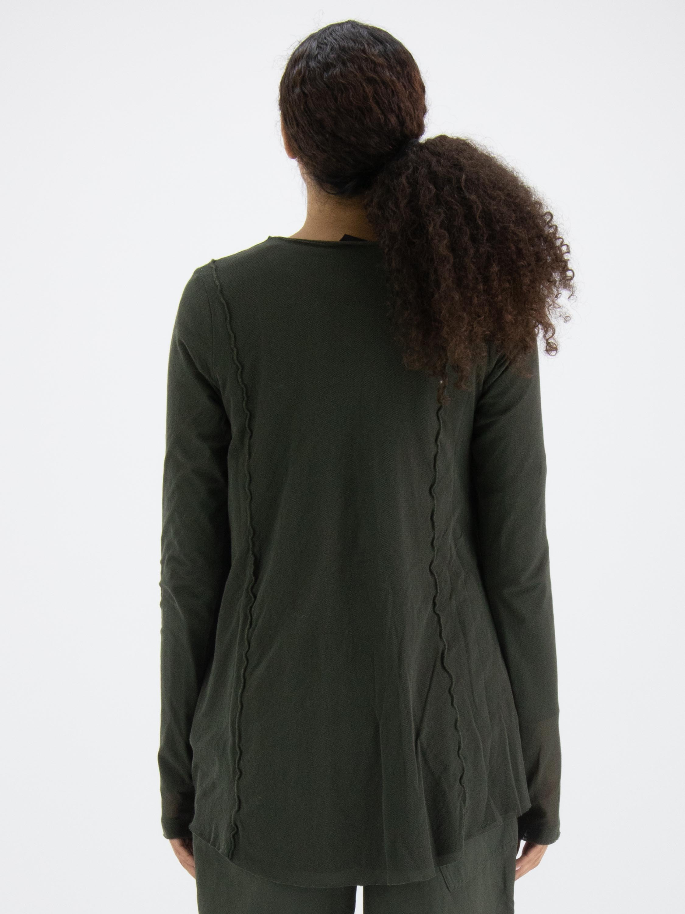 Un gilet de Rundholz Black Label de couleur kaki. Le gilet est recouvert d'un tissu transparent en voile qui se révèle magnifiquement dans les manches longues. Depuis l'encolure ronde irrégulière, plusieurs coutures inversées descendent. Ce gilet peut être lavé à 30 degrés.
