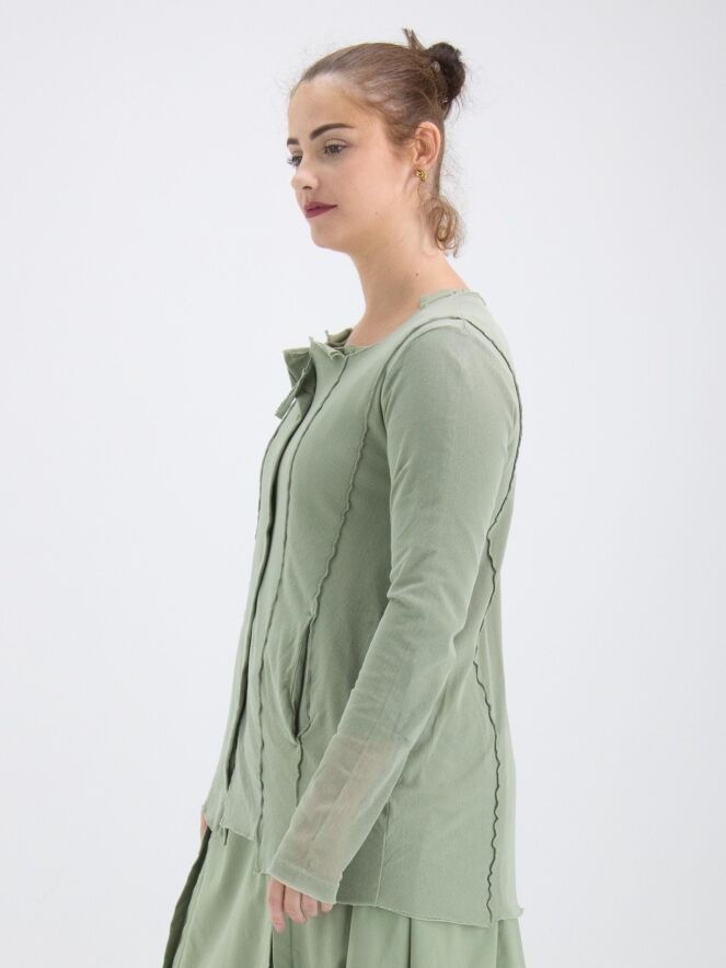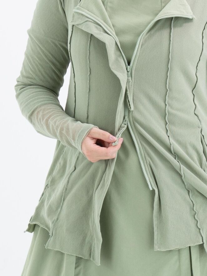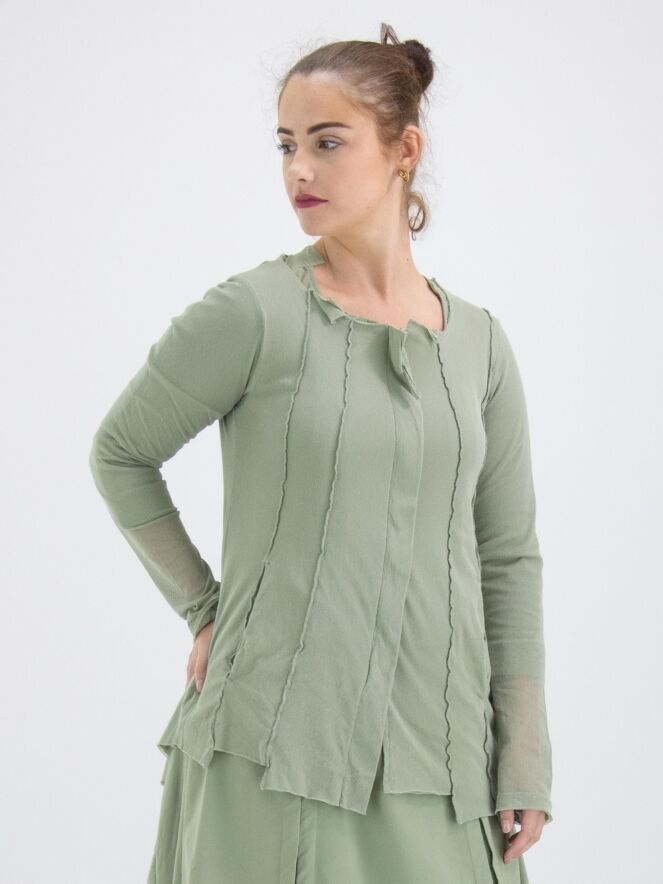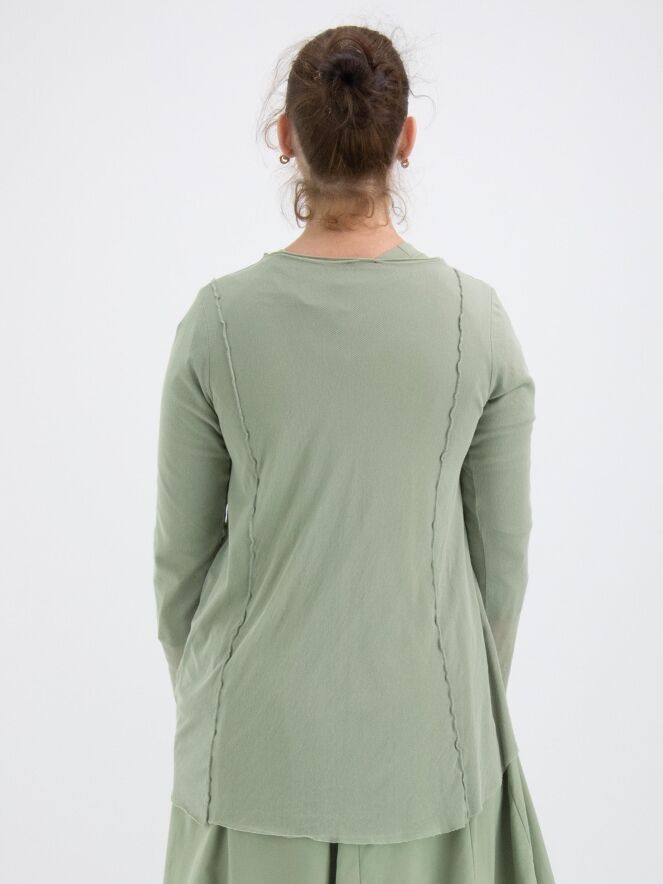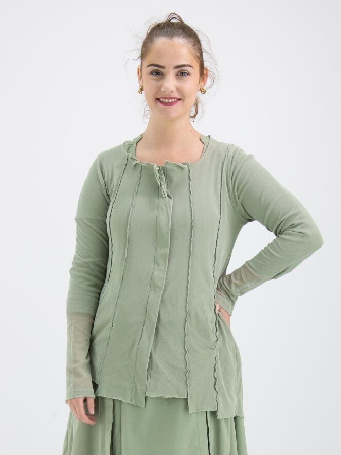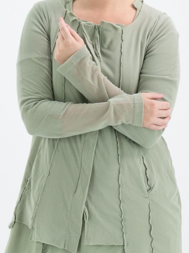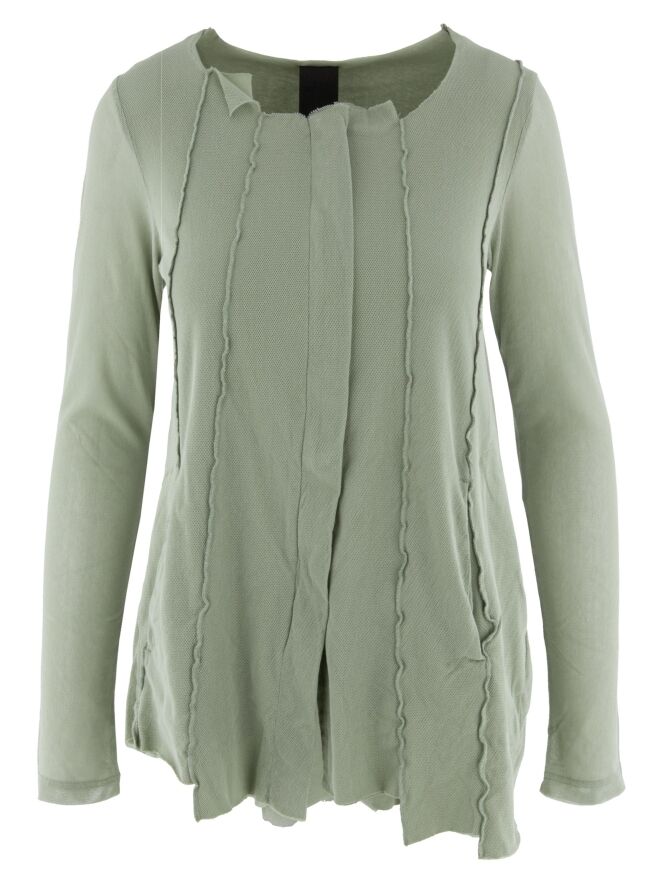Un gilet de Rundholz Black Label de couleur vert olive doux. Le gilet est recouvert d'un voile transparent qui ressort magnifiquement dans les manches longues. Depuis l'encolure ronde irrégulière, plusieurs coutures inversées descendent. Ce gilet peut être lavé à 30 degrés.