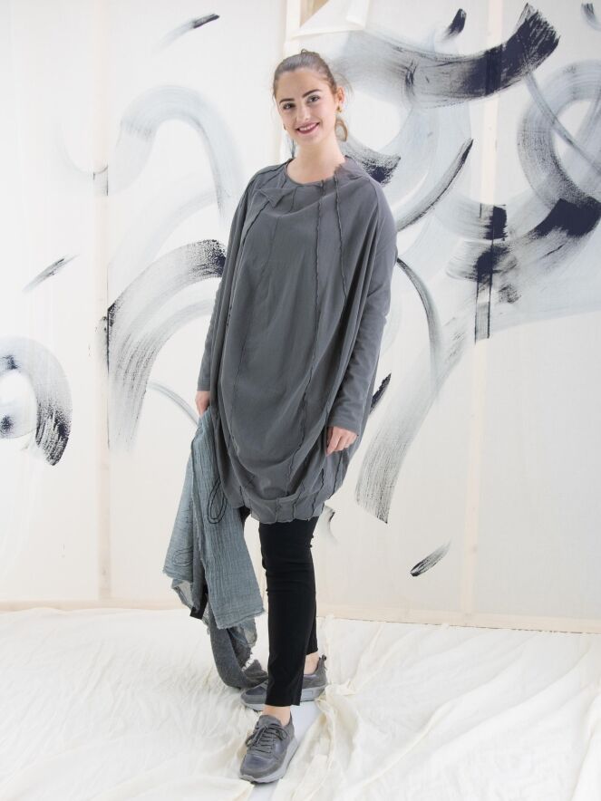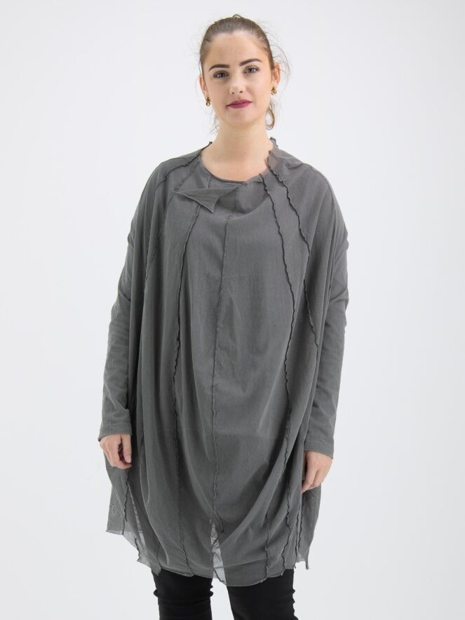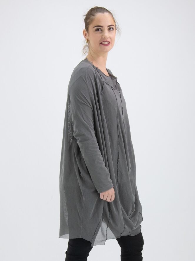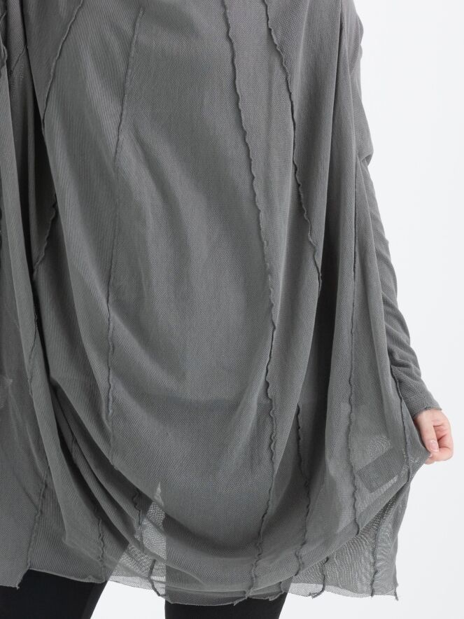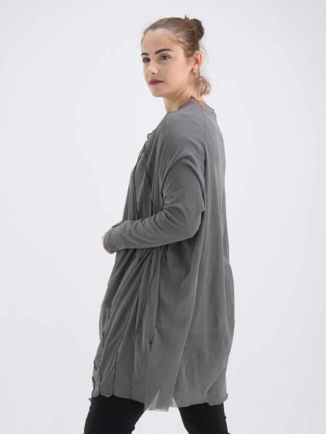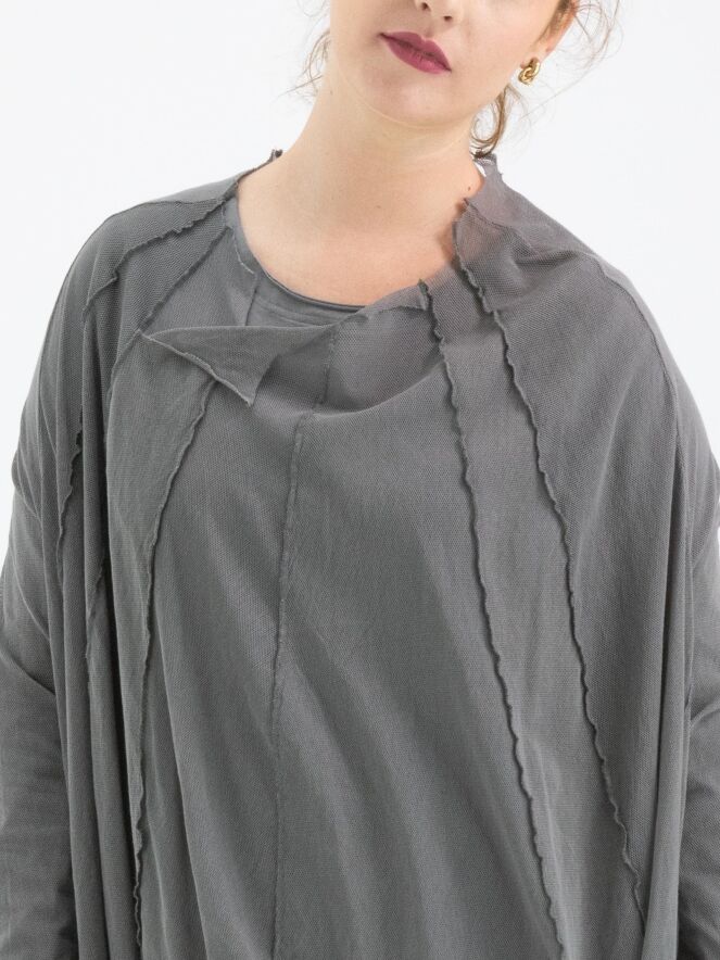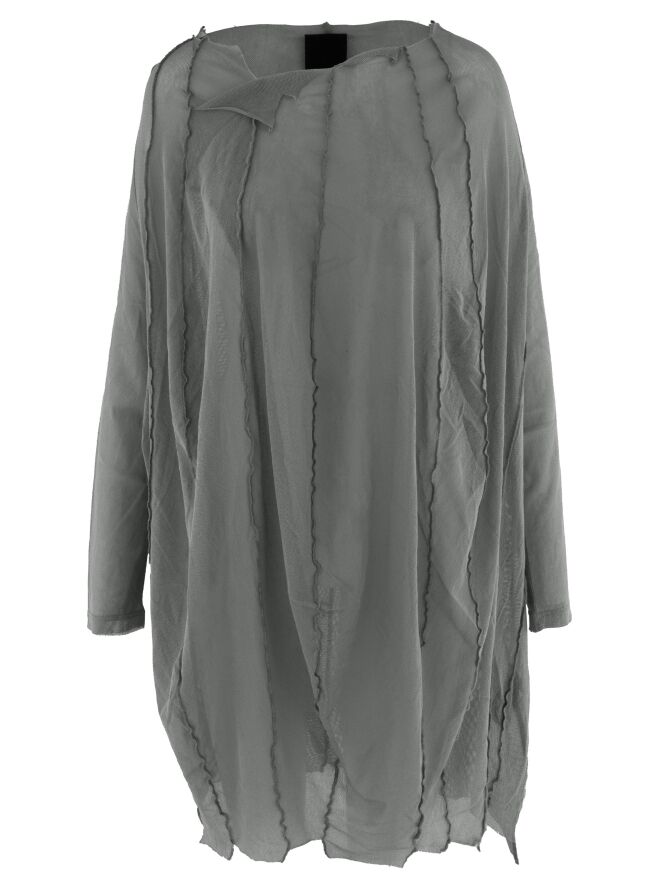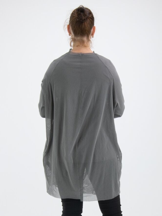 Un t-shirt transparent de Rundholz Black Label de couleur gris-vert foncé. Depuis le large col rond non fini, plusieurs coutures inversées descendent. Le t-shirt a des manches longues et peut être lavé à 30 degrés.