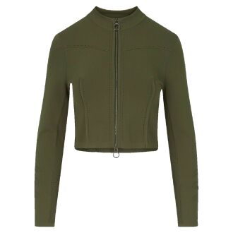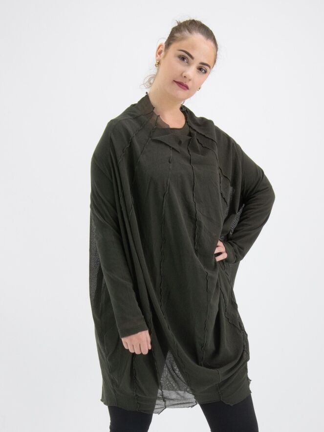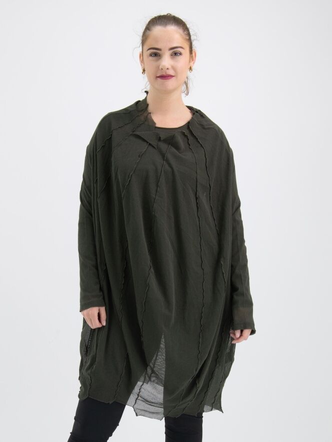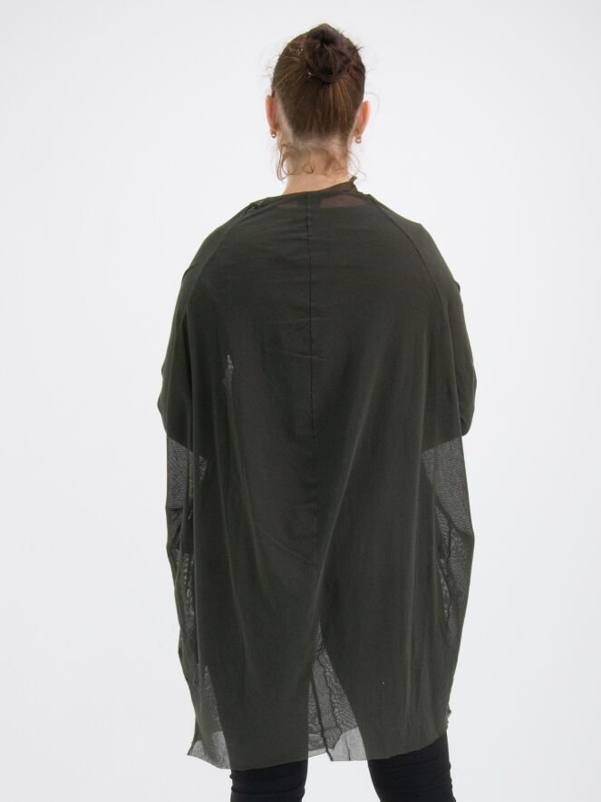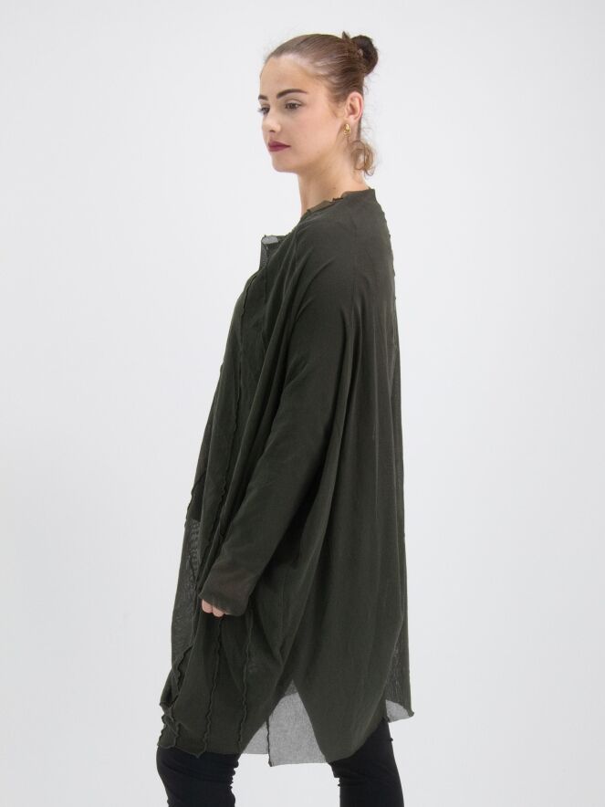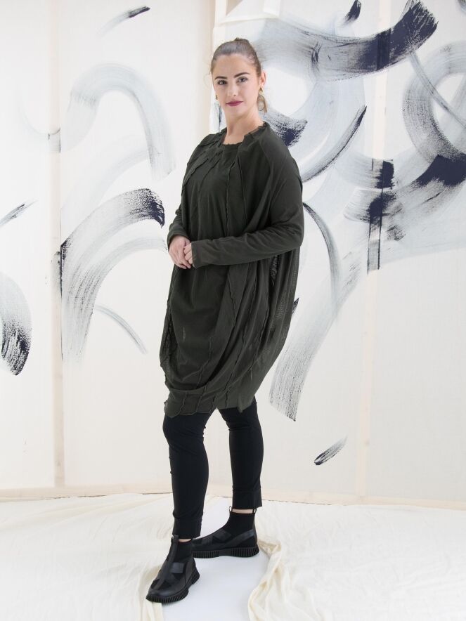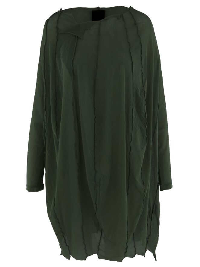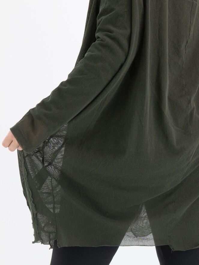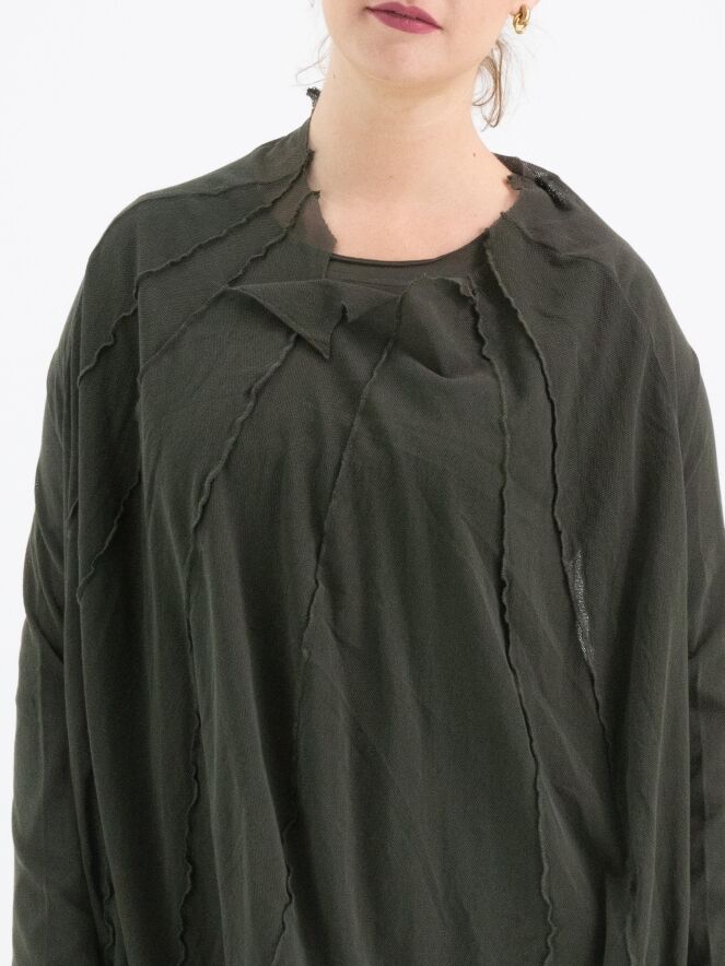 Un t-shirt transparent de Rundholz Black Label de couleur kaki. Depuis l'encolure ronde large et non finie, plusieurs coutures inversées descendent vers le bas. Le t-shirt a des manches longues et peut être lavé à 30 degrés.