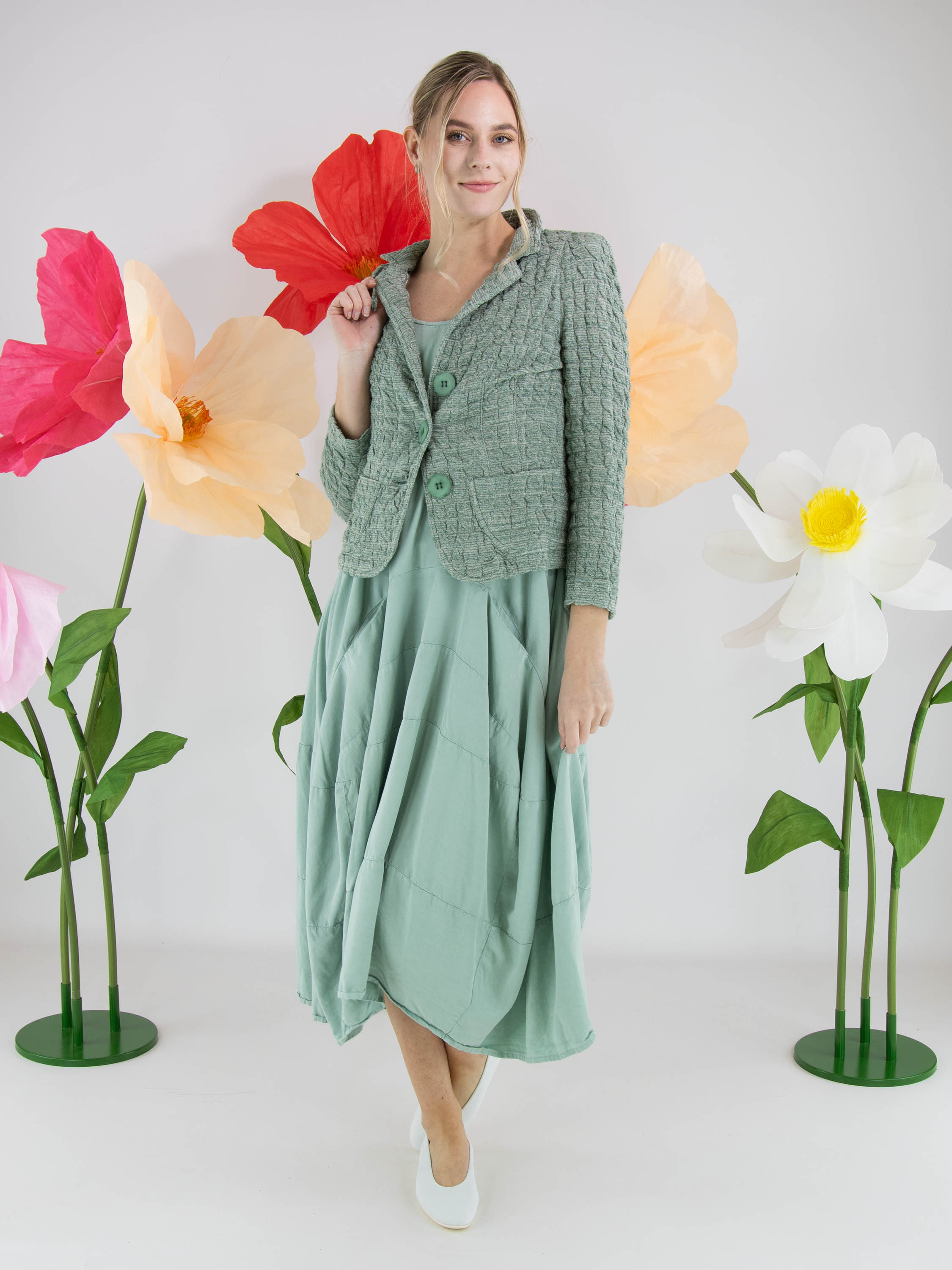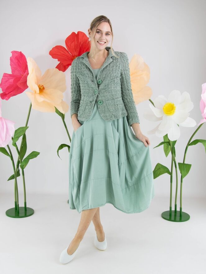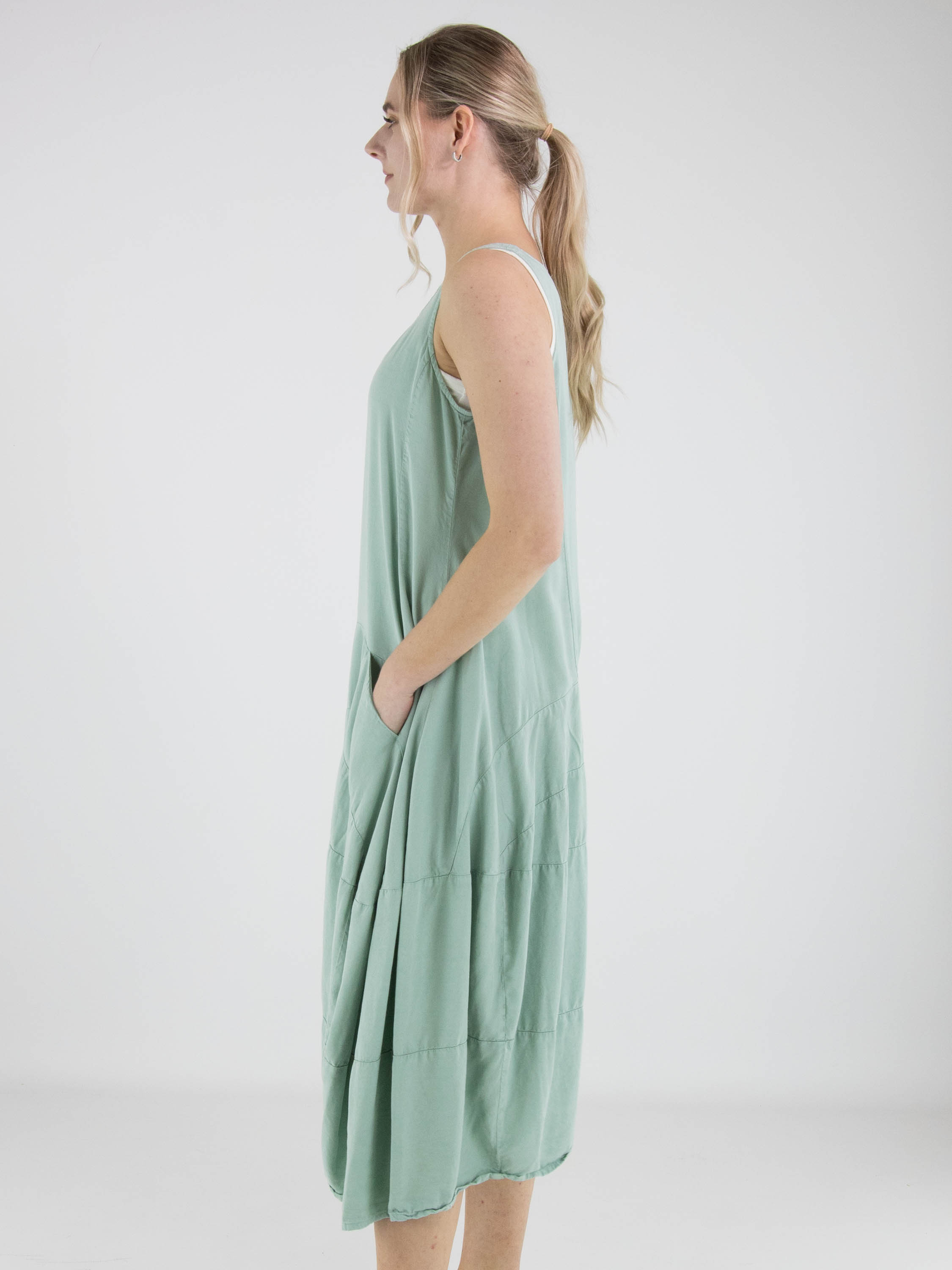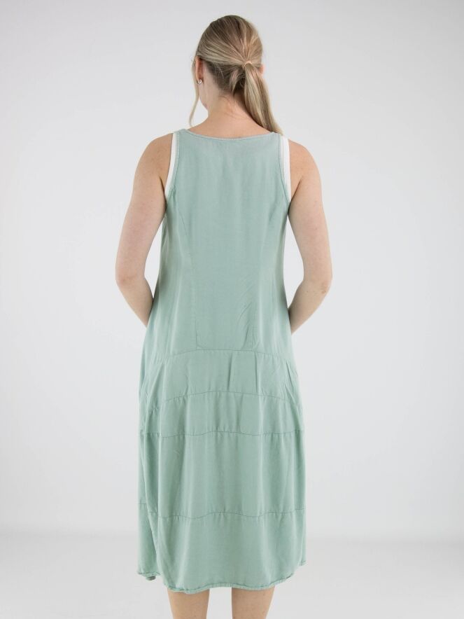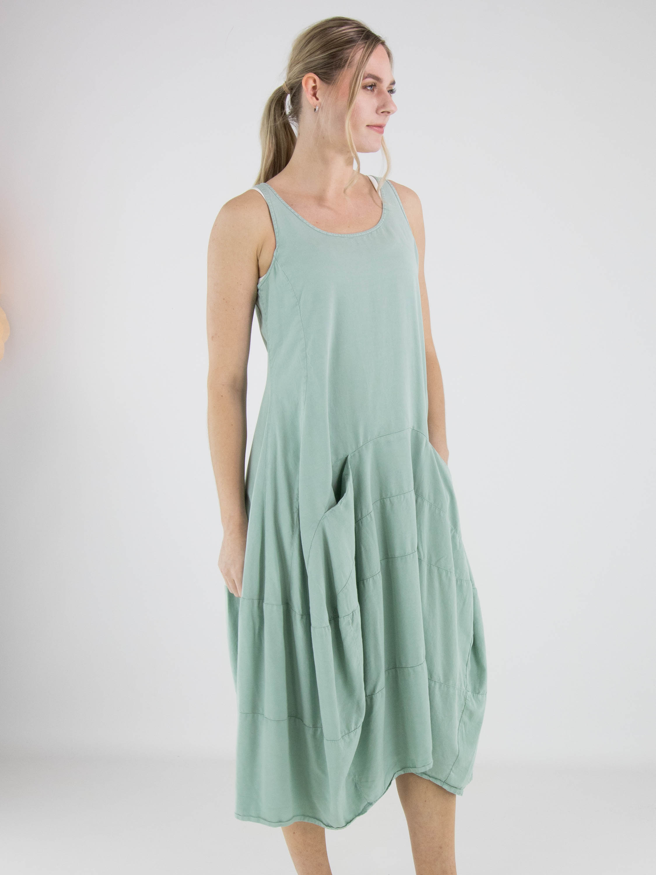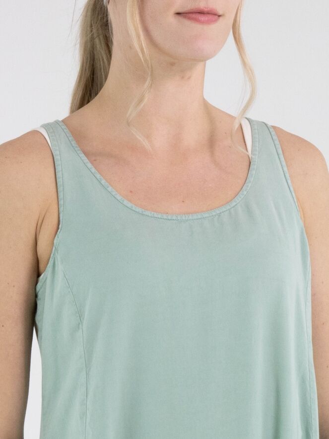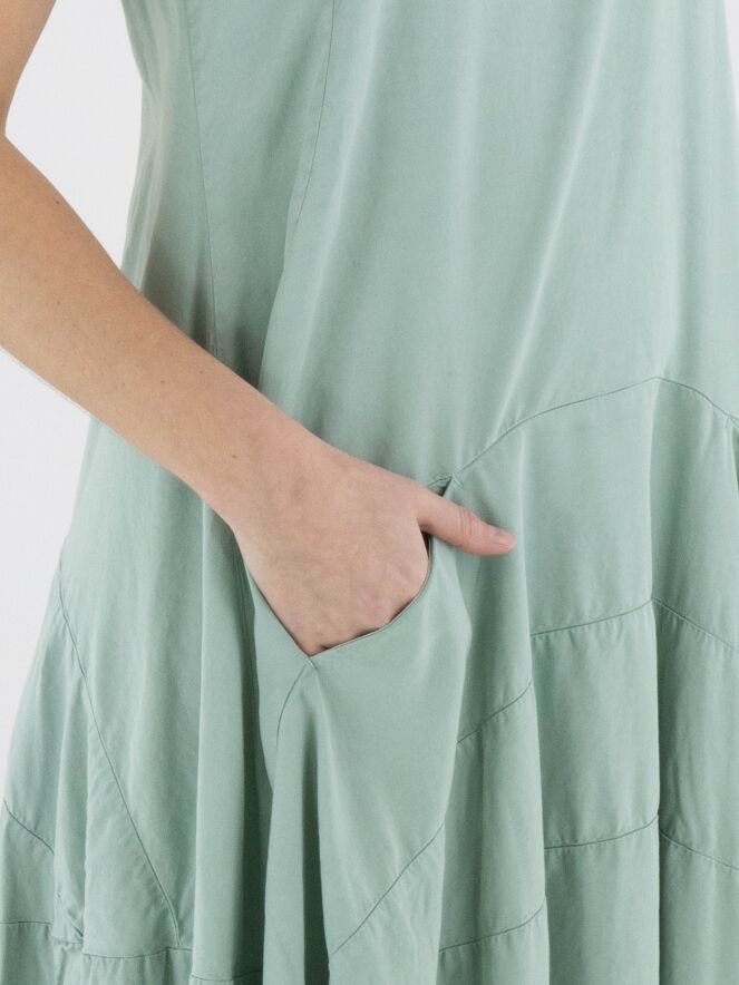 Robe sans manches de Rundholz Black Label dans une teinte vert menthe fraîche. Conçue en légère ligne A, elle présente plusieurs coutures horizontales à partir de la taille, créant une subtile forme ballon. Des poches latérales discrètes sont intégrées à hauteur de taille. Cette robe de créateur exclusive peut être lavée à 30 degrés.
