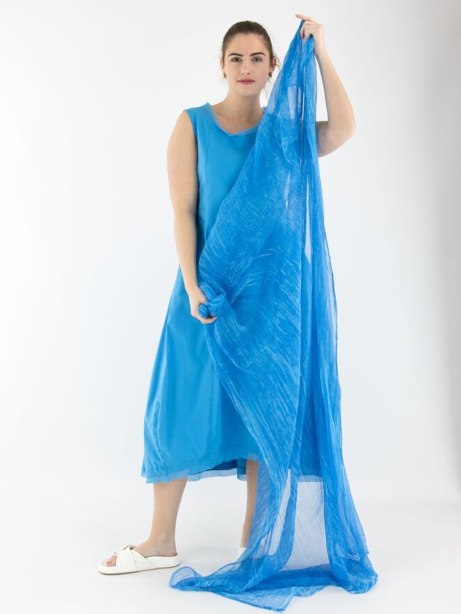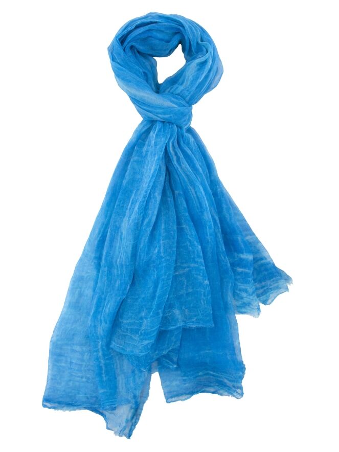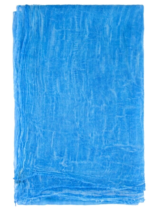 Une écharpe légèrement transparente et chinée dans plusieurs nuances de bleu éclatant. Les bords de l’écharpe sont délicatement effilochés. Cette écharpe doit être lavée à la main.