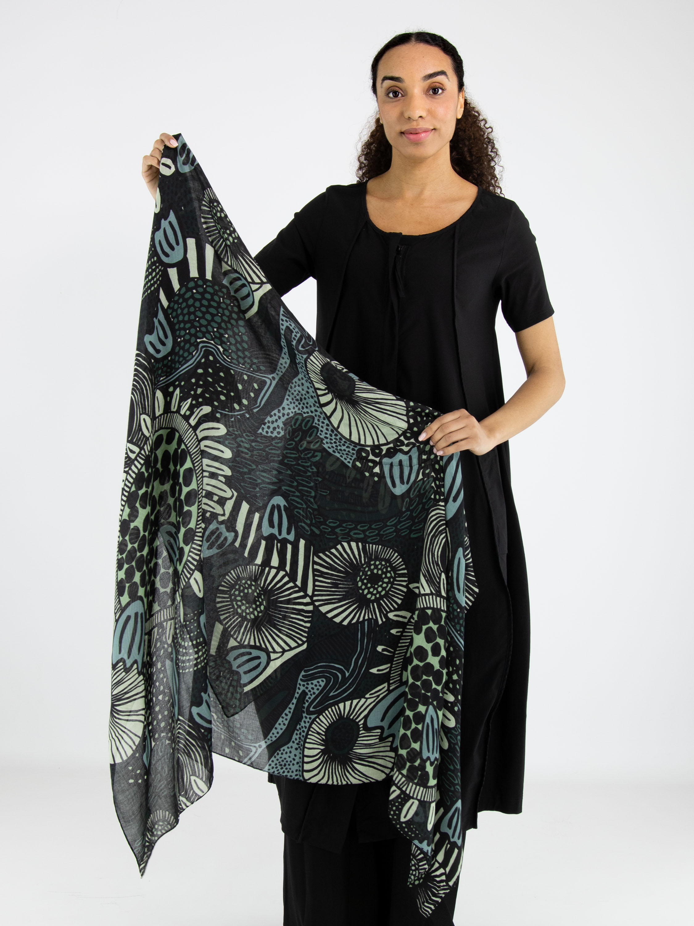 Écharpe légère et légèrement transparente de luxe de Rundholz, ornée d’un imprimé graphique dans des tons de pétrole, blanc crème et noir. Le jeu subtil des couleurs et le motif raffiné confèrent à cette pièce une allure contemporaine et affirmée. Cette écharpe exclusive doit être lavée à la main.