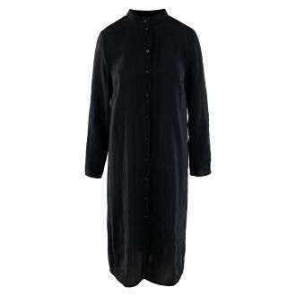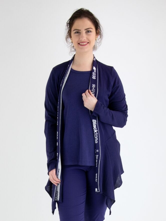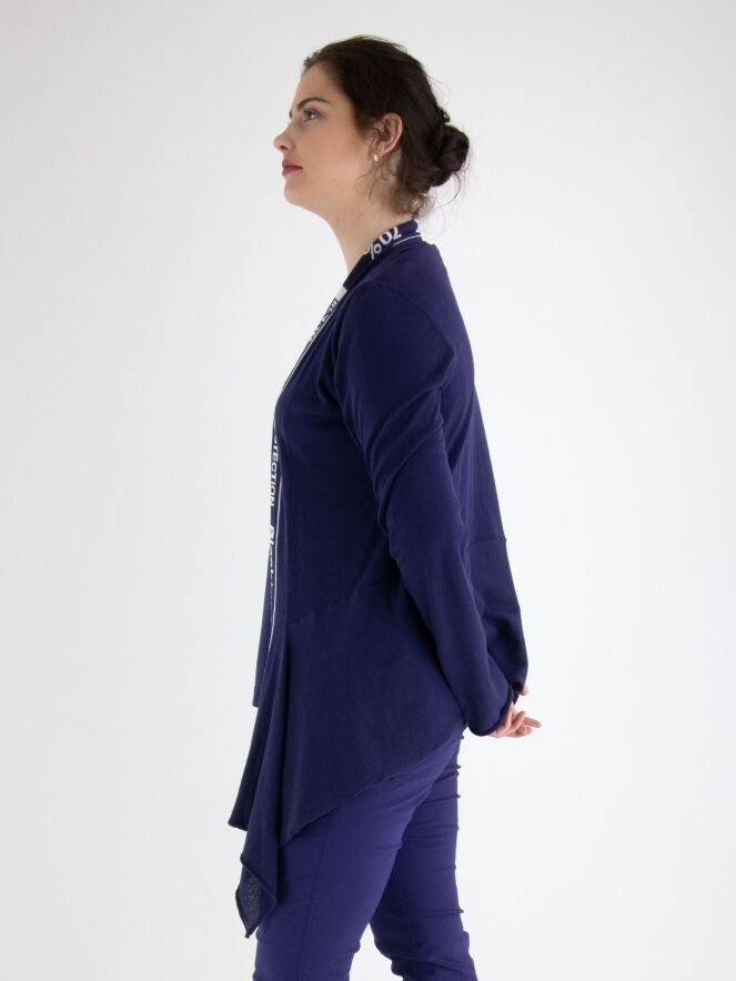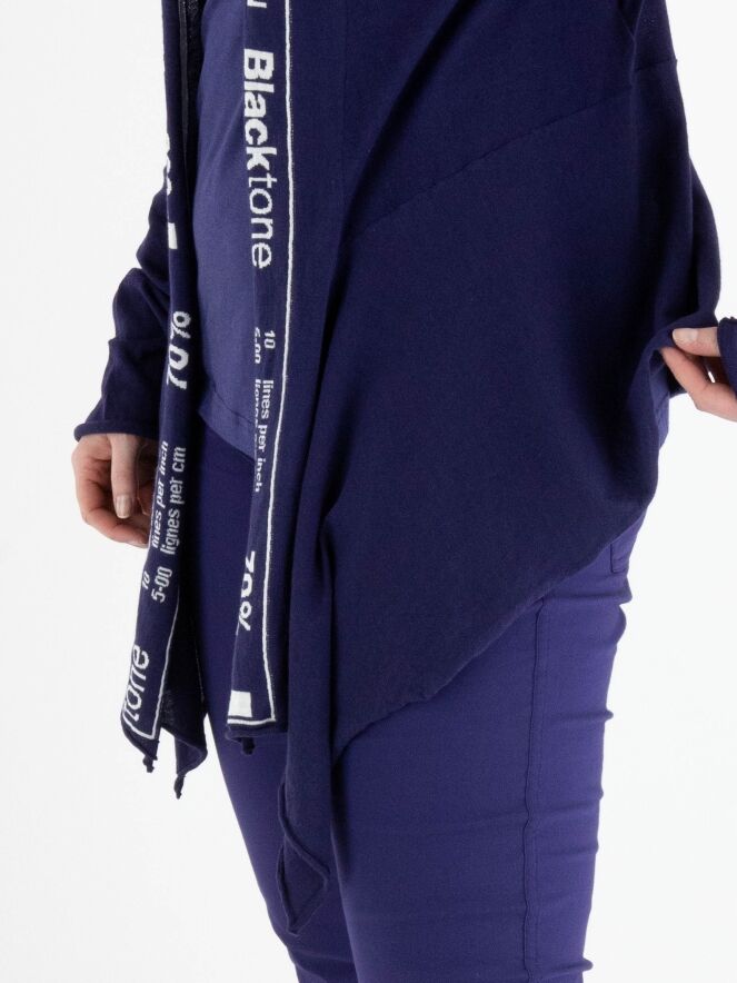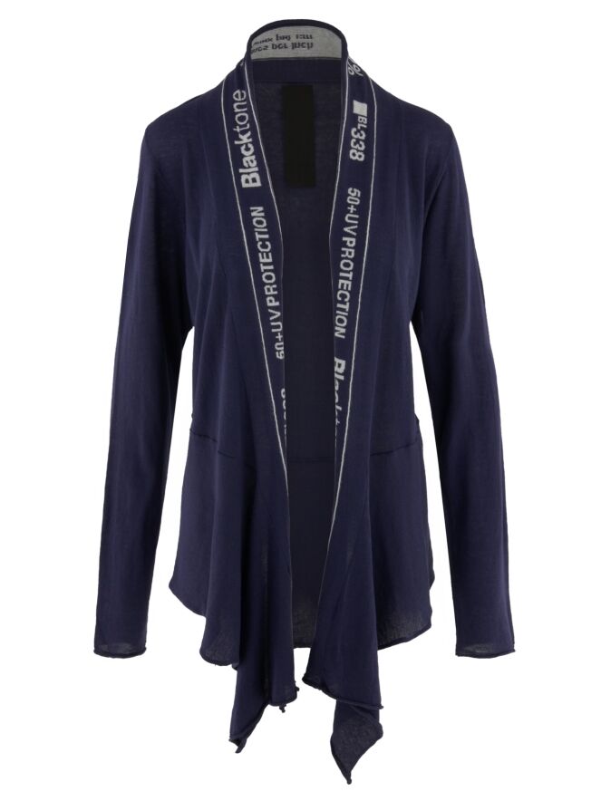 Un gilet léger et transparent de Rundholz Black Label en bleu indigo. Le gilet n'a pas de fermeture, et le long du bord du col, il y a une large bande avec une impression de lettres bleu indigo et blanche s'étendant jusqu'au bas du gilet. Le gilet a des manches longues et peut être lavé à la main.