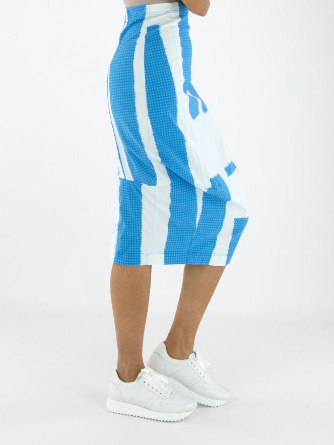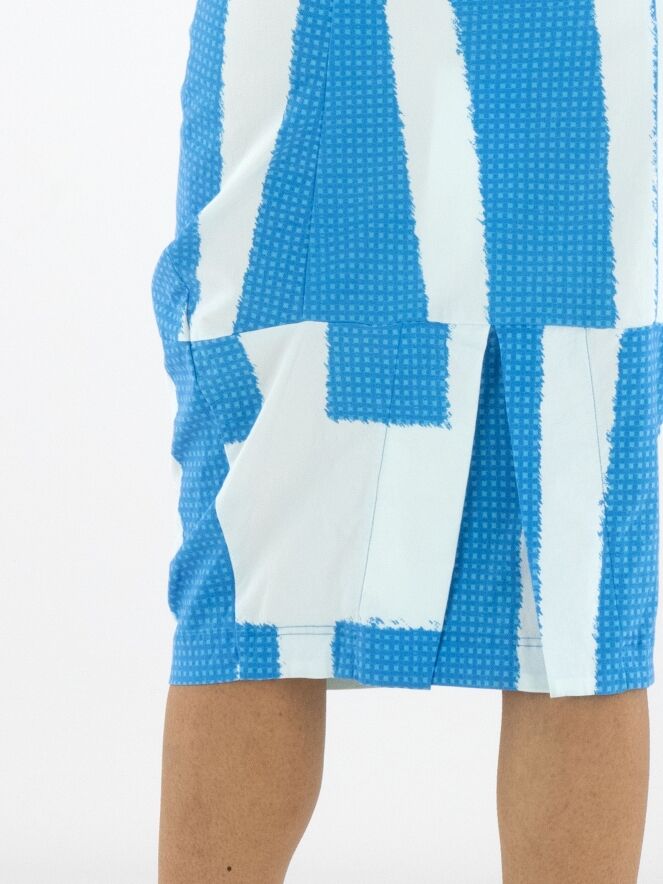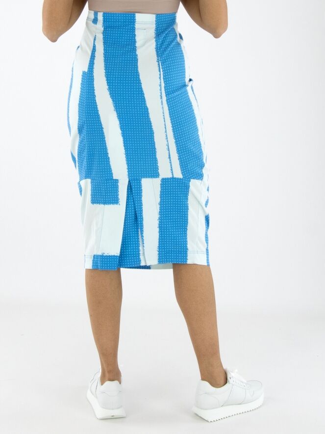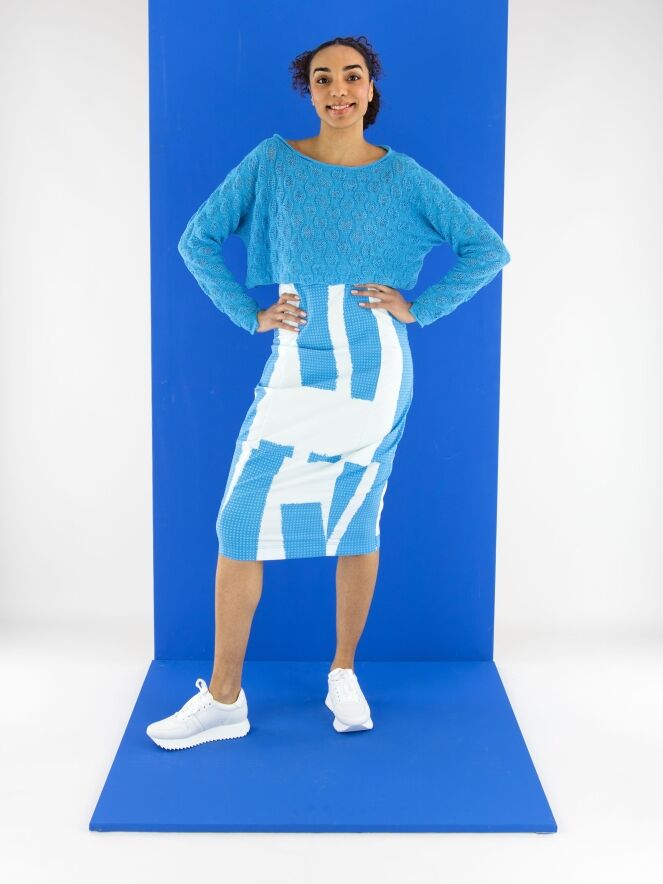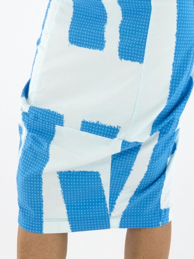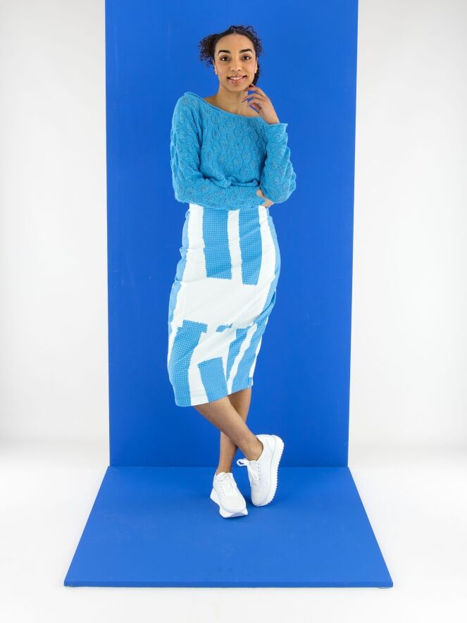 Une jupe de Rundholz Black Label avec un imprimé composé de plusieurs panneaux à motifs de petits carreaux dans des nuances de bleu vif, associés à des parties en uni blanc crème avec une touche subtile de bleu glacé. La taille est élastique. La jupe s’affine vers le bas et n’est pas doublée. Cette jupe peut être lavée à 30 degrés.