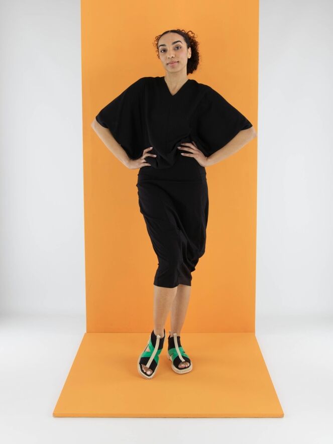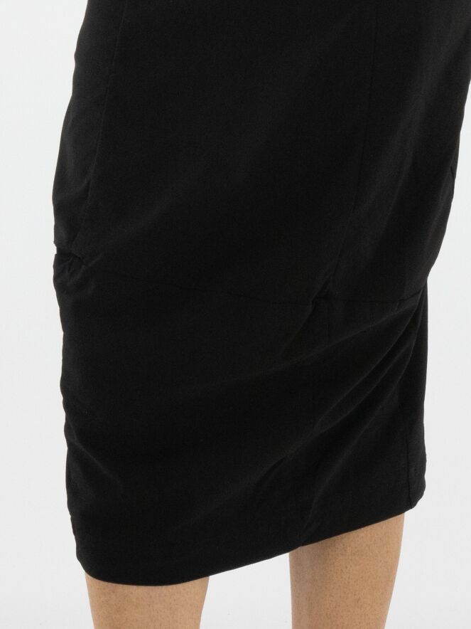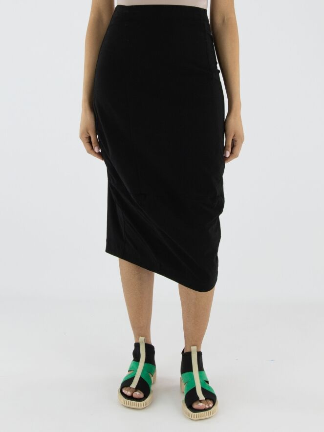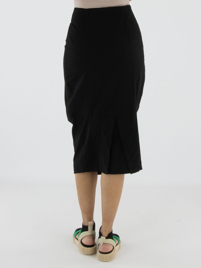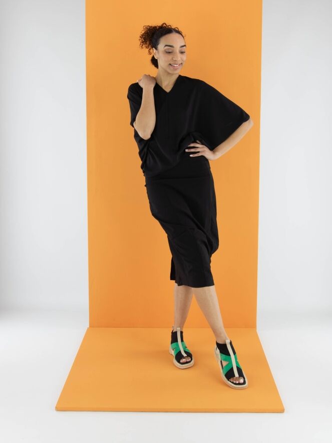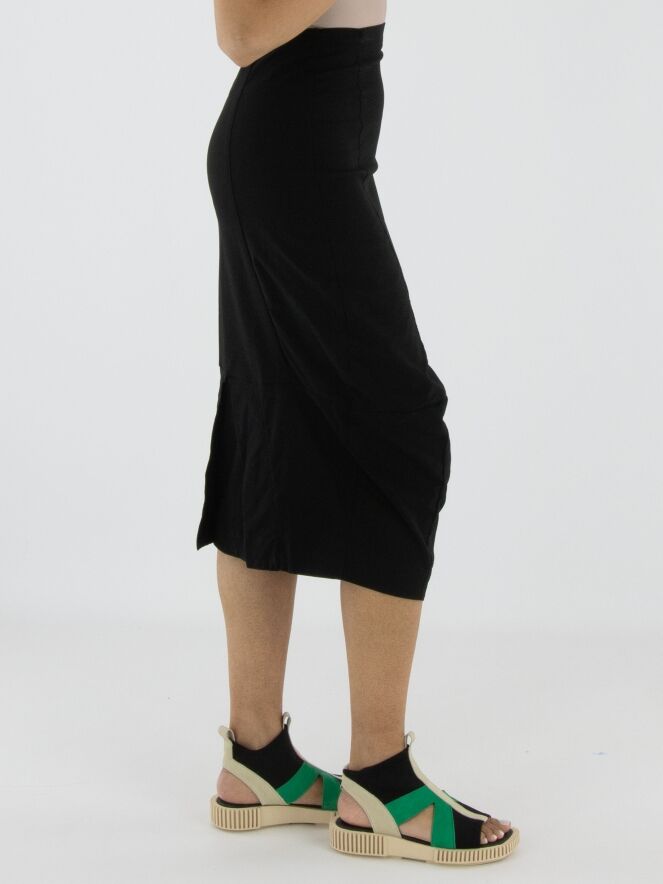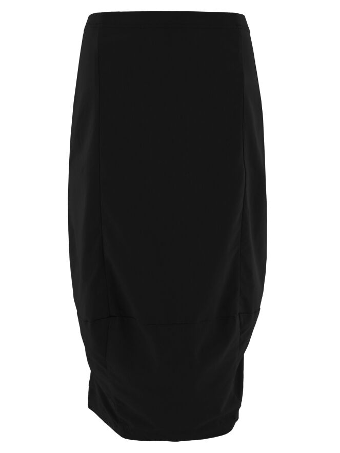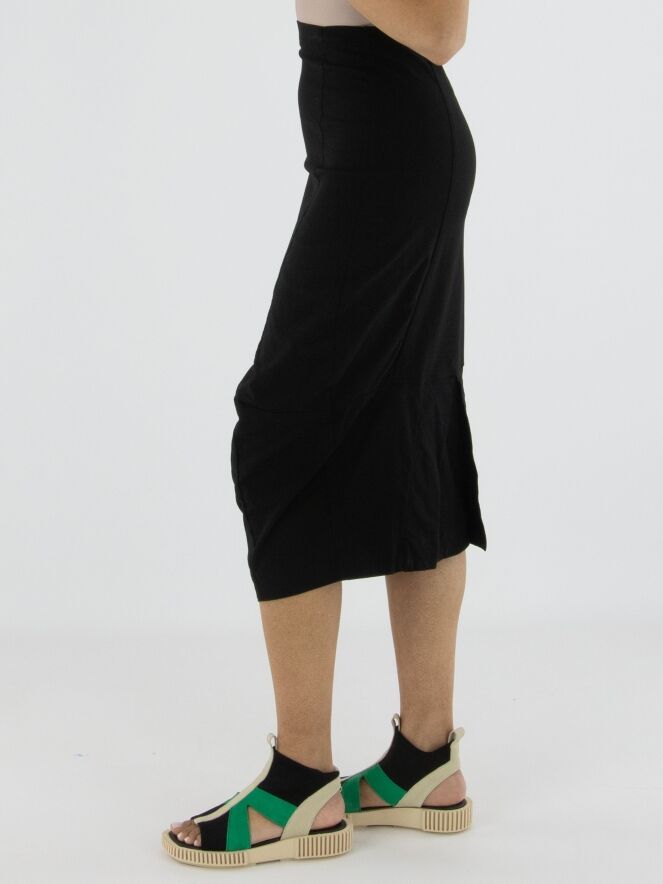 Une jupe de Rundholz Black Label en noir. La taille est élastique. La jupe s’affine vers le bas et n’est pas doublée. Cette jupe peut être lavée à 30 degrés.