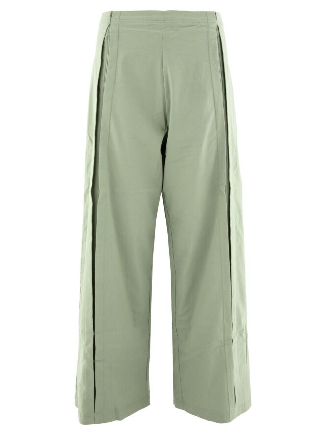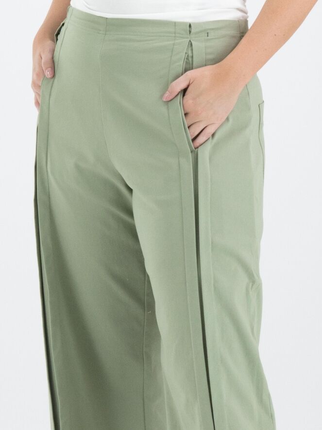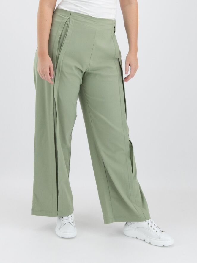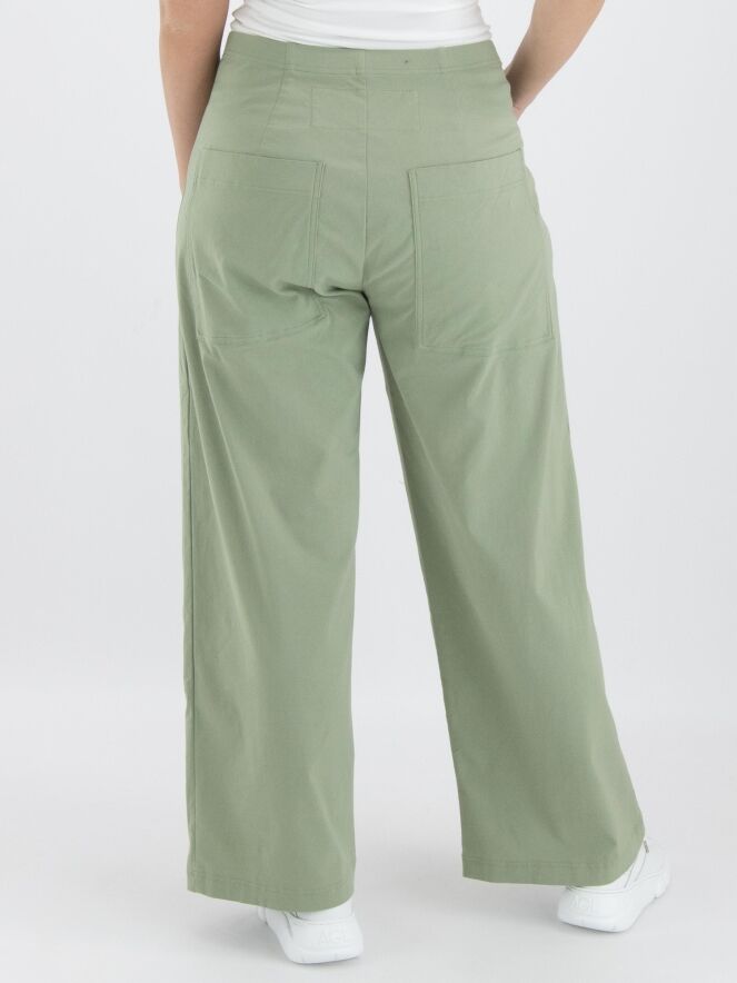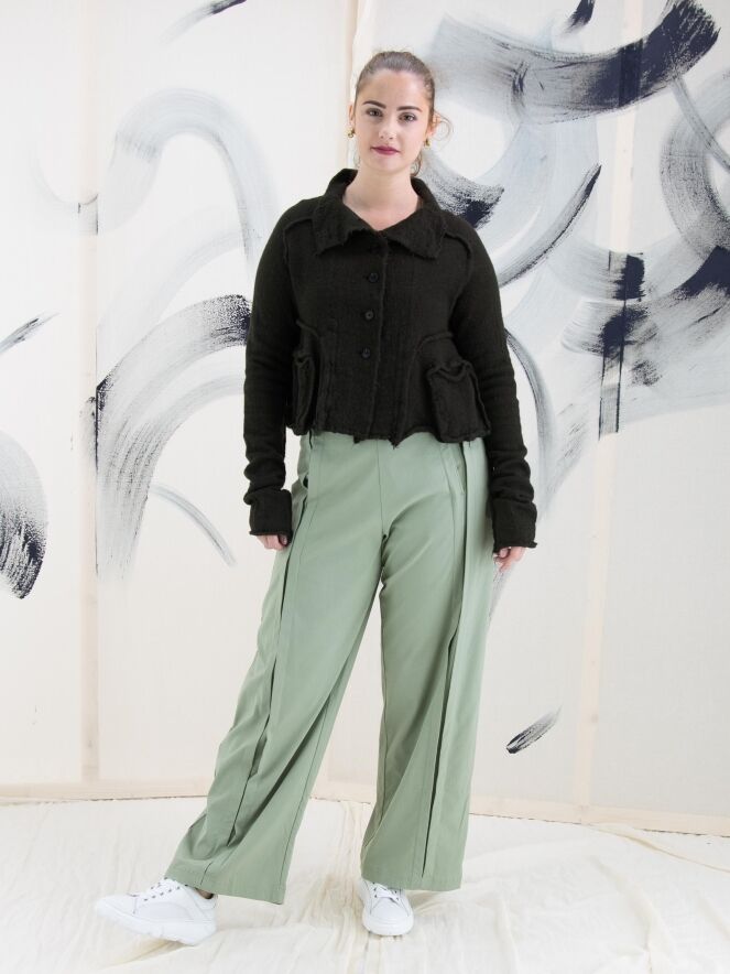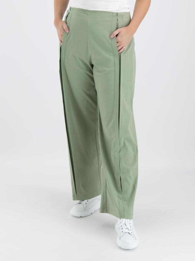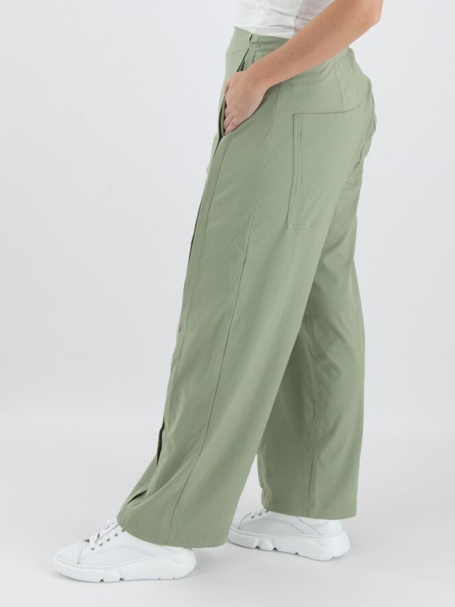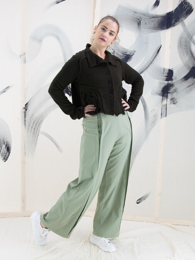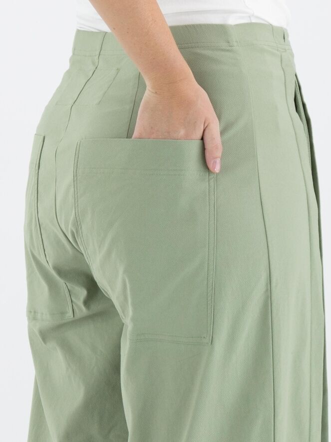 Un pantalon de Rundholz Black Label de couleur olive douce. À l'avant, légèrement décentré, se trouvent deux plis verticaux inversés qui sont ouverts, avec des poches fendues sous la taille. La taille est élastiquée. À l'arrière, il y a de grandes poches spacieuses. Ce pantalon peut être lavé à 30 degrés.