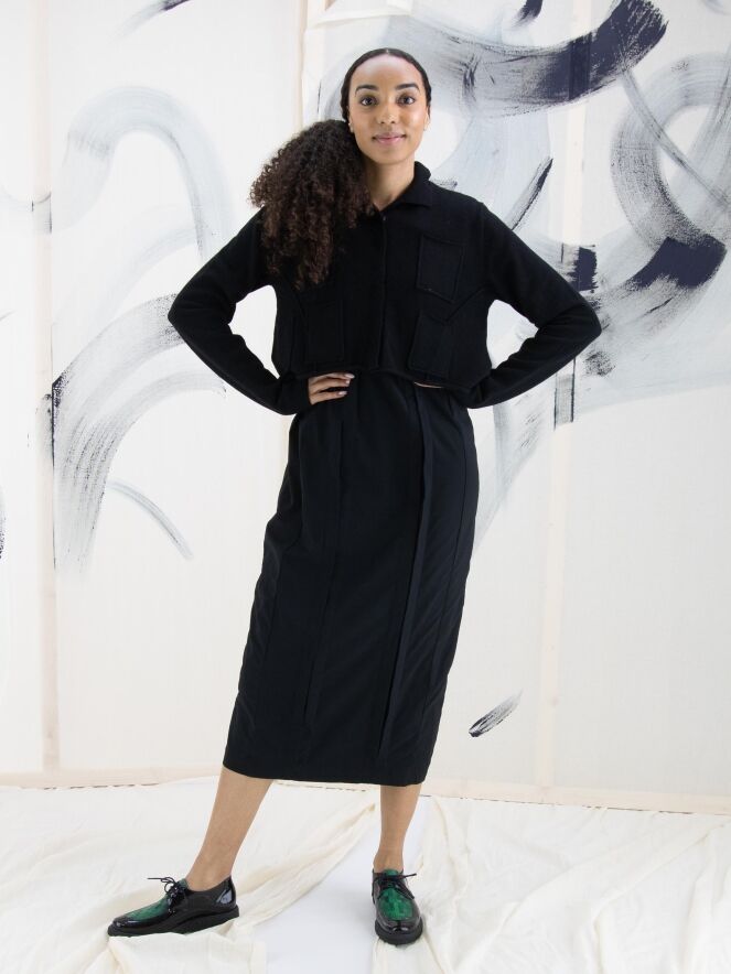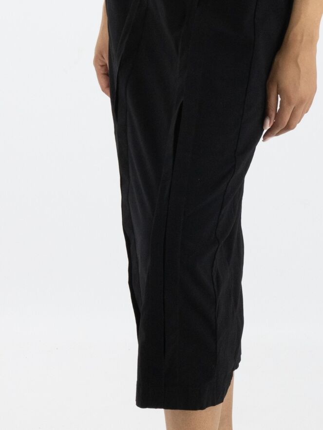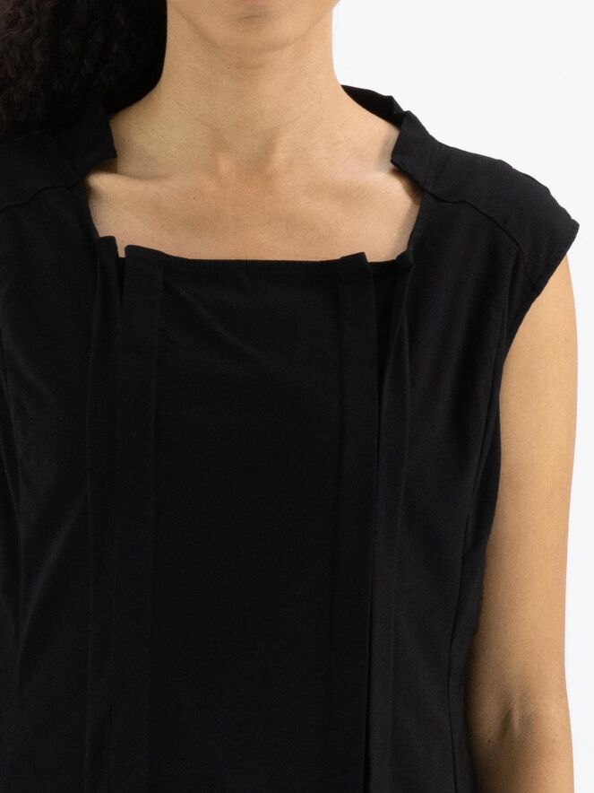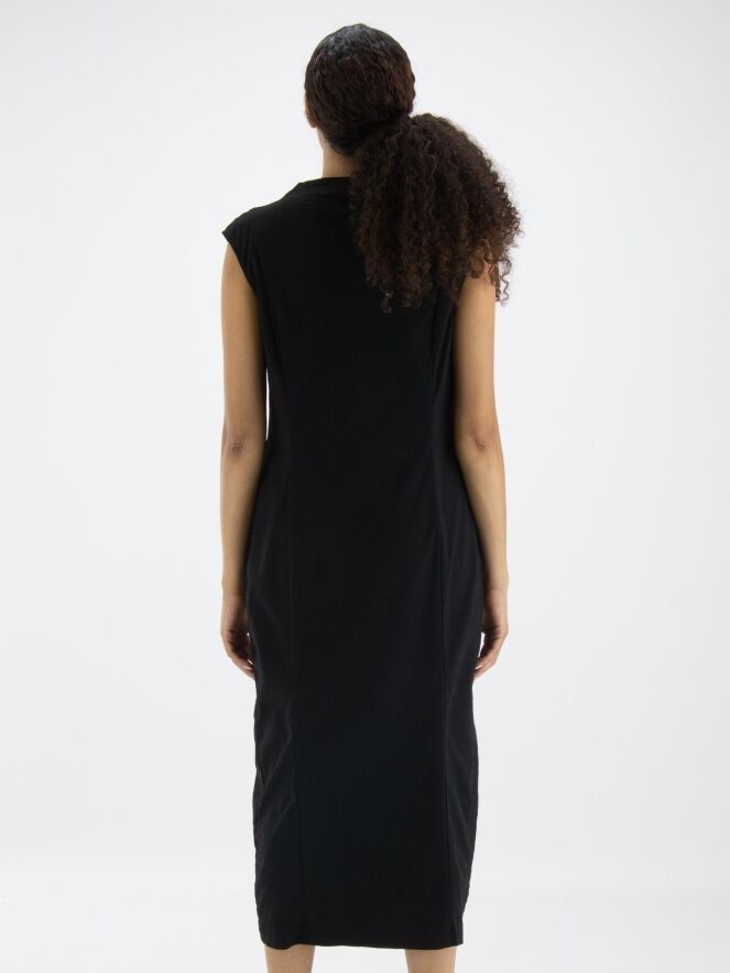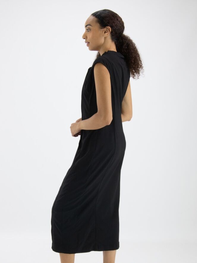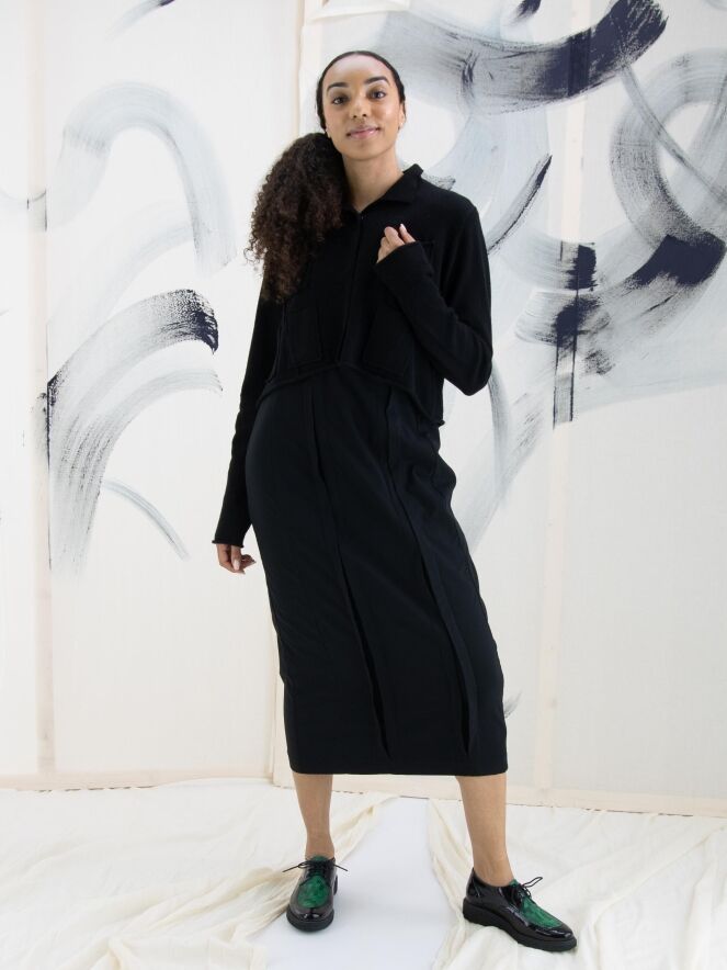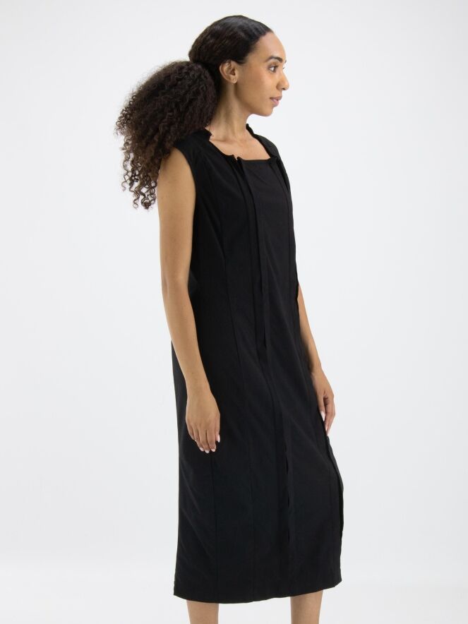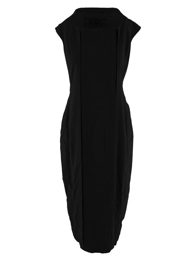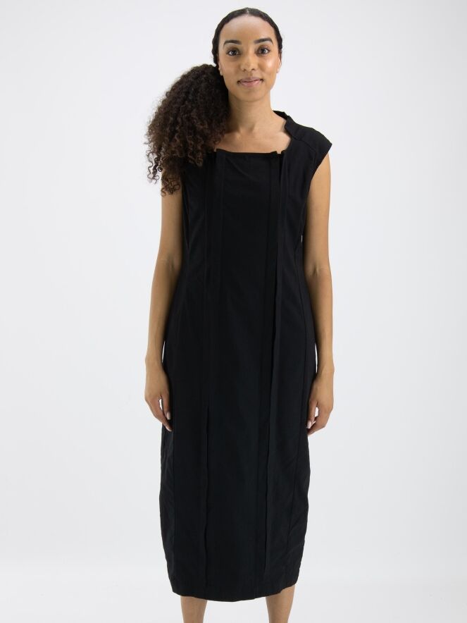 Une robe de Rundholz Black Label de couleur noire. À l'avant, deux plis verticaux inversés sont ouverts. La robe présente une légère ligne de taille. L'encolure large a une petite élévation des côtés vers l'arrière. Cette robe peut être lavée à 30 degrés.