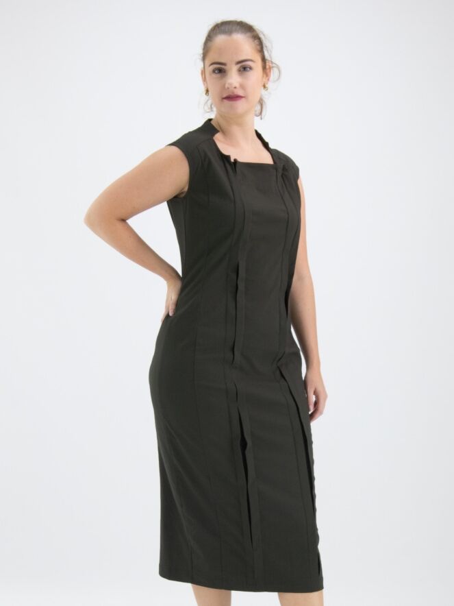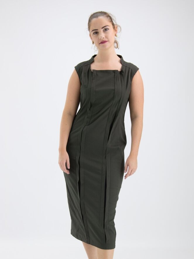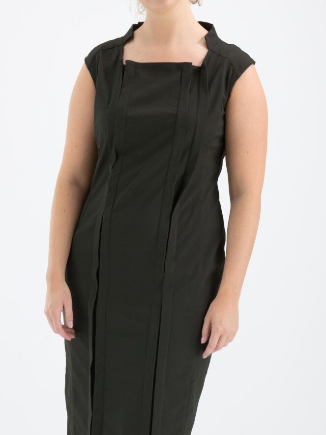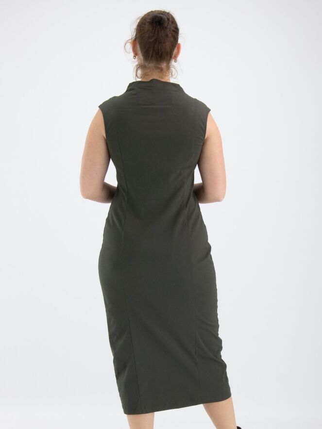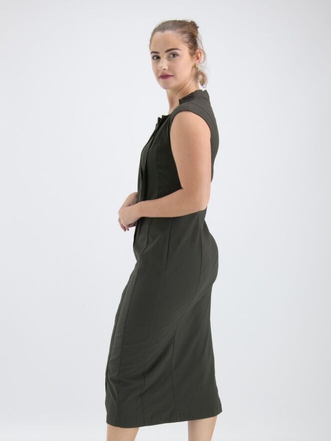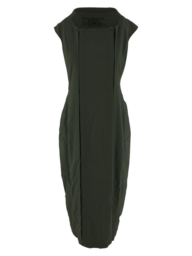 Une robe de Rundholz Black Label de couleur kaki. À l'avant, il y a deux plis inversés verticaux qui sont ouverts. La robe a une légère ligne de taille. L'encolure large présente une petite élévation des côtés vers l'arrière. Cette robe peut être lavée à 30 degrés.