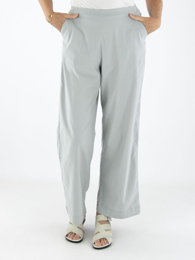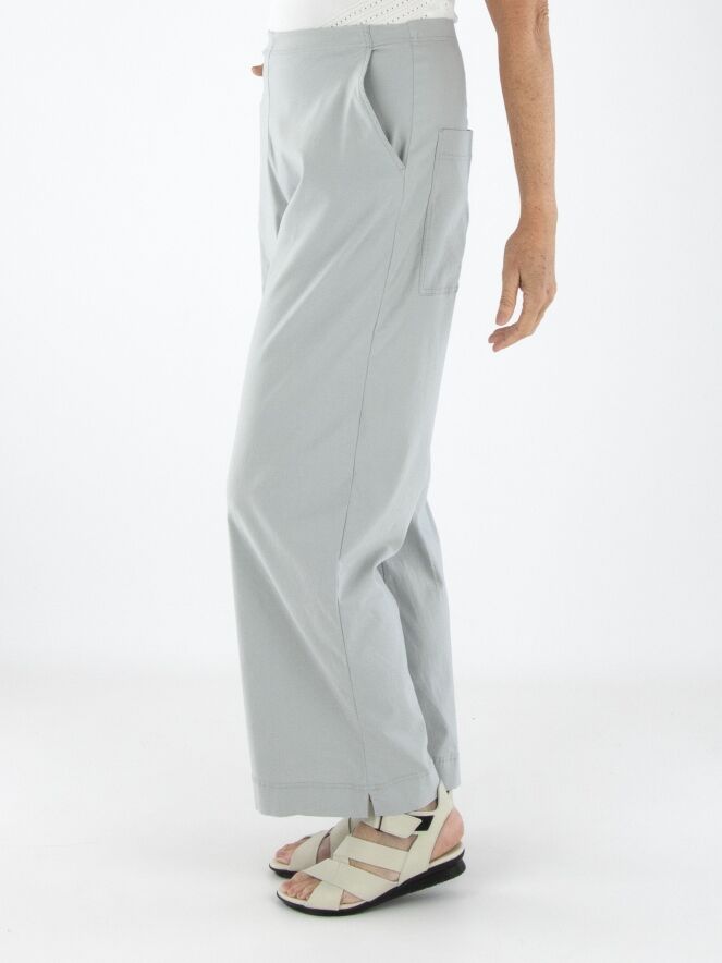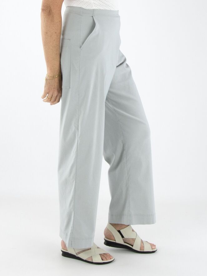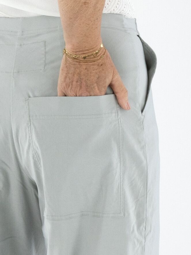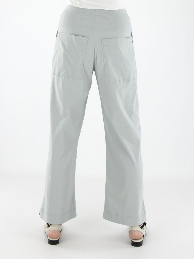 Un pantalon de Rundholz Black Label en gris clair. La taille est élastique. Les jambes sont coupées droites et le pantalon possède des poches latérales. Ce pantalon peut être lavé à 30 degrés.