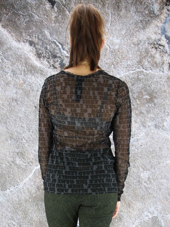 Chemise transparente de la marque Rundholz black label, à imprimé calligraphique aux couleurs bleu pétrole, noir et gris. La chemise présente un col rond et des manches longues. Des fils décoratifs descendent des manches et des côtés. Lavage à 30 degrés.