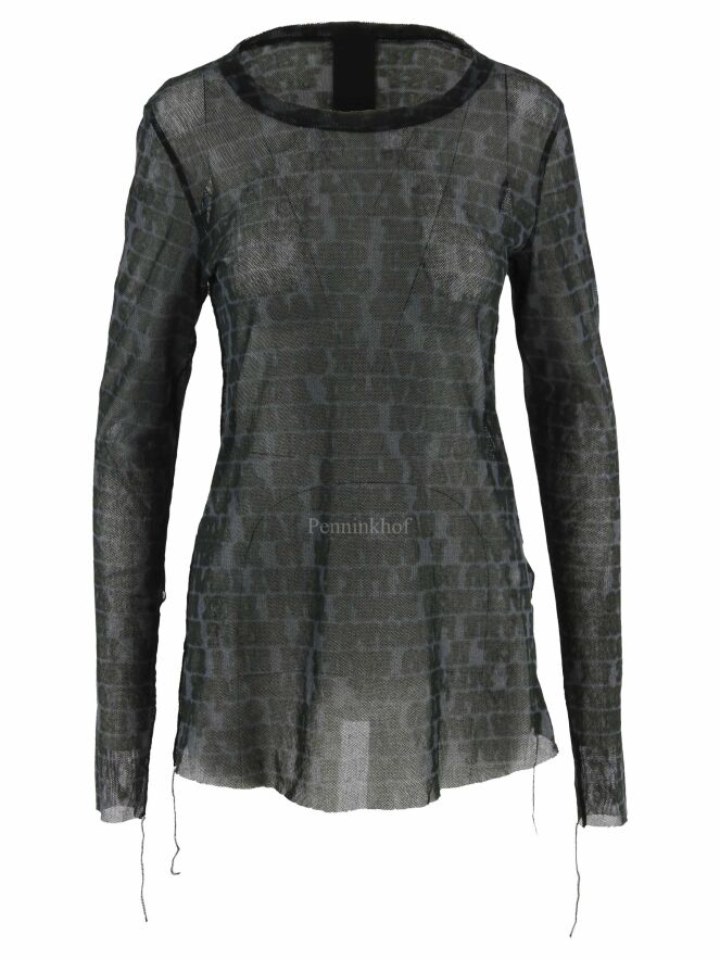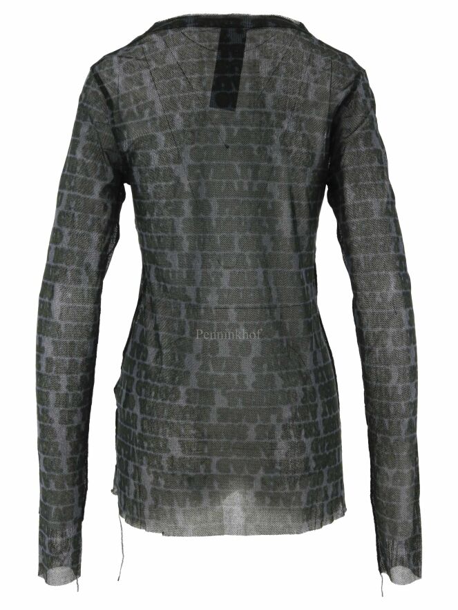 Chemise transparente de la marque Rundholz black label, à imprimé calligraphique aux couleurs vert, noir et gris. La chemise présente un col rond et des manches longues. Des fils décoratifs descendent des manches et des côtés. Lavage à 30 degrés.
