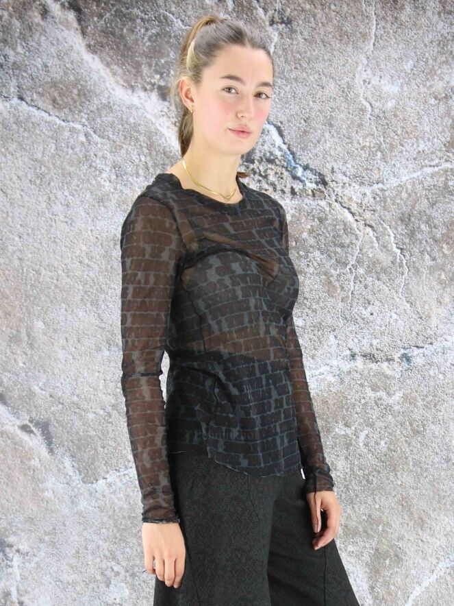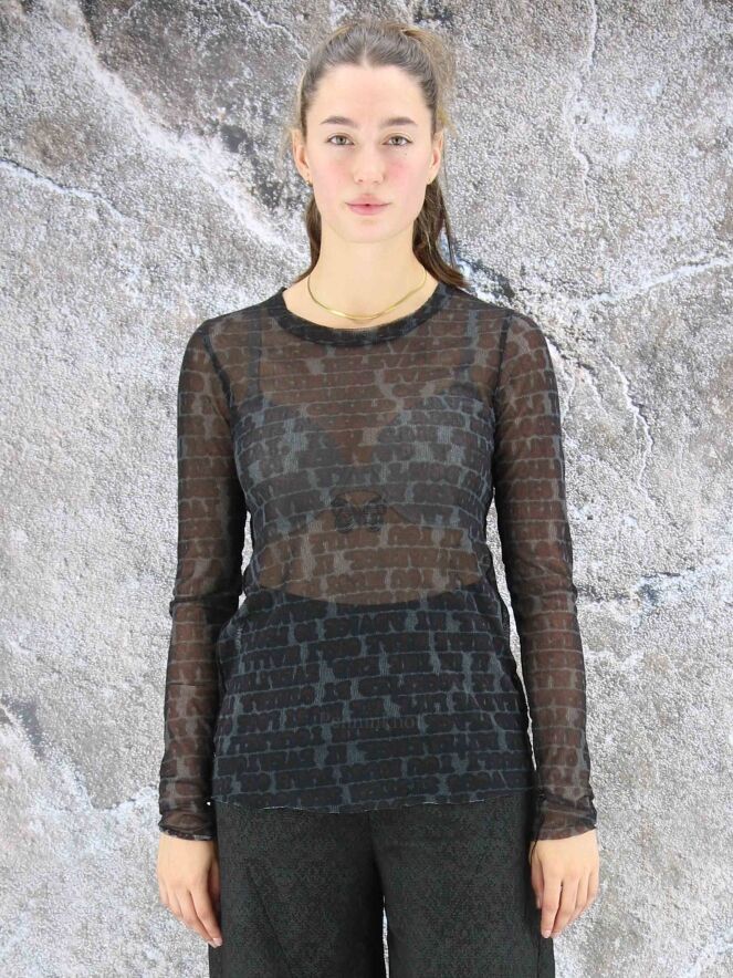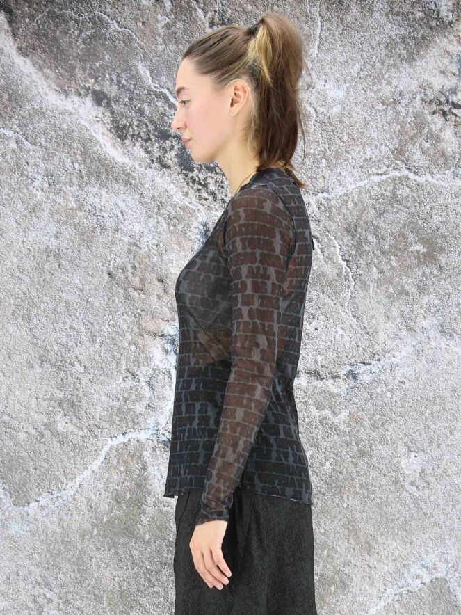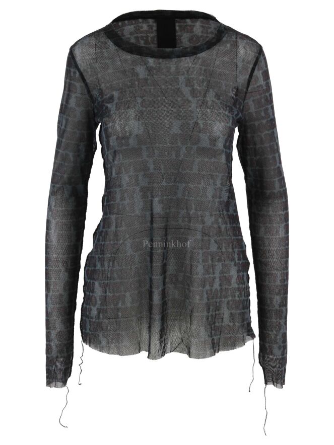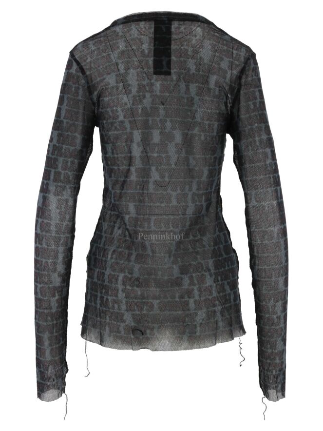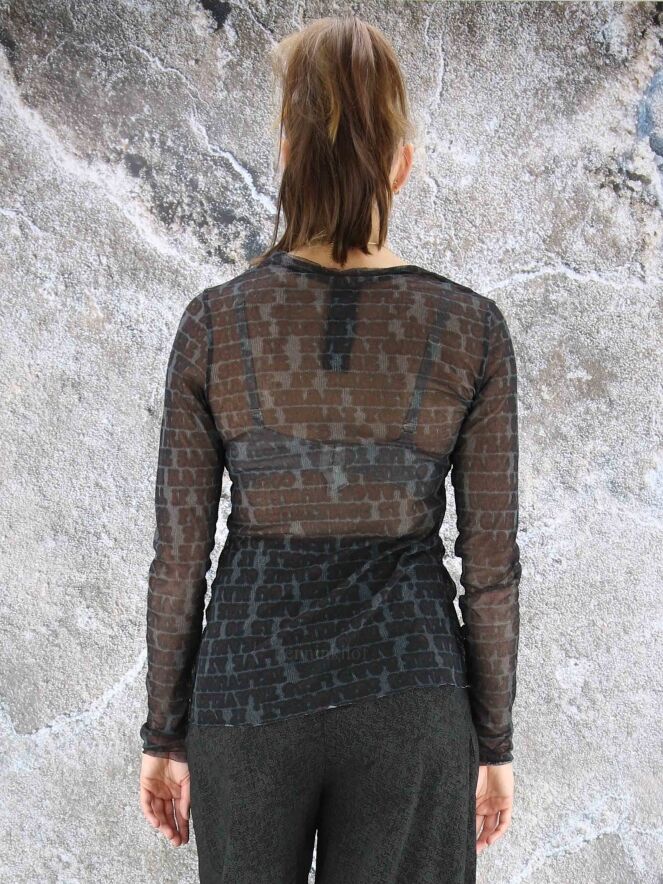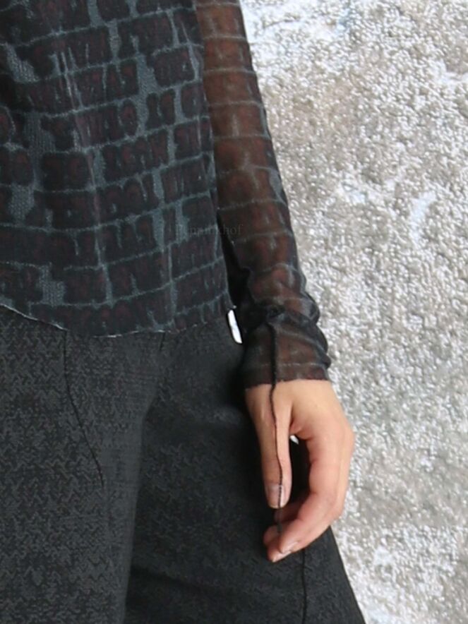 Chemise transparente de la marque Rundholz black label, à imprimé calligraphique aux couleurs bordeaux, noir et gris. La chemise présente un col rond et des manches longues. Des fils décoratifs descendent des manches et des côtés. Lavage à 30 degrés.