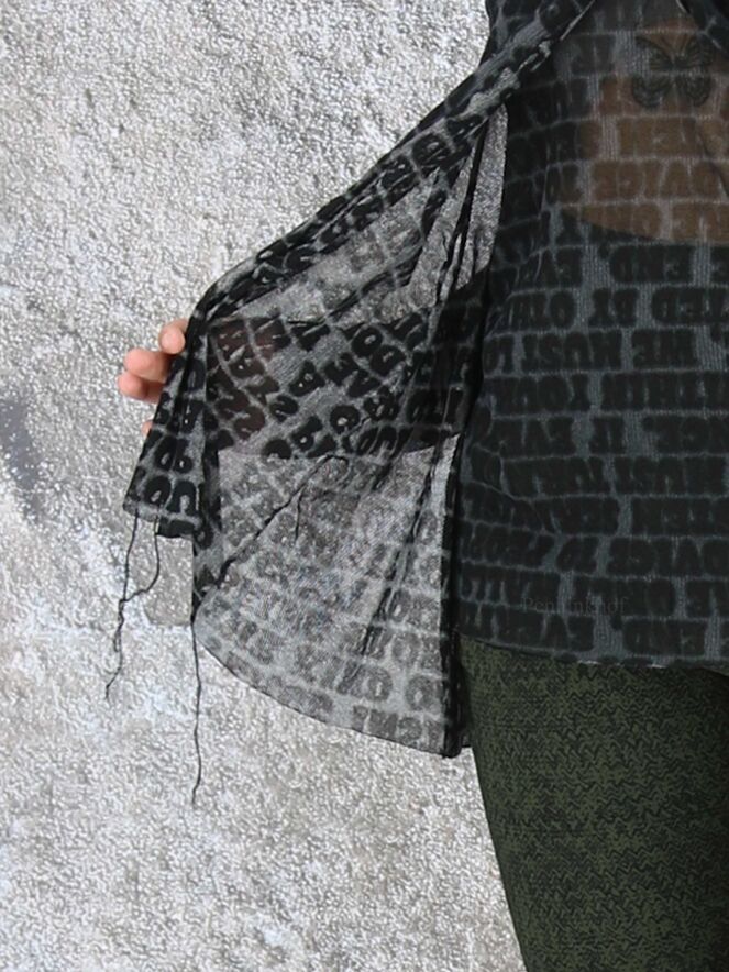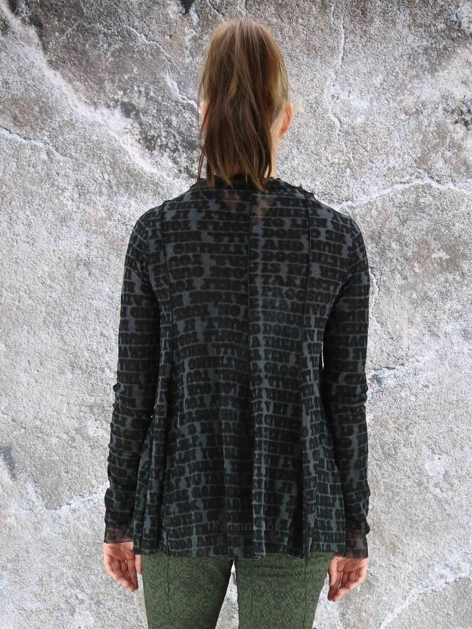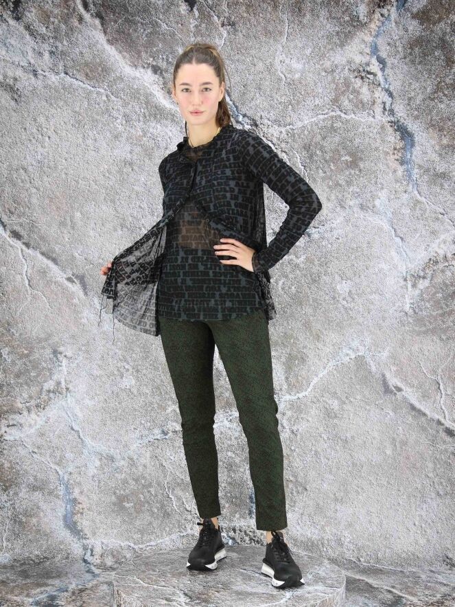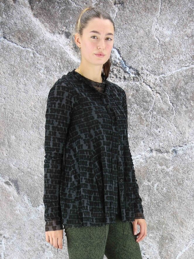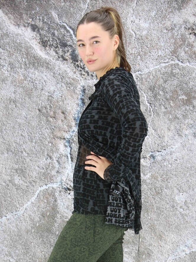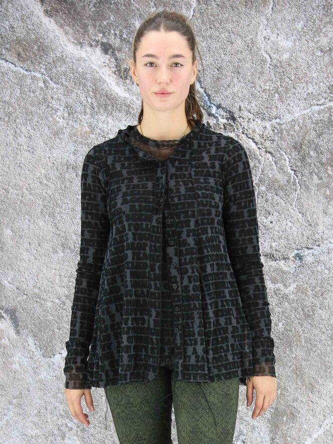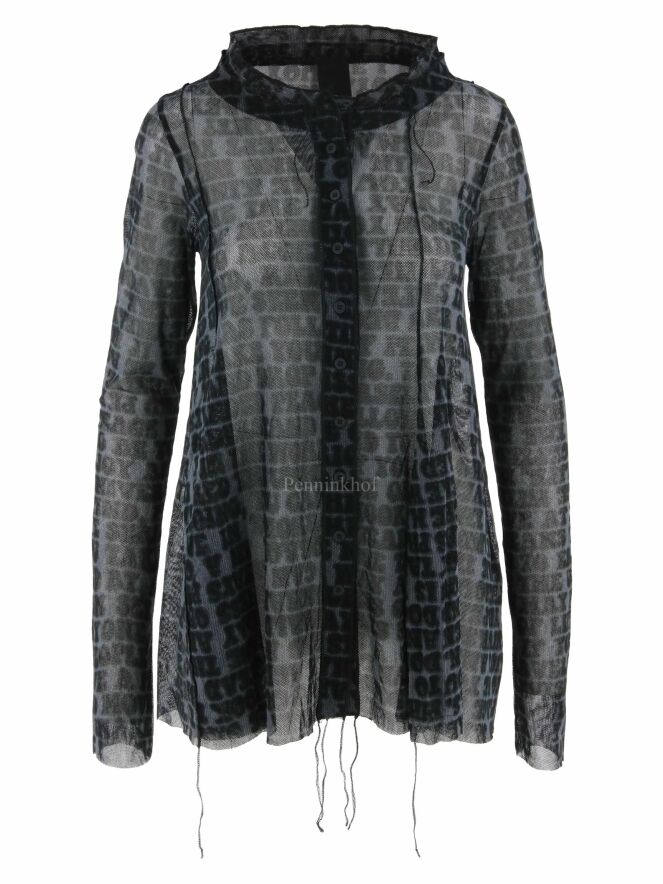 Chemise transparente à la coupe en ligne A de la marque Rundholz black label, à imprimé calligraphique aux couleurs bleu pétrole, noir et gris. La chemise présente un col légèrement montant orné d'un passepoil à double tissu et des manches longues. Des fils décoratifs descendent de la patte de boutonnage et des côtés. Lavage à 30 degrés.