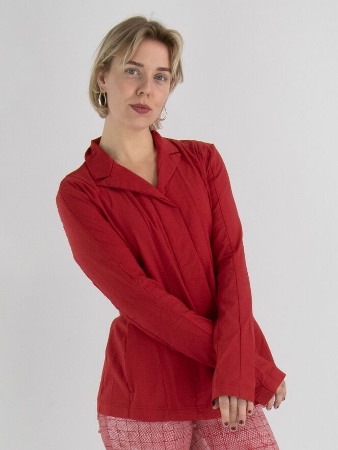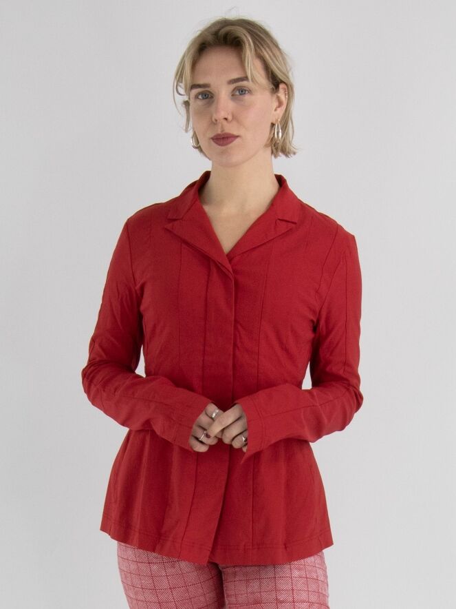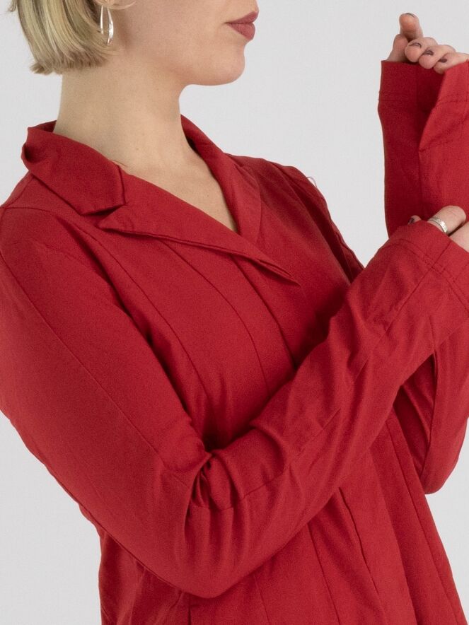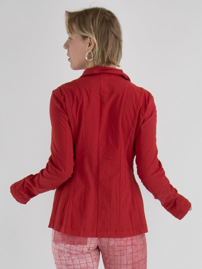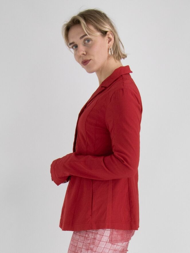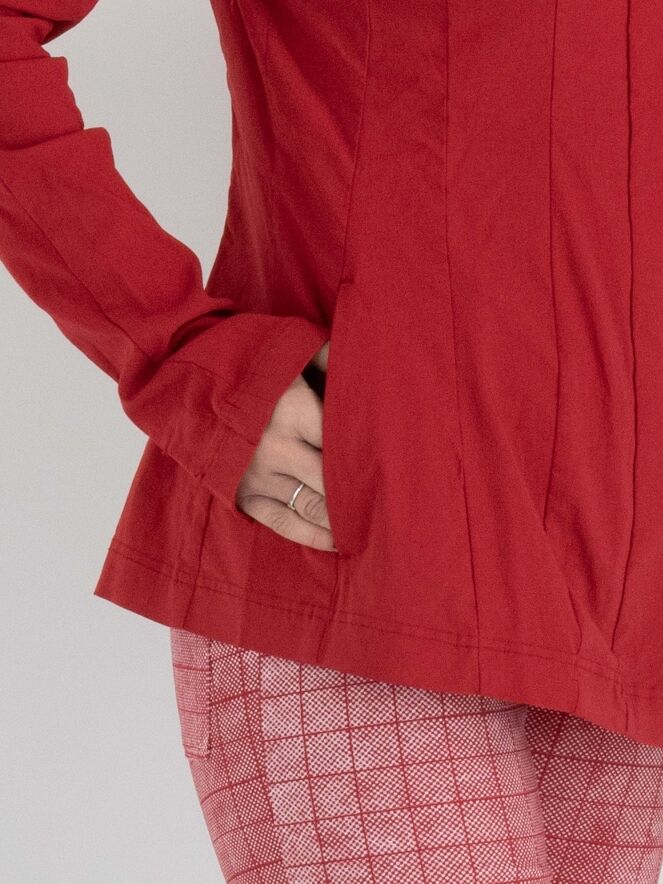 Un blazer de Rundholz Black Label en rouge. Le blazer est doté d'une fermeture dissimulée avec 5 boutons et n'est pas doublé. Plusieurs coutures des épaules accentuent légèrement la ligne de taille. Les manches longues ont les mêmes coutures décoratives. Ce blazer peut être lavé à 30 degrés.