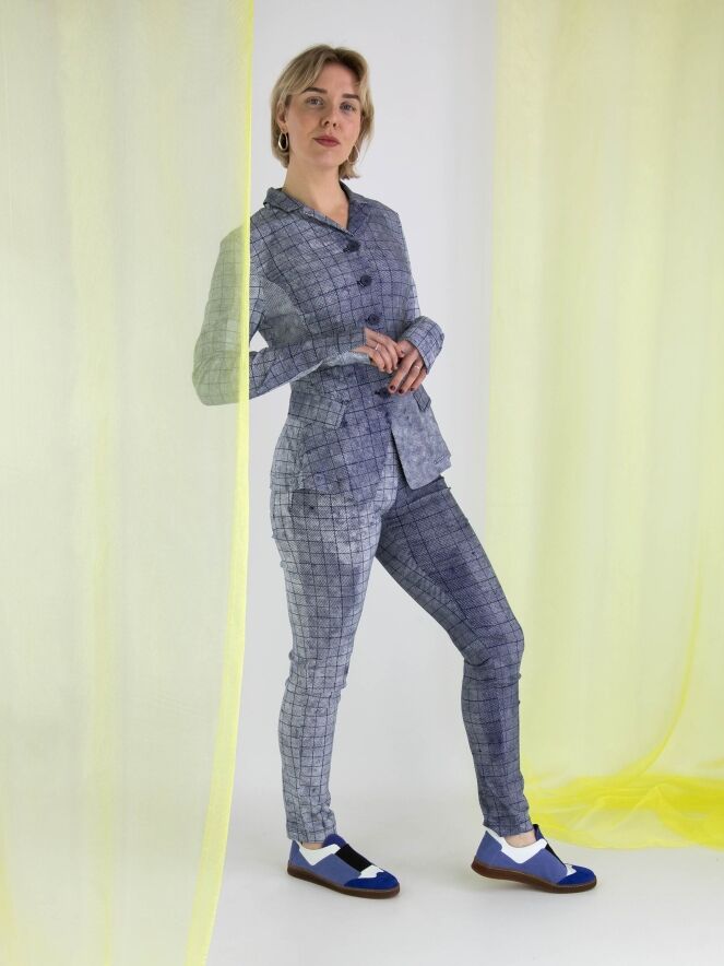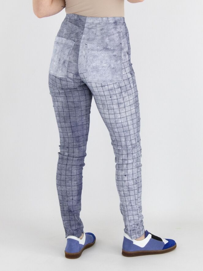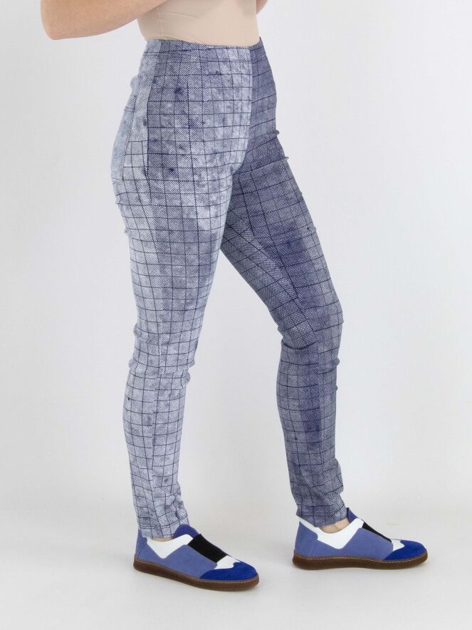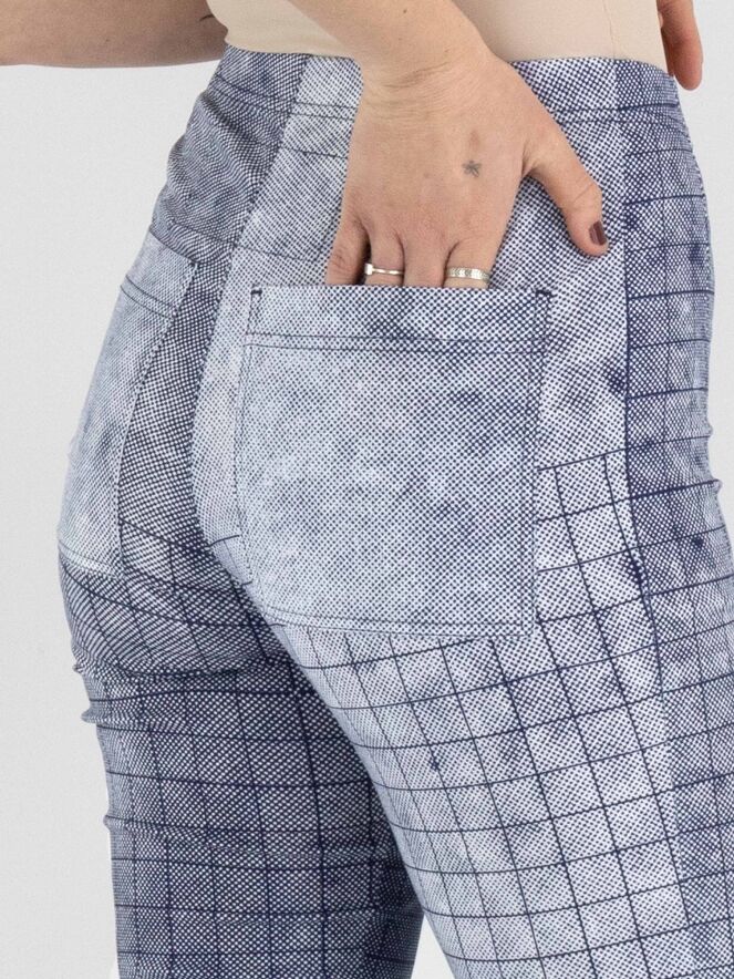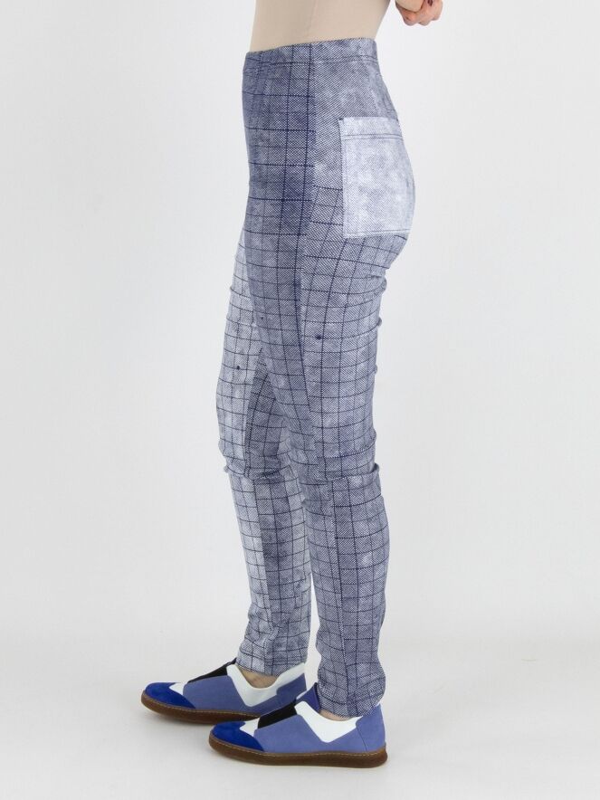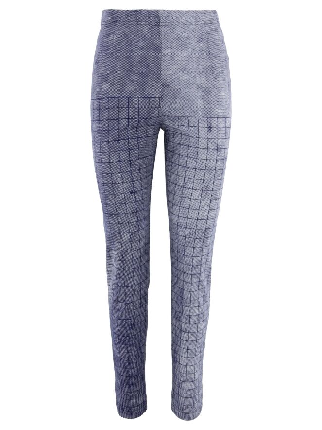 Un pantalon de Rundholz Black Label avec un motif à carreaux graphique varié en bleu indigo et blanc. Il y a une bande élastique étroite à la taille. Ce pantalon peut être lavé à 30 degrés.