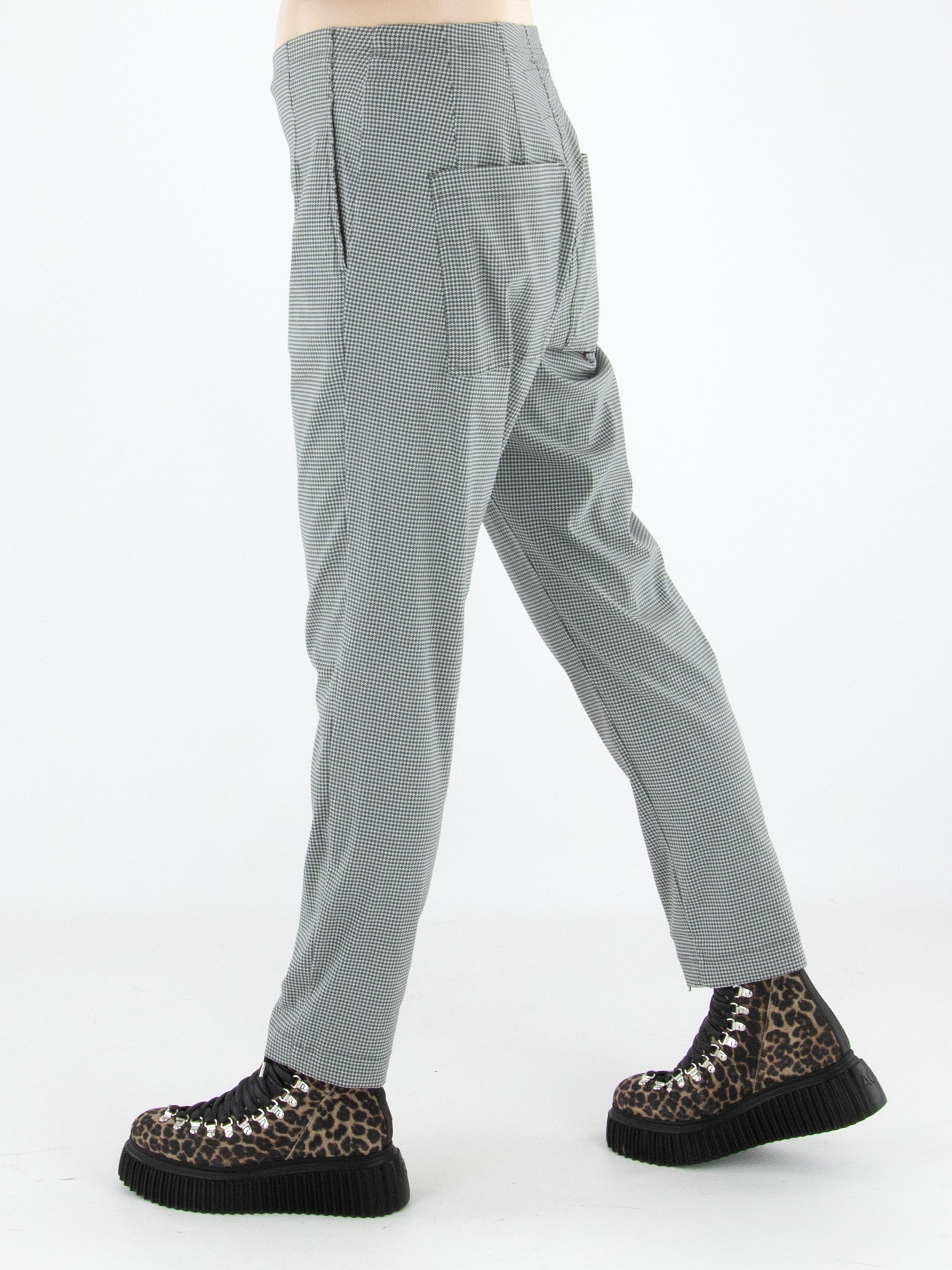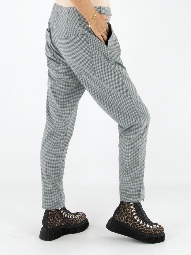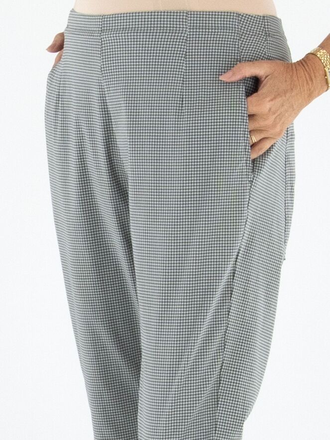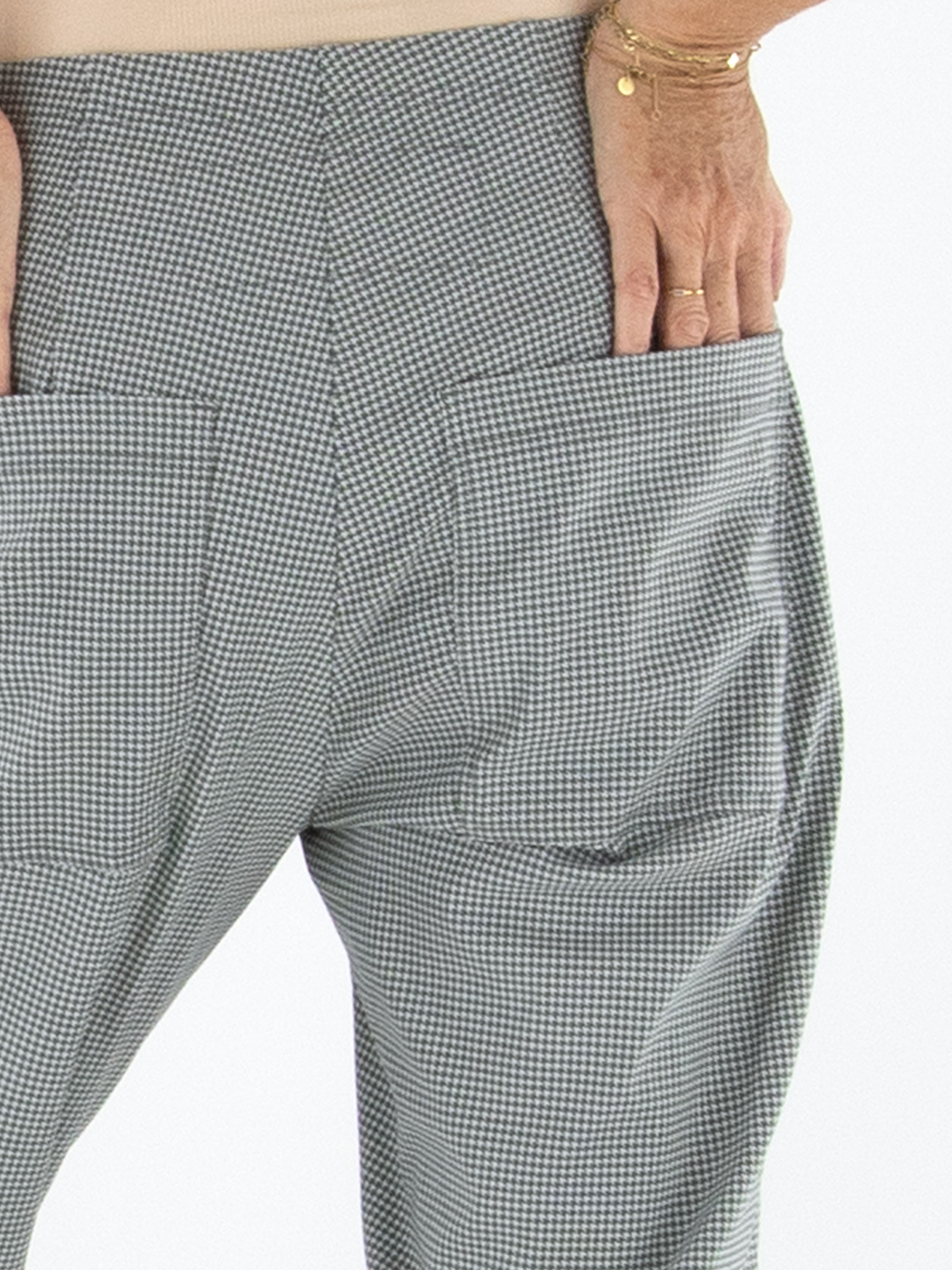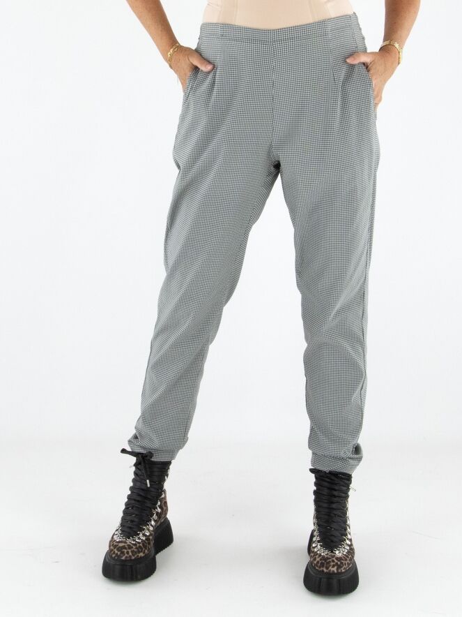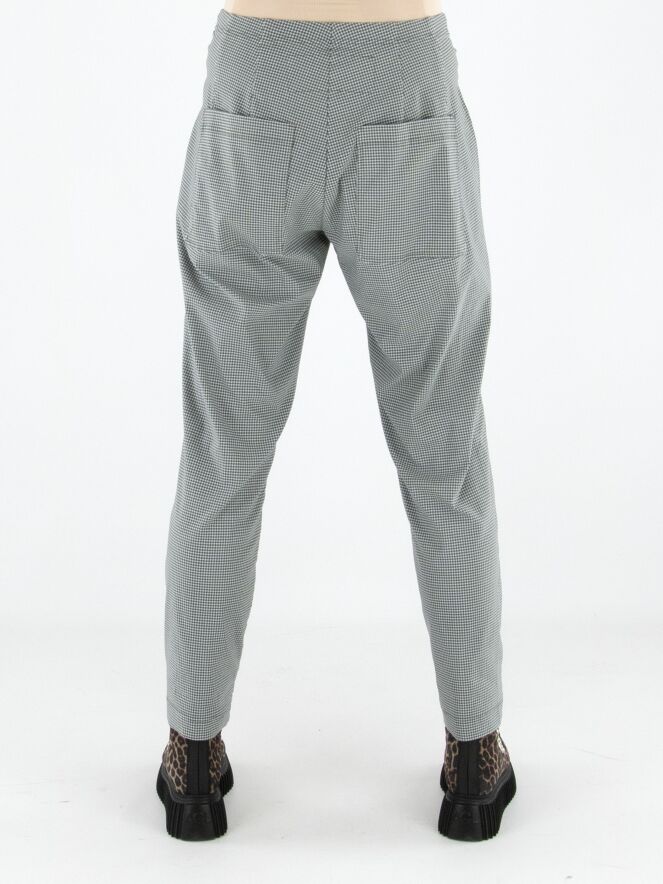 Un pantalon de Rundholz Black Label à motif pied-de-coq dans des tons gris et blanc cassé. La taille est élastiquée pour un confort optimal. Le pantalon est doté de poches fendues pratiques et peut être lavé à 30 degrés.