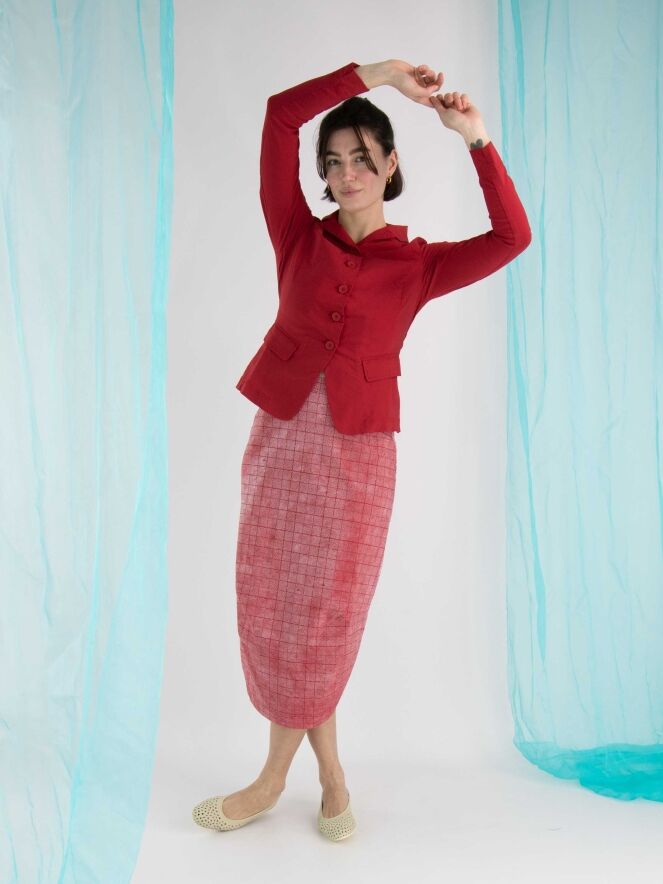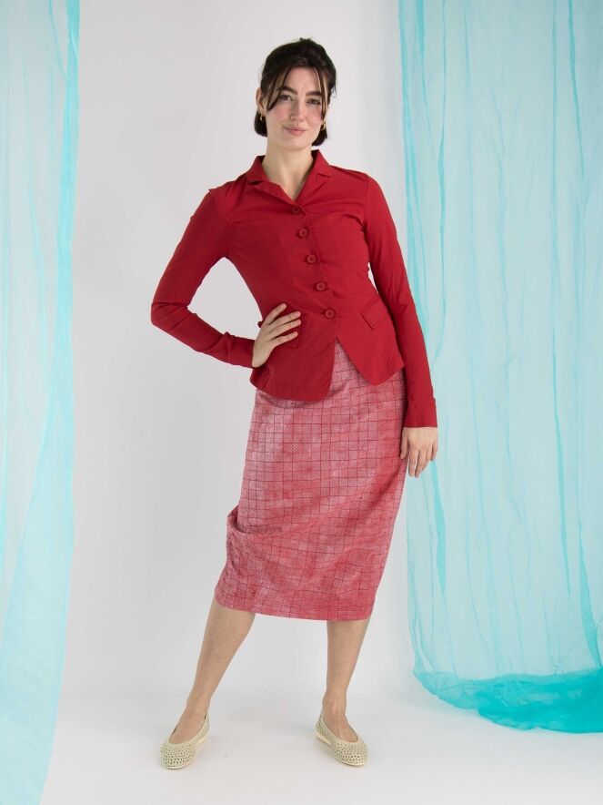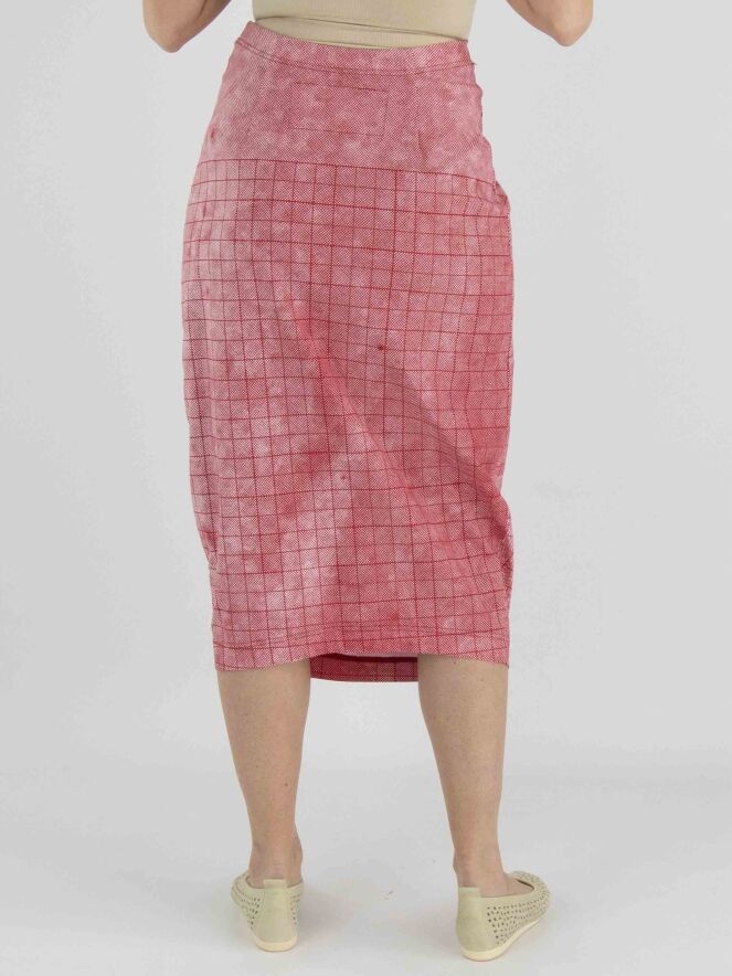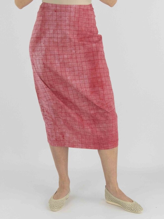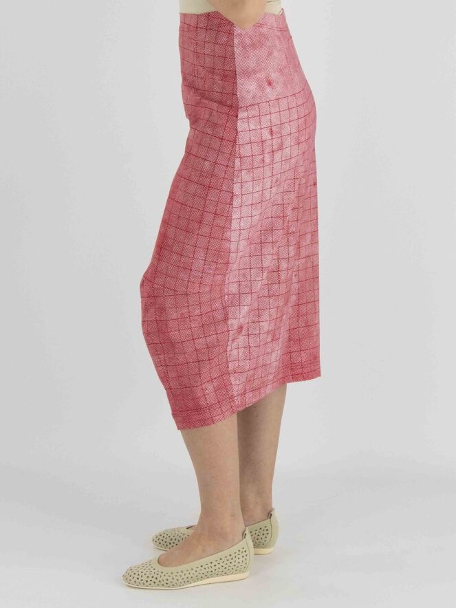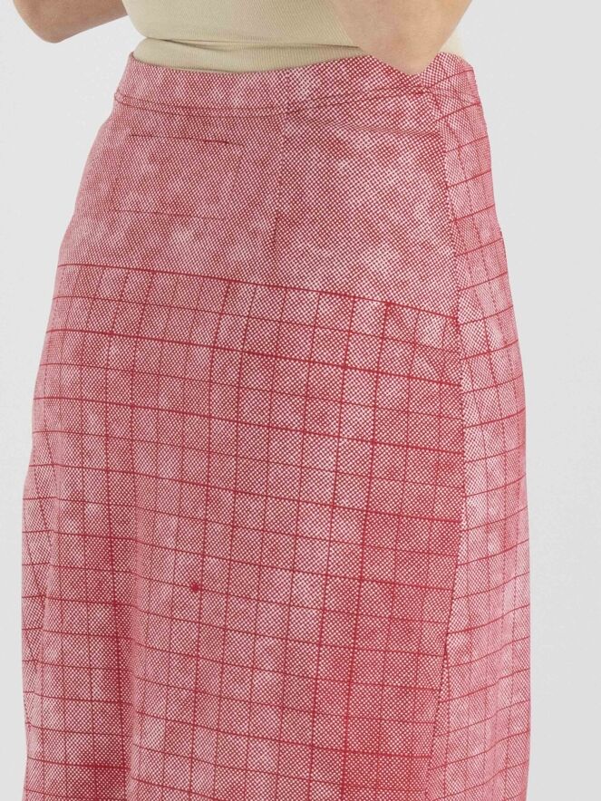Une jupe de Rundholz Black Label avec un motif à carreaux graphique varié en rouge et blanc. Il y a une bande élastique étroite à la taille. Cette jupe peut être lavée à 30 degrés.