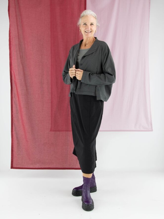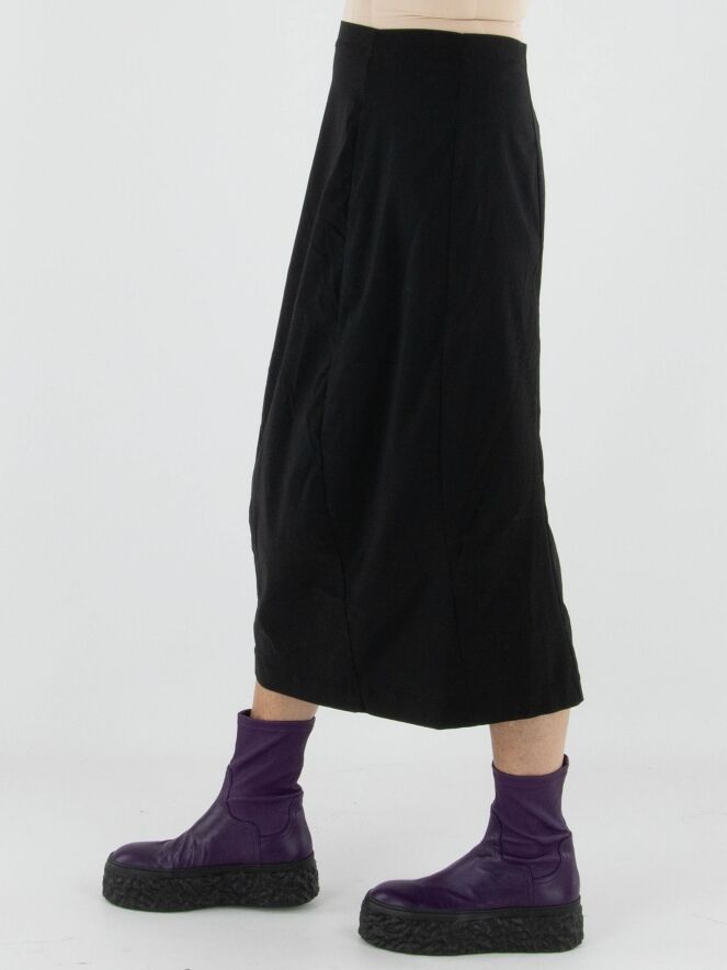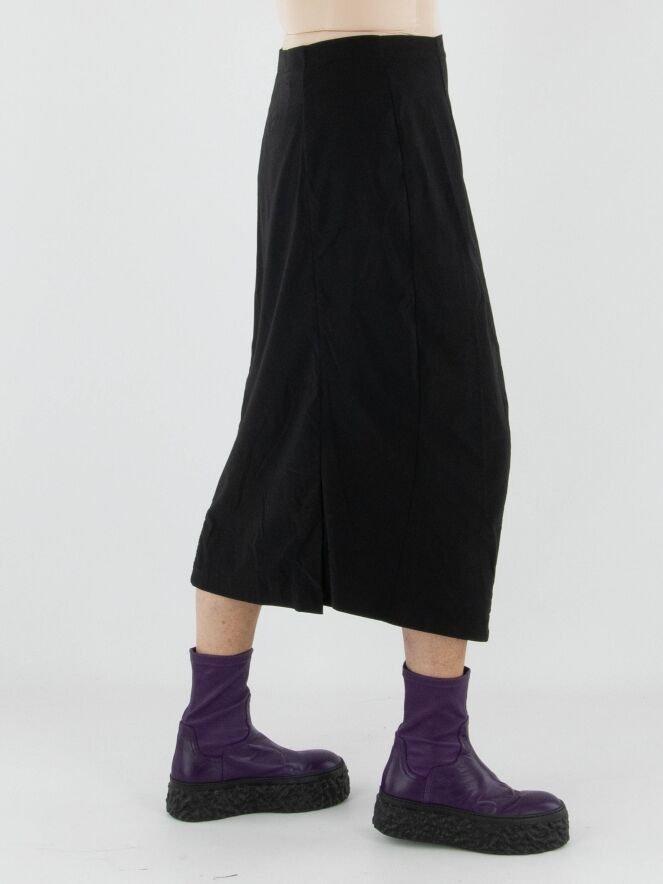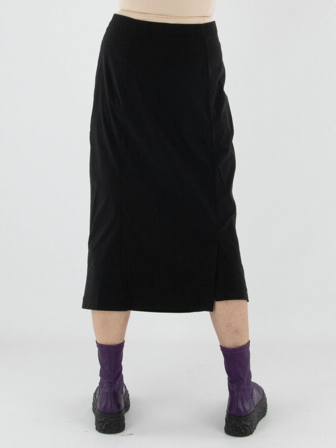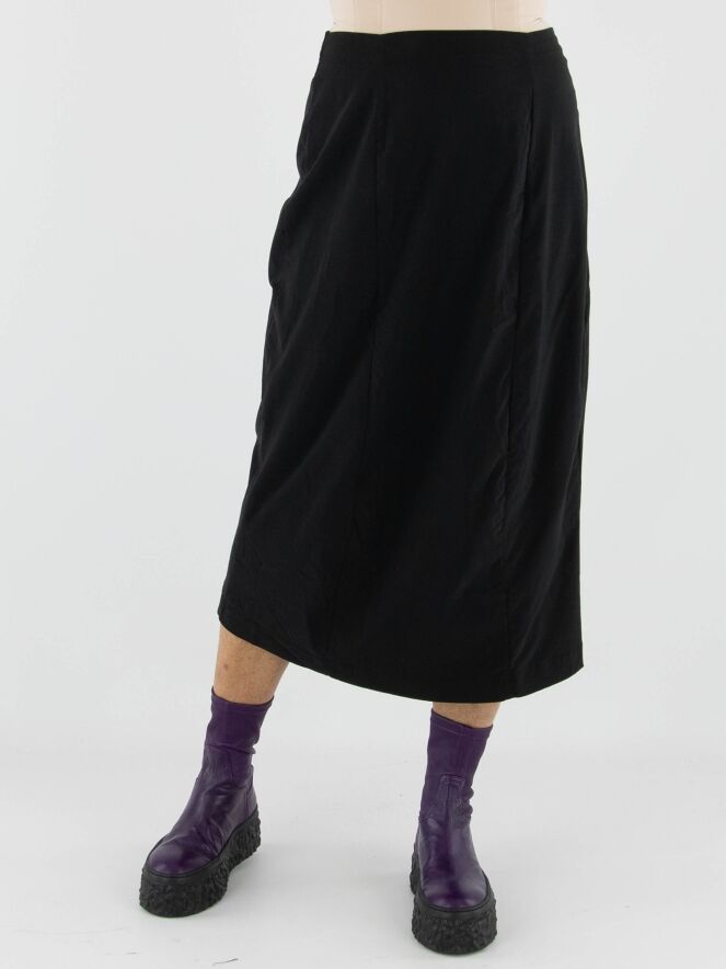 Une jupe de Rundholz Black Label en noir. La taille est élastiquée pour plus de confort. La coupe s’affine vers le bas et la jupe n’est pas doublée, ce qui lui confère une allure moderne et minimaliste. Cette jupe peut être lavée à 30 degrés.