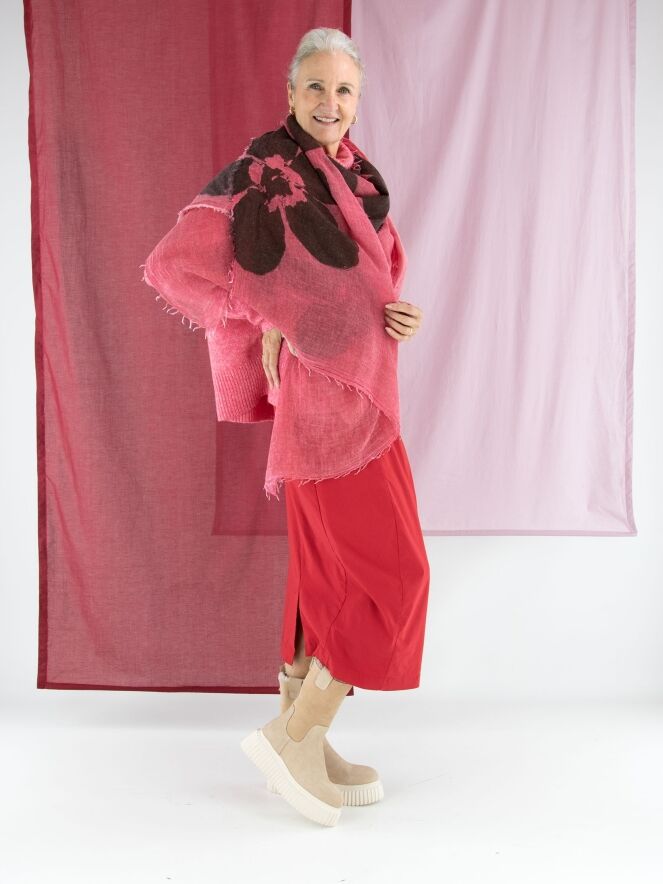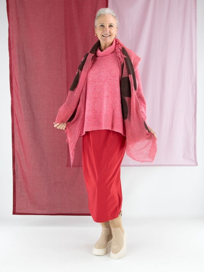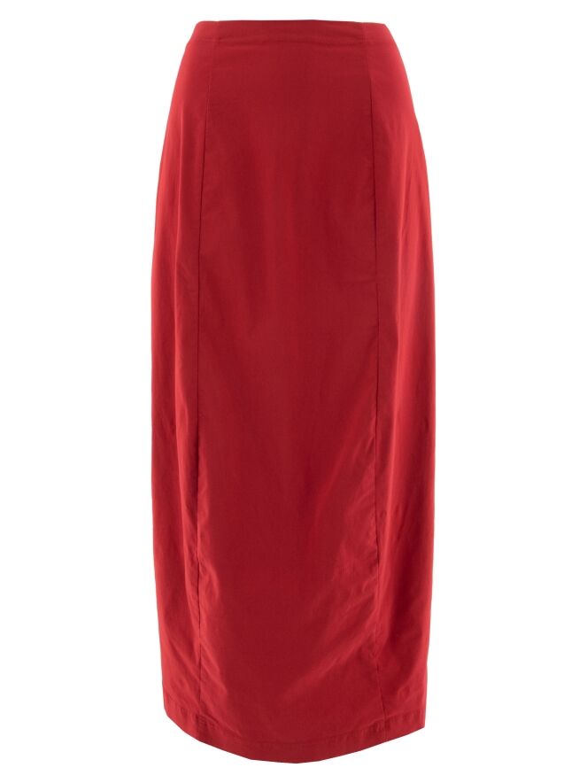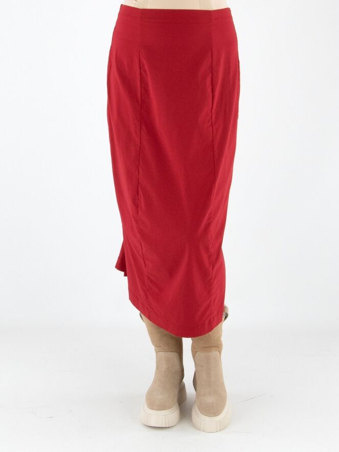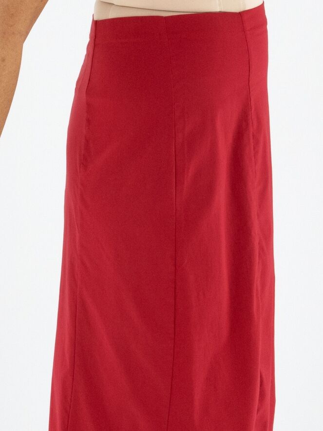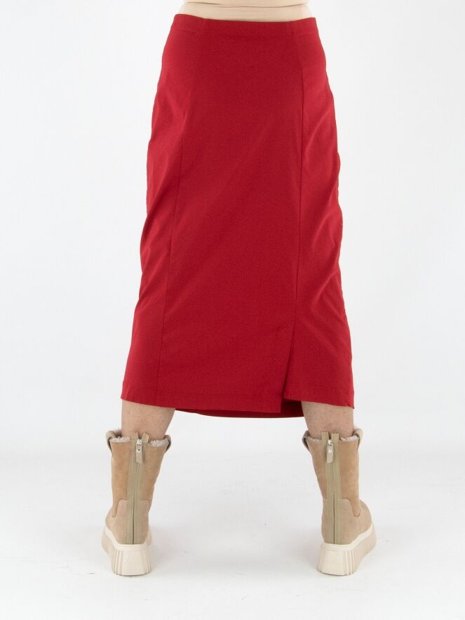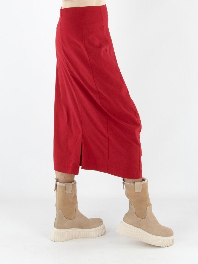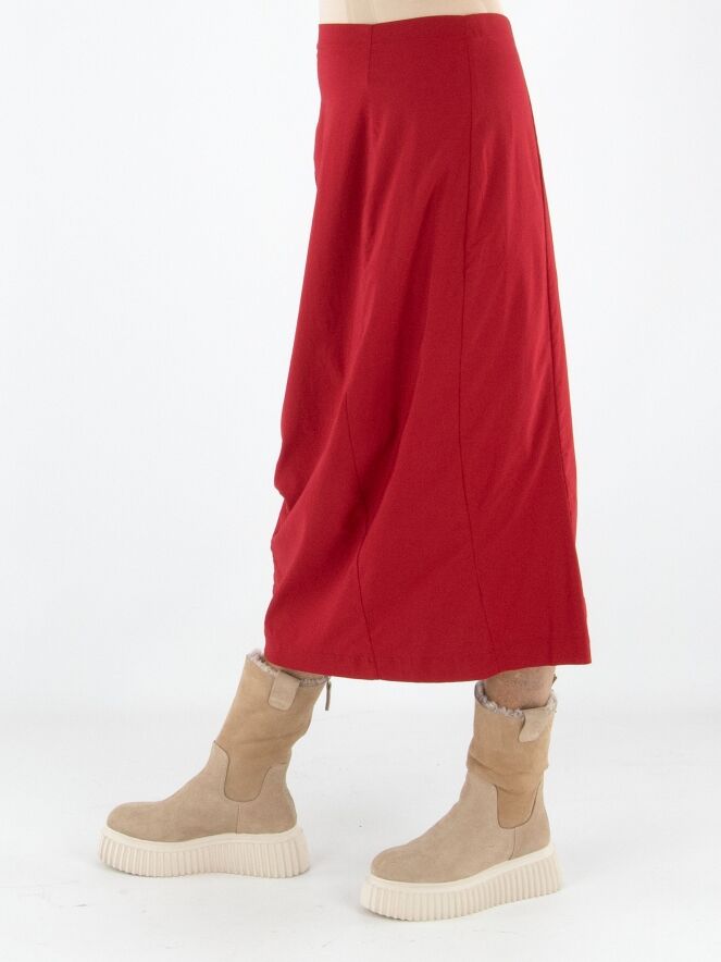 Une jupe de Rundholz Black Label en rouge. La taille est élastiquée pour plus de confort. La jupe s’affine vers le bas et n’est pas doublée, ce qui lui confère une allure légère et contemporaine. Cette jupe peut être lavée à 30 degrés.