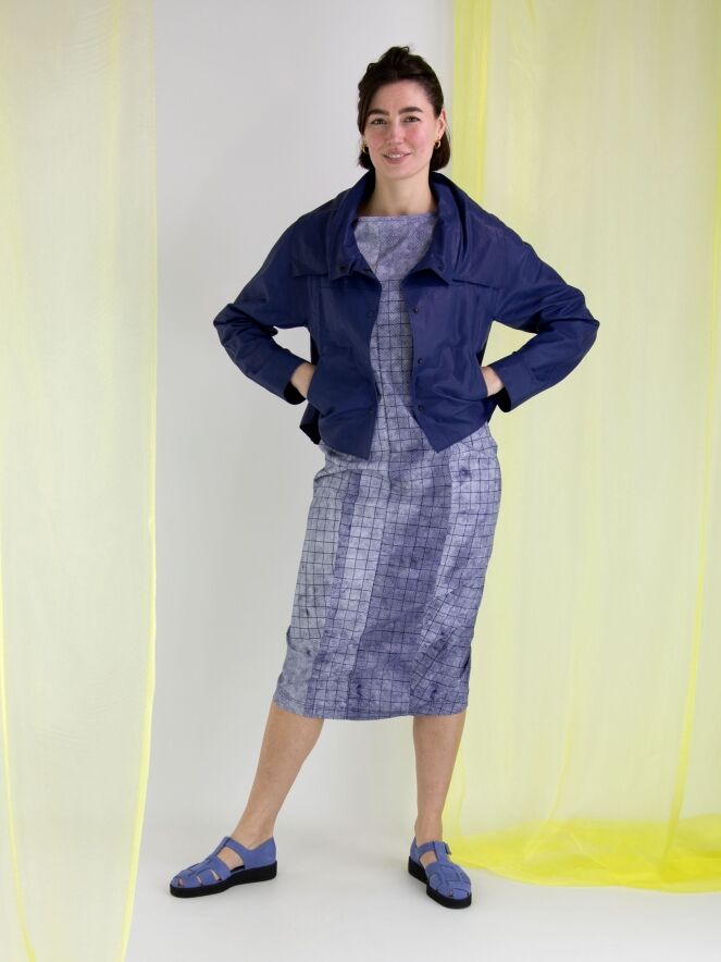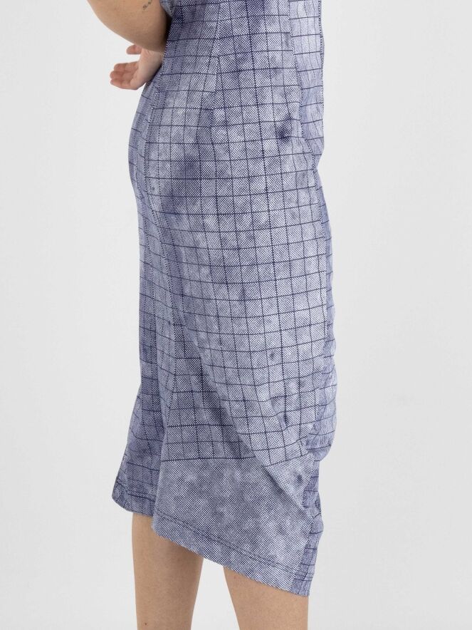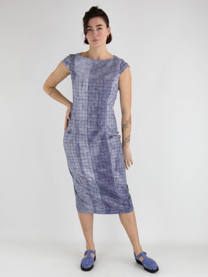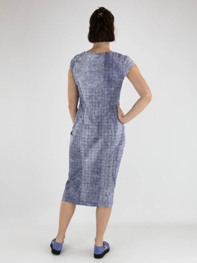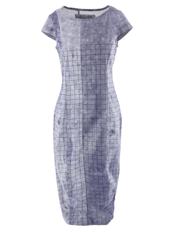 Une robe de Rundholz Black Label avec un motif de losanges graphiques variés en bleu indigo et blanc. La robe a un large décolleté et des manches chauve-souris. Cette robe peut être lavée à 30 degrés.