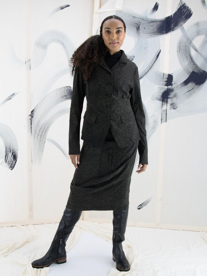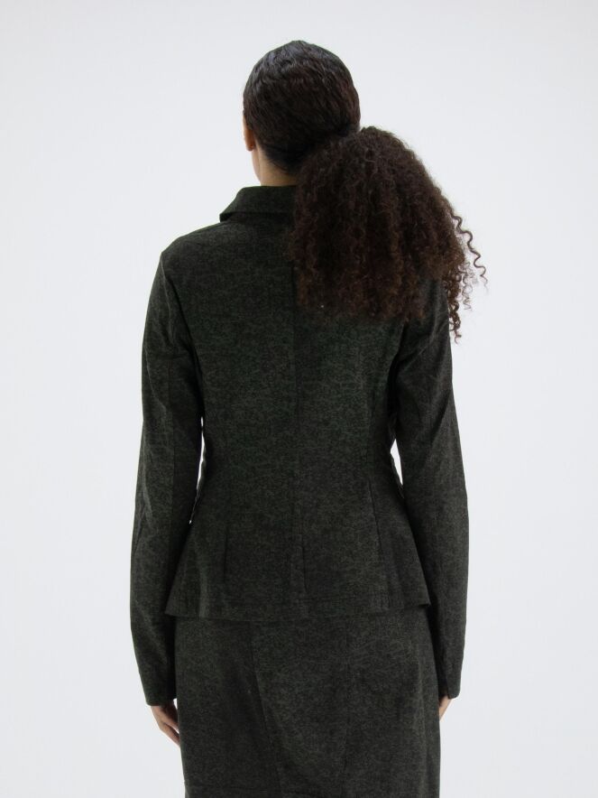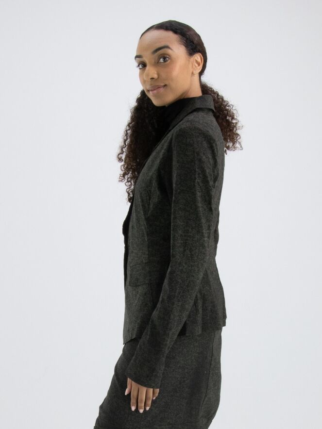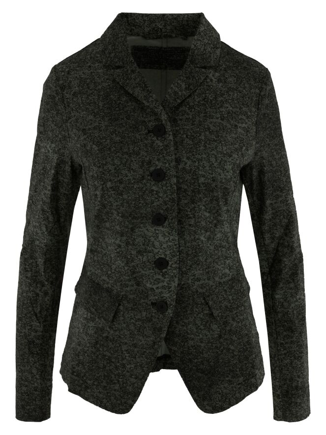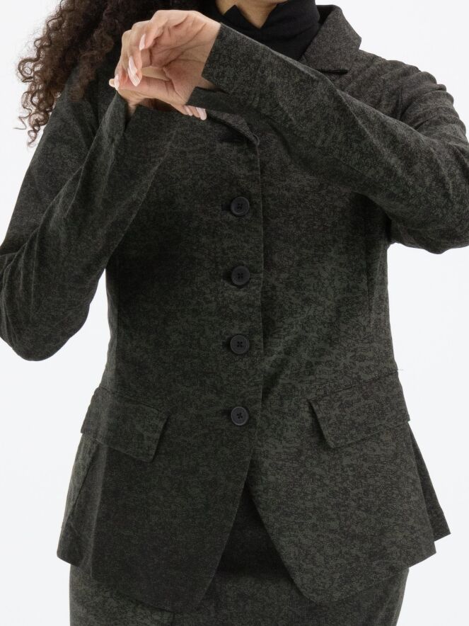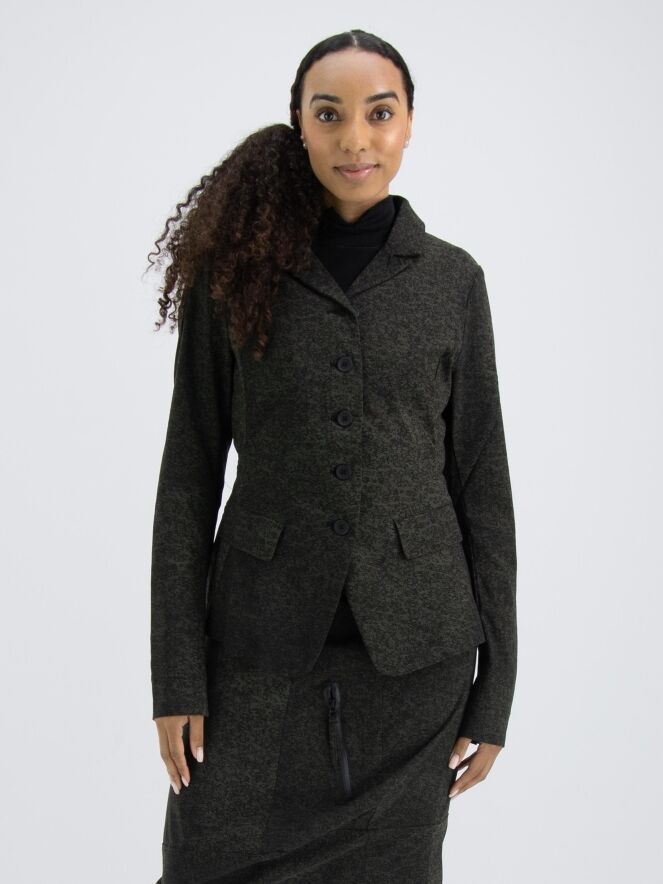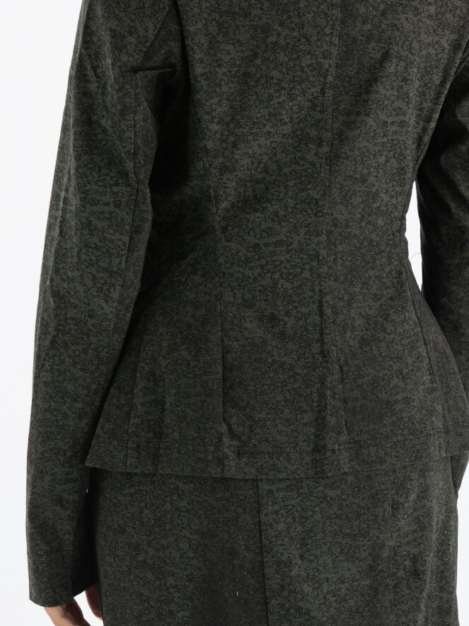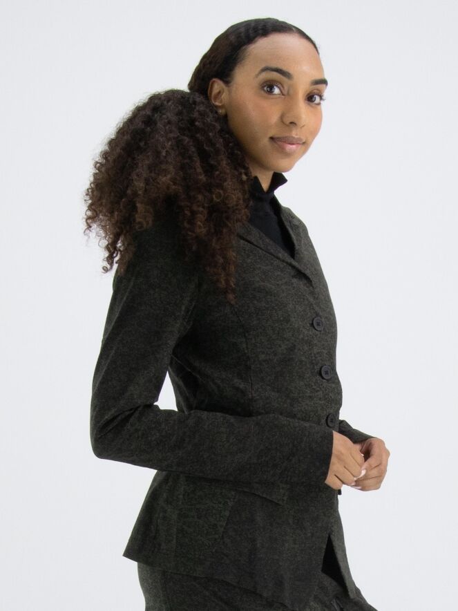 Un blazer de Rundholz Black Label avec un imprimé graphique en noir et kaki. À l'arrière, il y a plusieurs plis partant de la taille. Le blazer a une fermeture à cinq boutons et peut être lavé à 30 degrés.