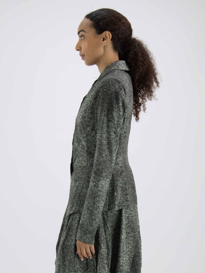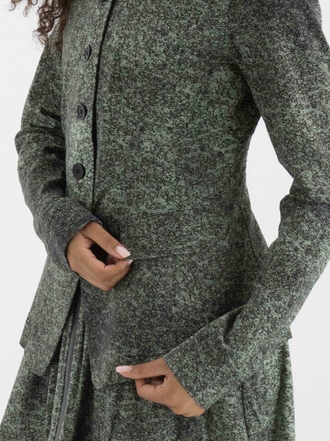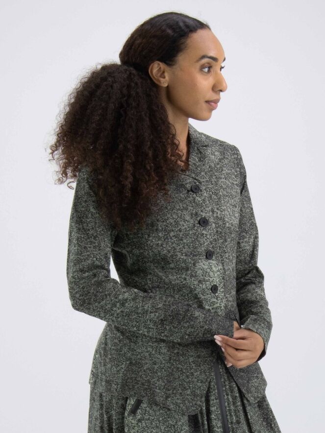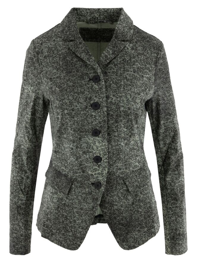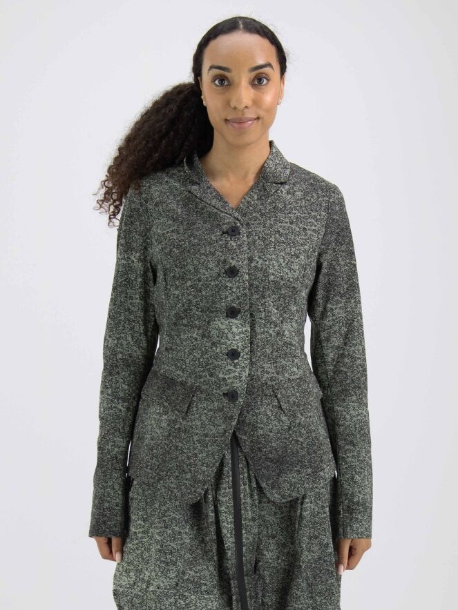 Un blazer de Rundholz Black Label avec un imprimé graphique en noir et vert olive. À l'arrière, il y a plusieurs plis partant de la taille. Le blazer a une fermeture à cinq boutons et peut être lavé à 30 degrés.