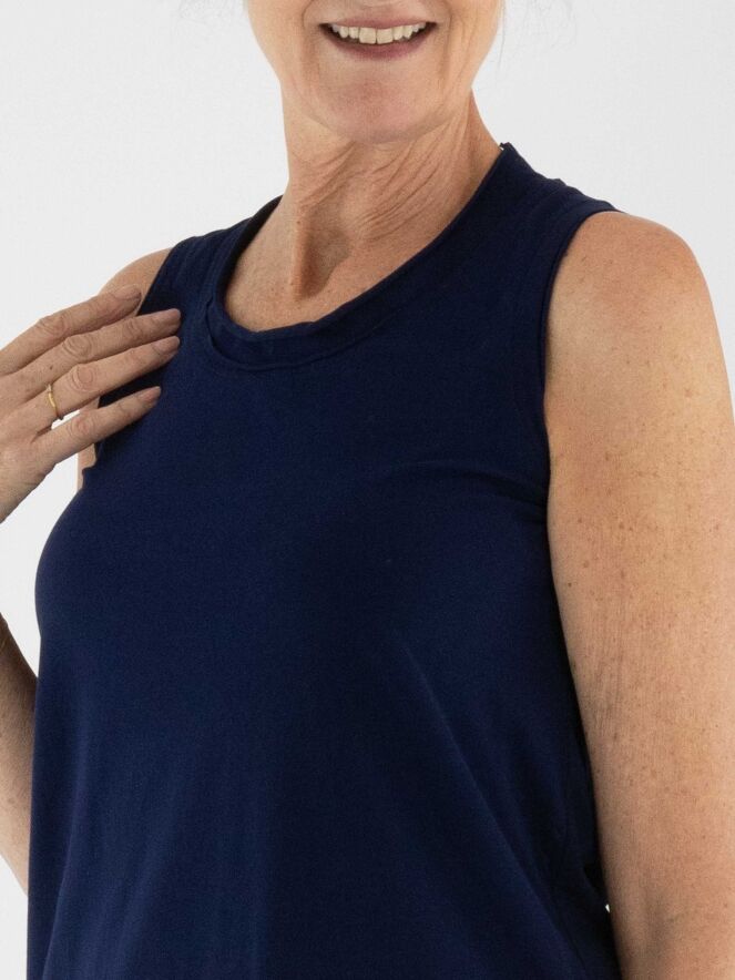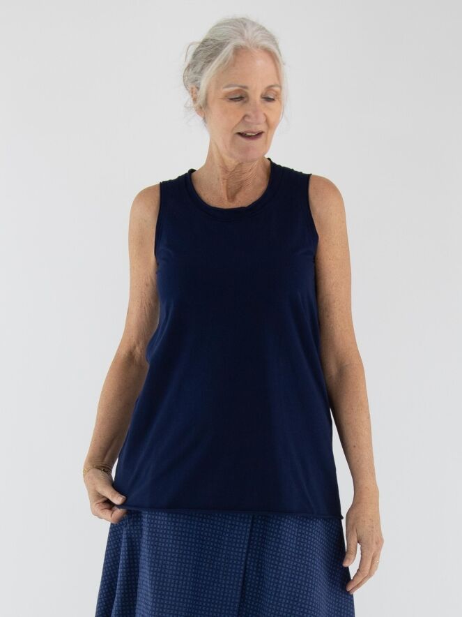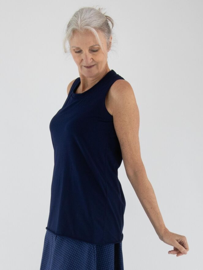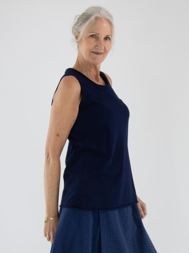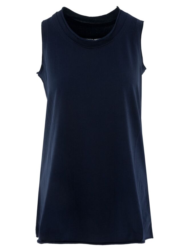 Un haut de Rundholz Black Label en bleu marine. Une bordure légèrement transparente avec un effet froncé orne l’encolure ronde et les emmanchures. Le bas du top est également froncé. Ce haut peut être lavé à 30 degrés.