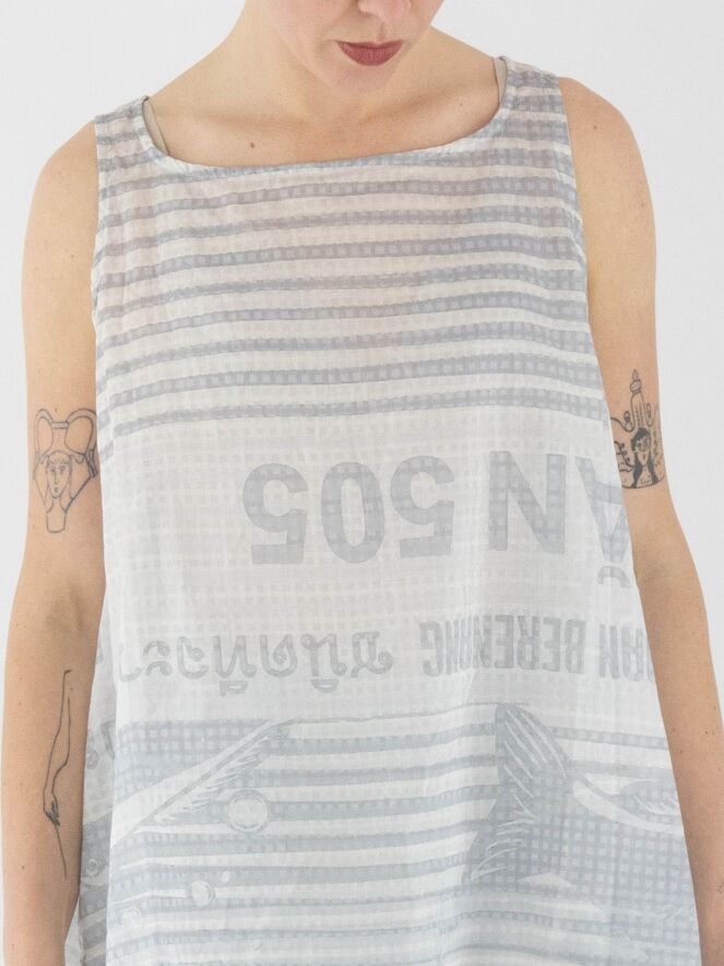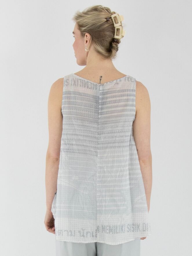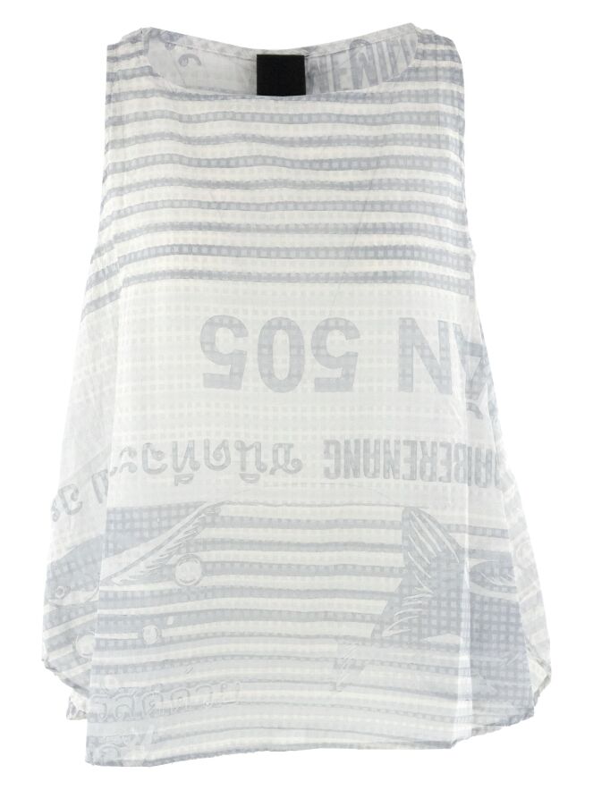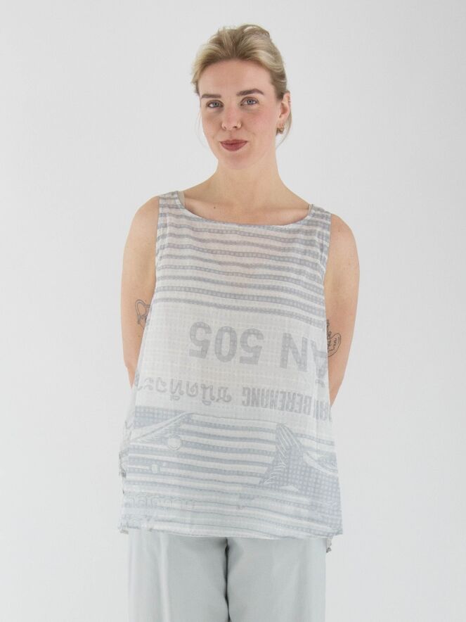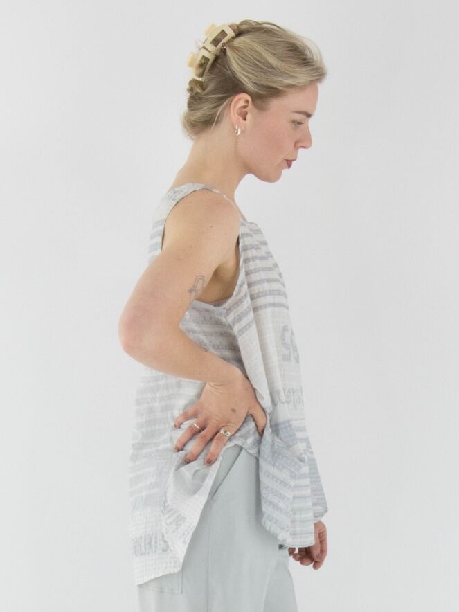 Un top légèrement transparent de Rundholz Black Label avec un imprimé de textes et de motifs géométriques. L’imprimé mélange plusieurs nuances de gris avec du blanc. Ce top a une coupe en A et peut être lavé à 30 degrés.