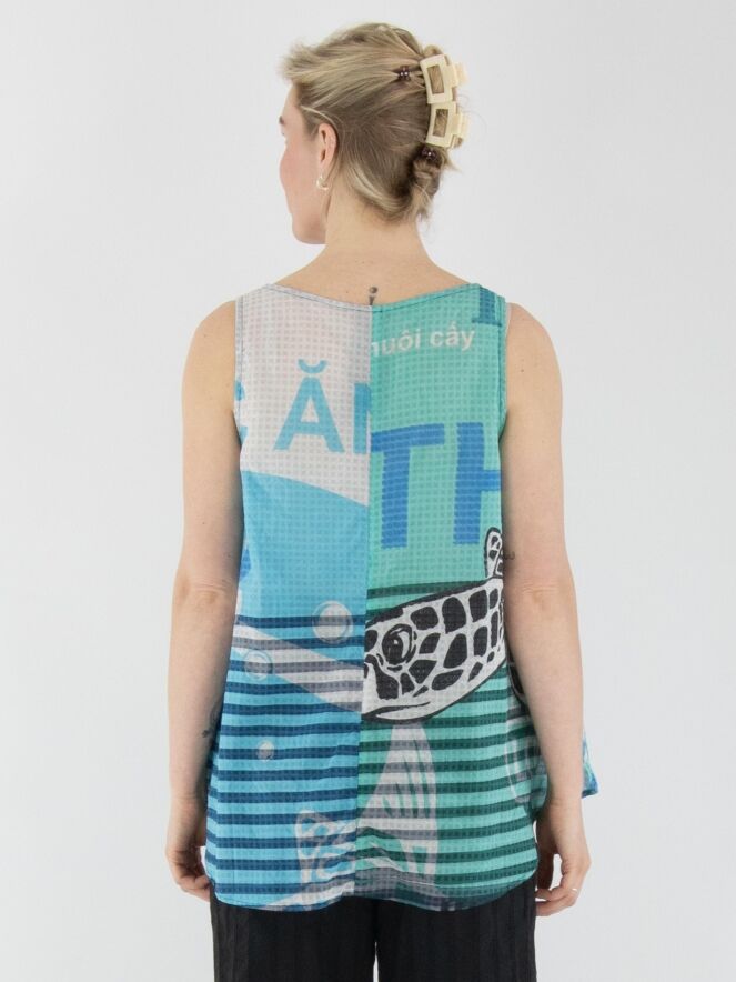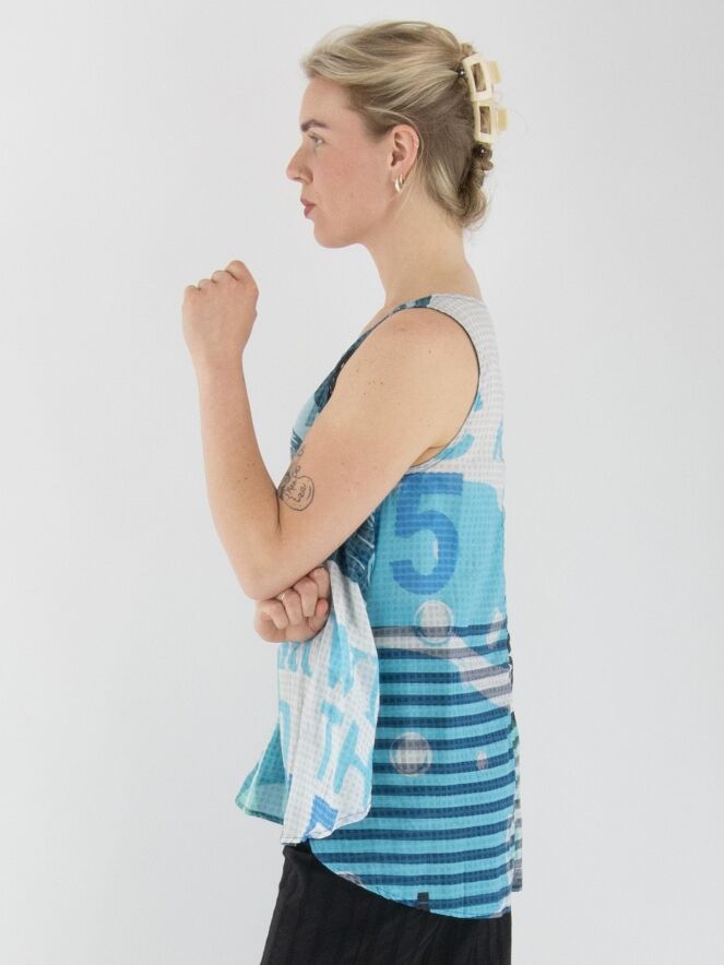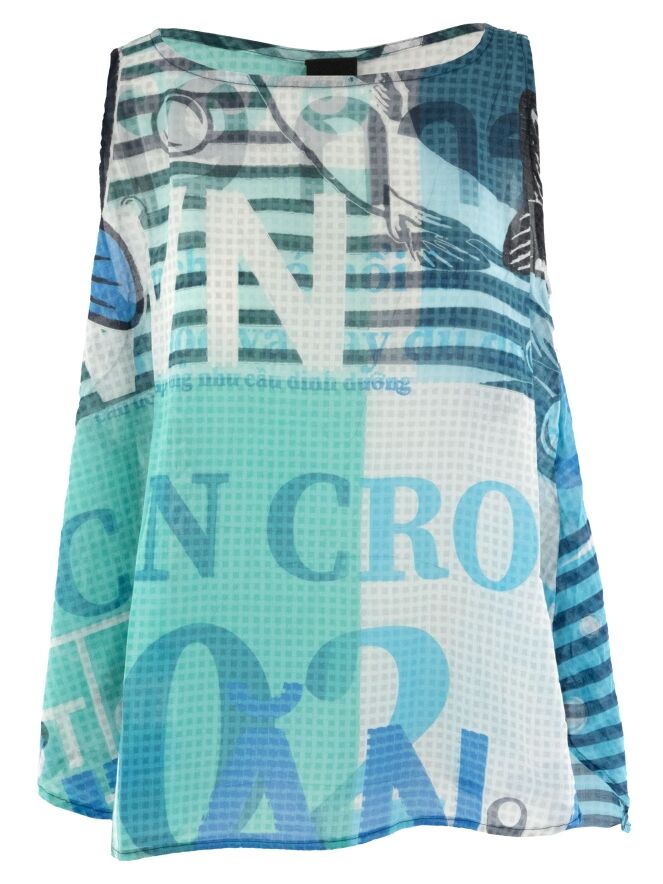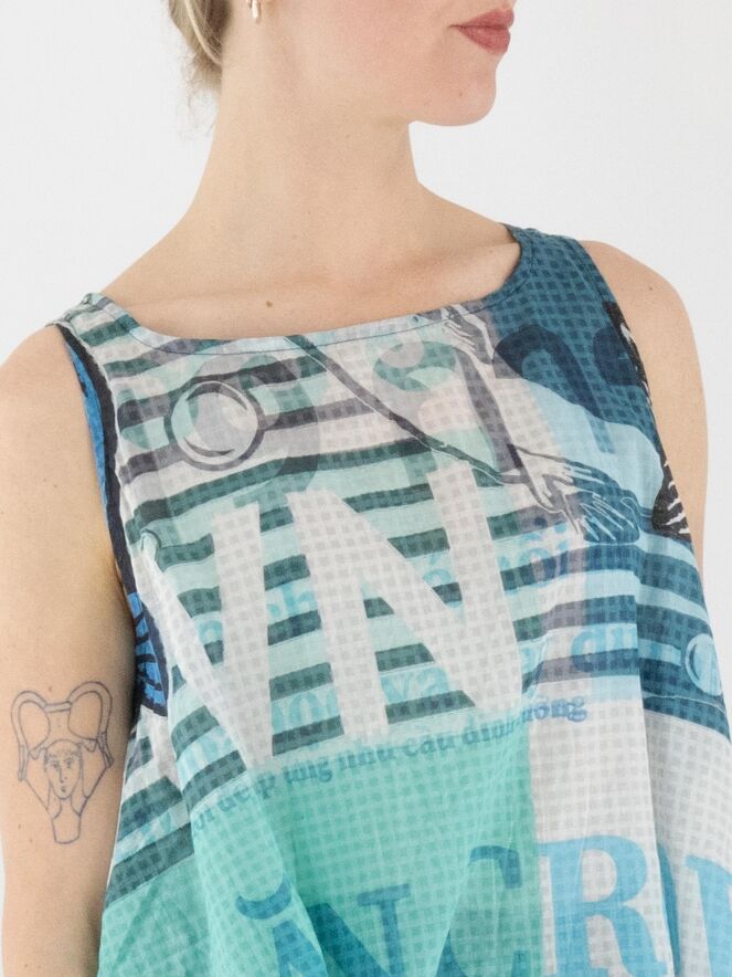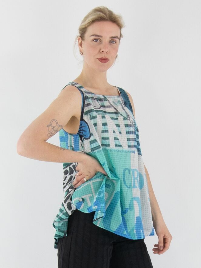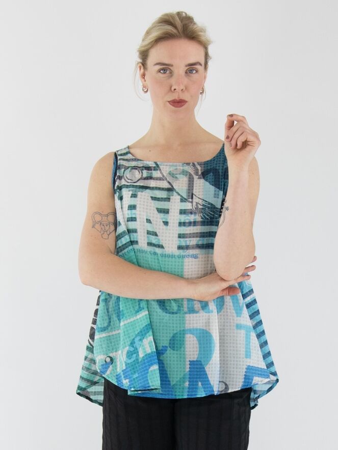 Un top légèrement transparent de Rundholz Black Label avec un imprimé de textes et de motifs carrés. L'imprimé mélange plusieurs nuances de turquoise avec du blanc et du noir. Ce top a une coupe en A et peut être lavé à 30 degrés.
