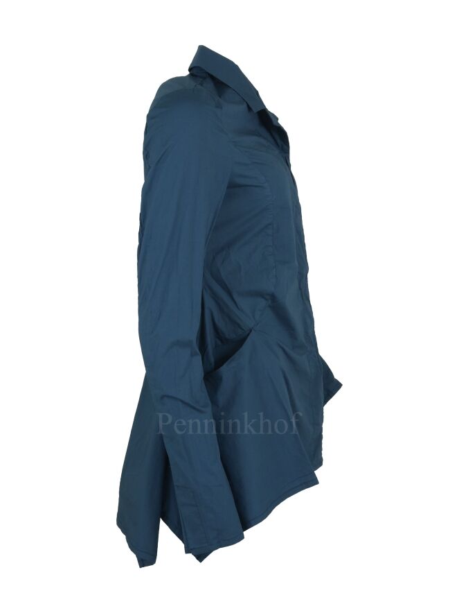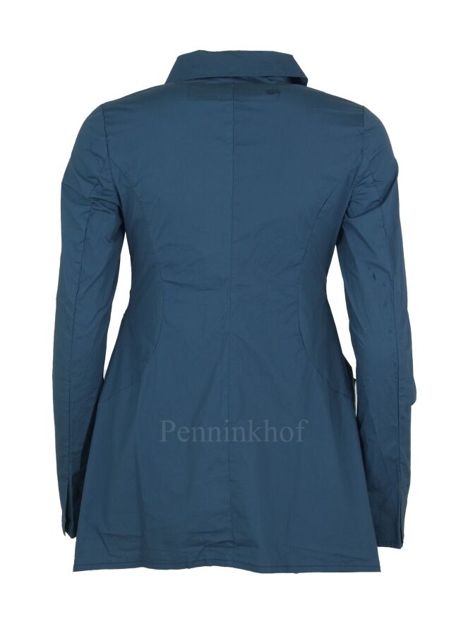 Veste longue de la marque Rundholz, de couleur bleu pétrole. La fermeture est assurée par 4 boutons magnétiques. A partir de la taille, le tissu épouse très largement les poches latérales. La veste est coupée plus longue à l'arrière et présente une ligne diagonale de profil. Modèle non doublé. Lavage à 30 degrés.