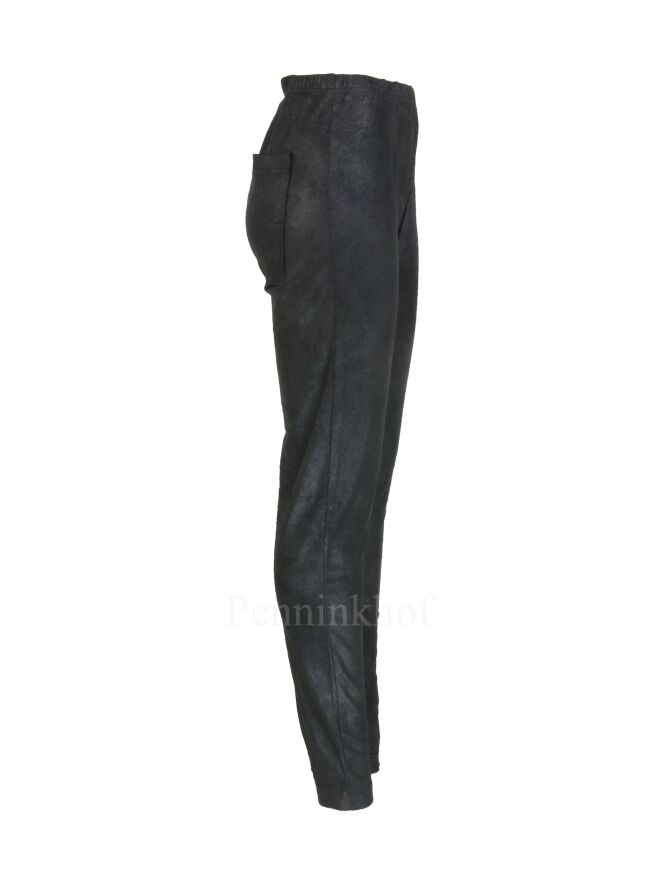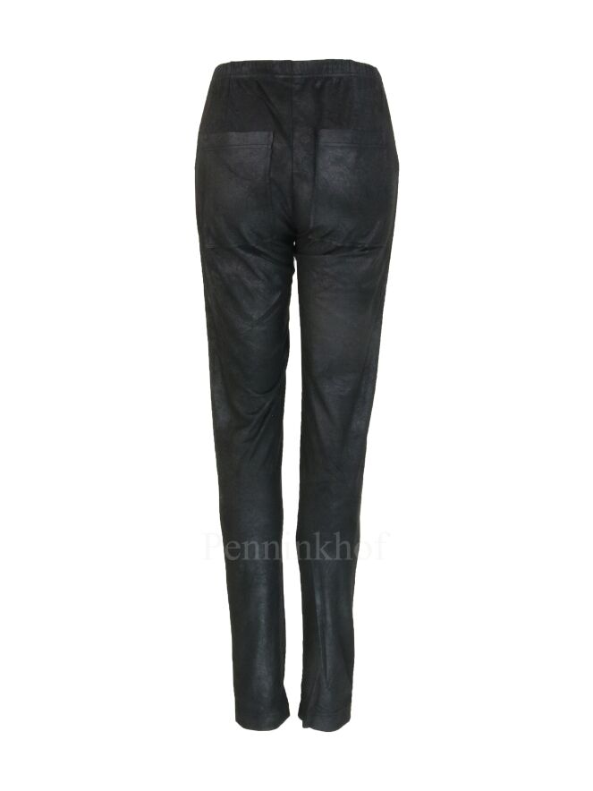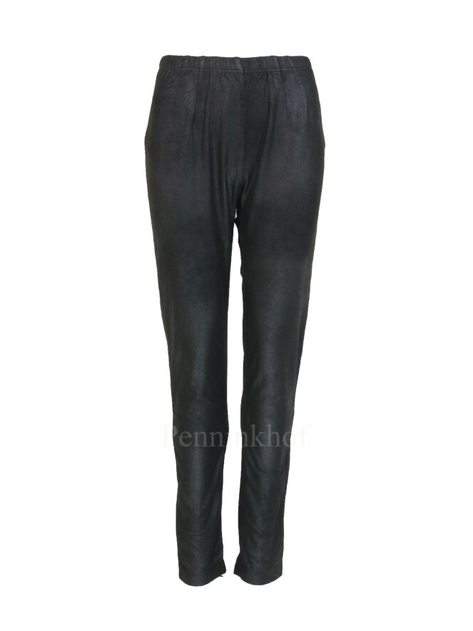 Pantalon traité dans un tissu ciré froissé très tendance de couleur noire, de la marque Rundholz. Il est équipé d'une bande élastique à fronces à la taille et de deux poches plaquées arrière. Lavage à 30 degrés.