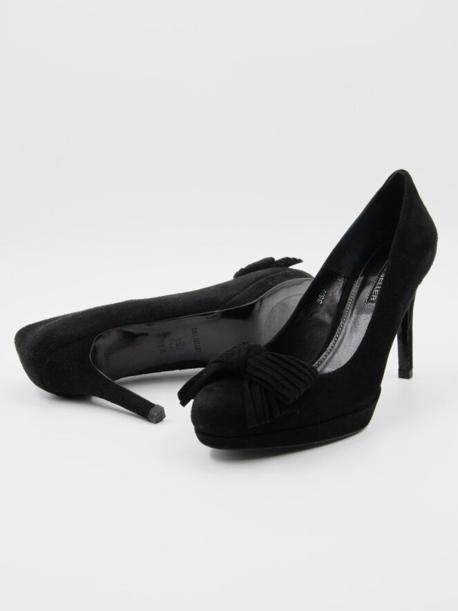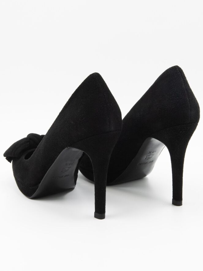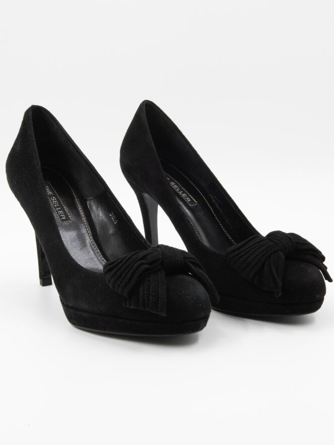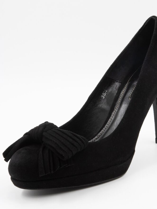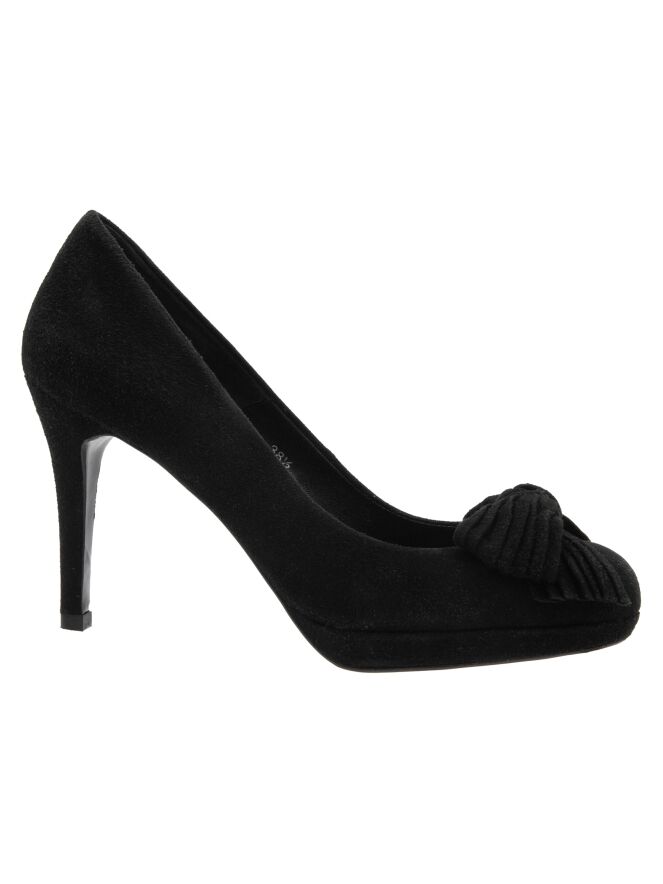 Un escarpin de Spazio Moda en noir. L'escarpin est doté d'une semelle plateforme et d'un nœud décoratif sur l'avant-pied, construit en couches. L'escarpin a un bout rond, et le talon haut est revêtu du même suède que l'escarpin lui-même. L'intérieur est doublé de cuir.