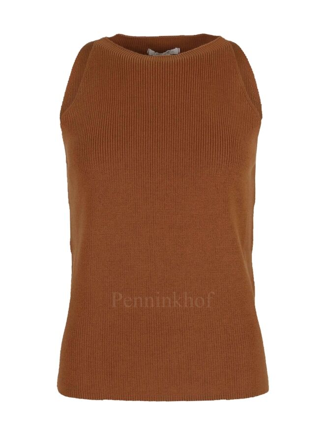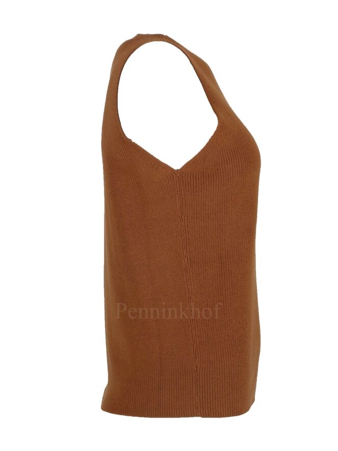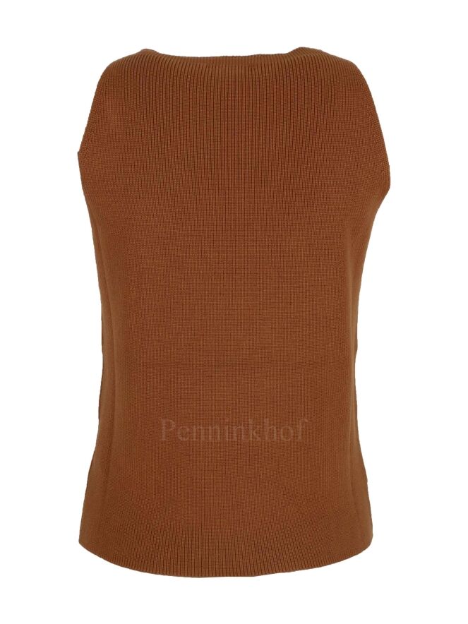 Top sans manches en tricot de couleur marron, de la marque Tandem. Il présente un col rond et des emmanchures s'ouvrant depuis le milieu des épaules. Lavage à 30 degrés.