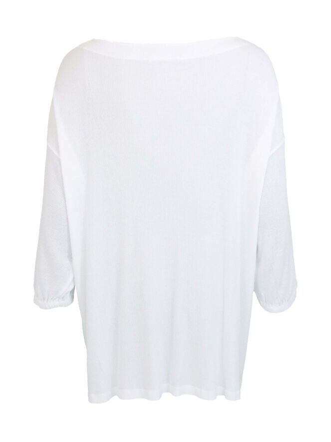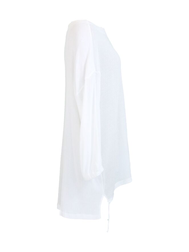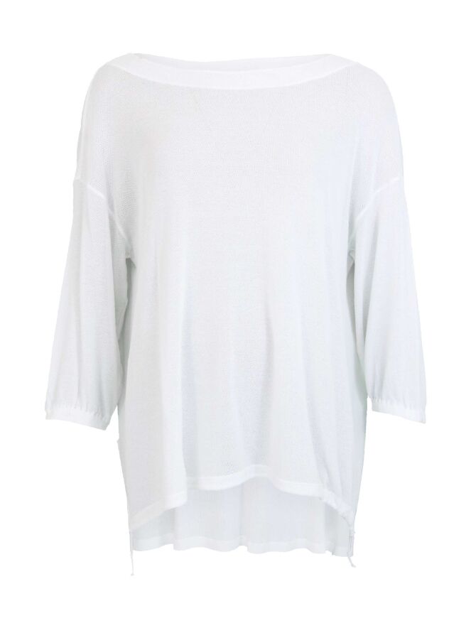 Pull tissé à large col bateau, de la marque Transit, de couleur blanche. Le pull, transparent sur le devant, présente un tissu à un motif finement côtelé dans le dos. Le col est bordé d'un large ourlet. Le pull est équipé de manches mi-longues se resserrant jégèrement à ses extrémités grâce à un élastique incorporé. Un cordon est inséré dans l'ourlet du devant, plus court que celui de l'arrière. Lavage à 30 degrés.