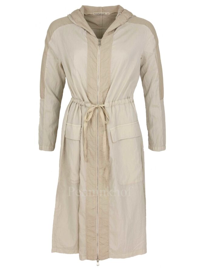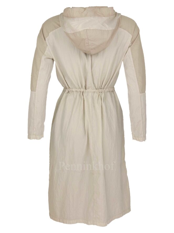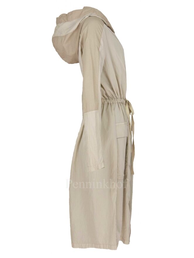 Longue veste de la marque Transit, de couleur sable. Elle est équipée d'un cordon réglable inséré dans le tissu au niveau de la taille. En-dessous, se trouvent 2 poches à rabat de chaque côté de la fermeture Eclair. Cette dernière est agrémentée d'un passepoil d'un vert plus foncé, ainsi que sur les épaules et le bout de la capuche. Lavage à 30 degrés.