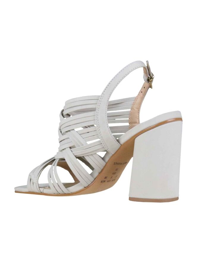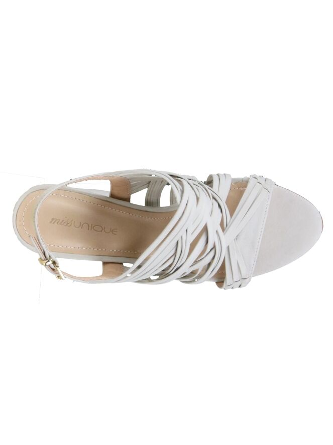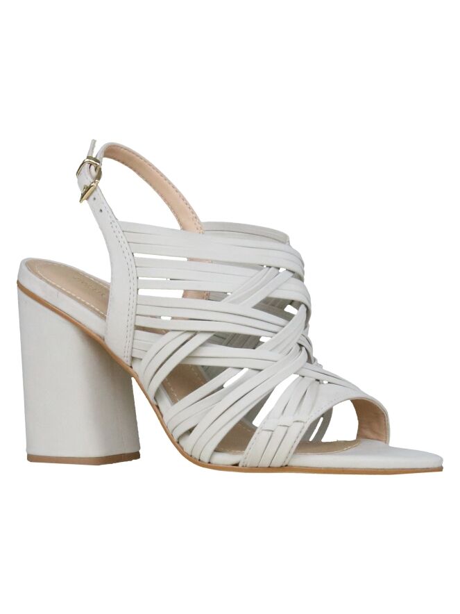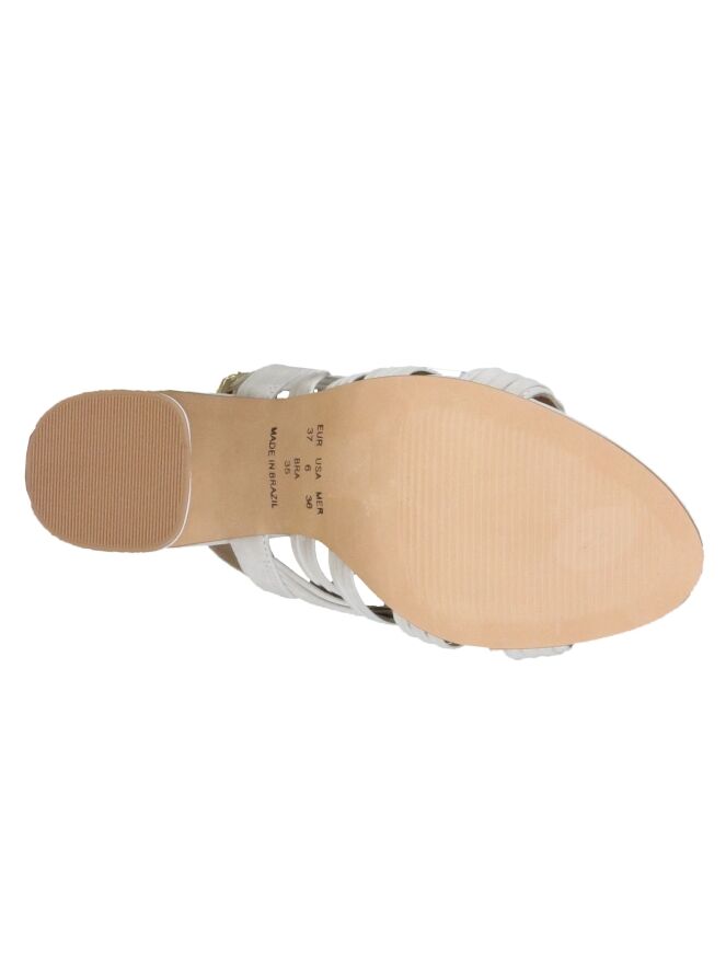 Sandale ouverte de la marque Vicenza de couleur gris clair. Elle est faite de plusieurs lanières entrecroisées en diagonale sur l'avant-pied. La sangle du talon est réglable. Le talon carré légèrement incurvé est recouvert du même matériau que la sandale.