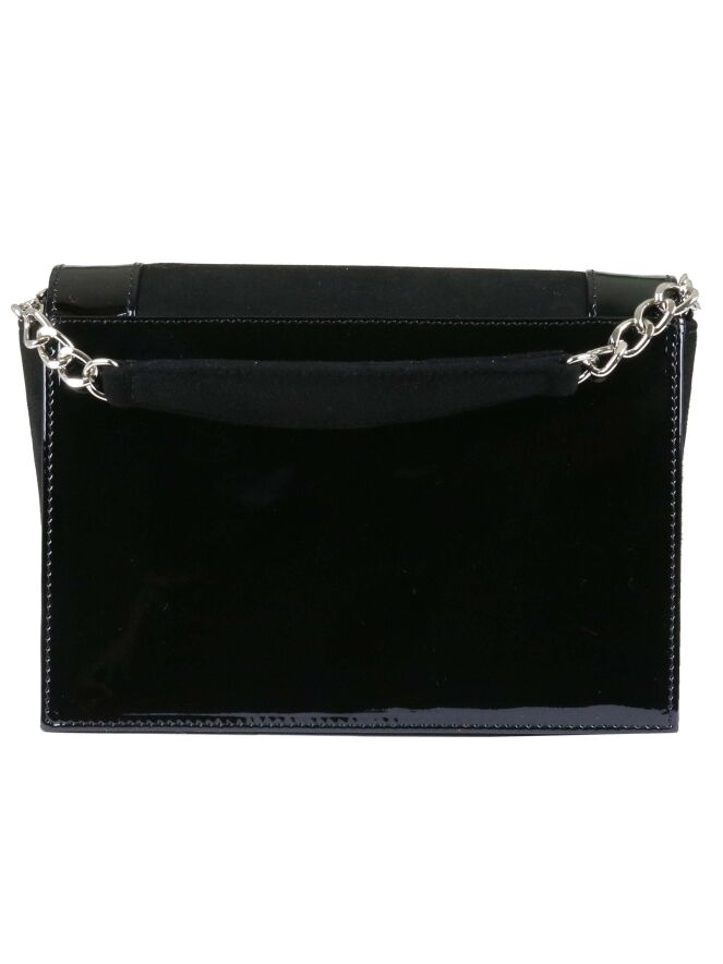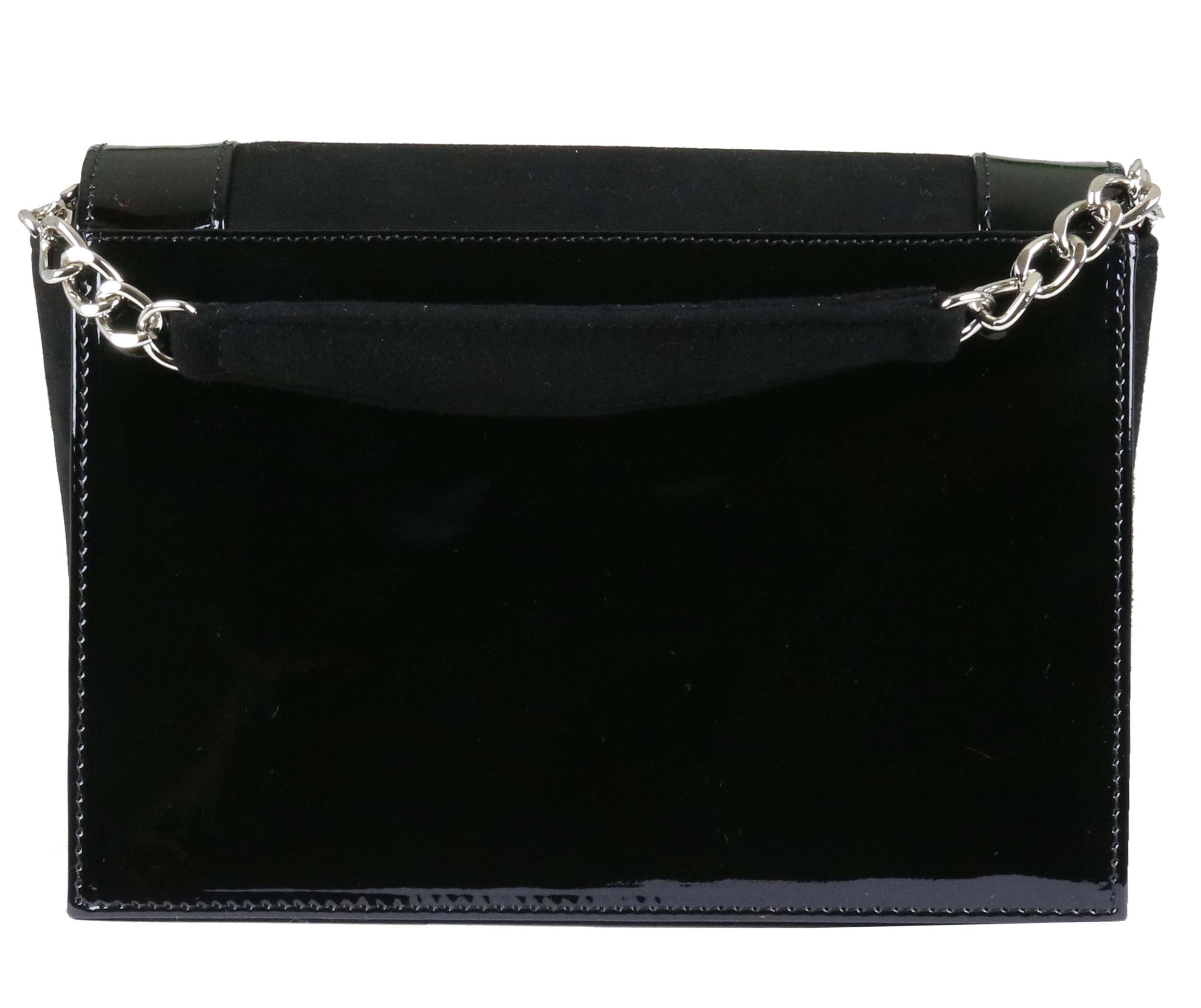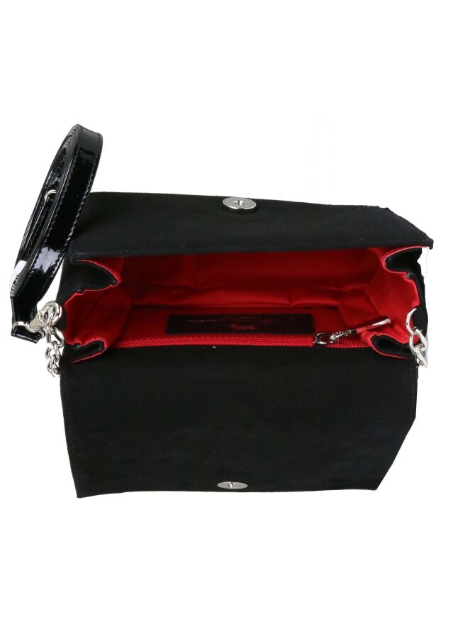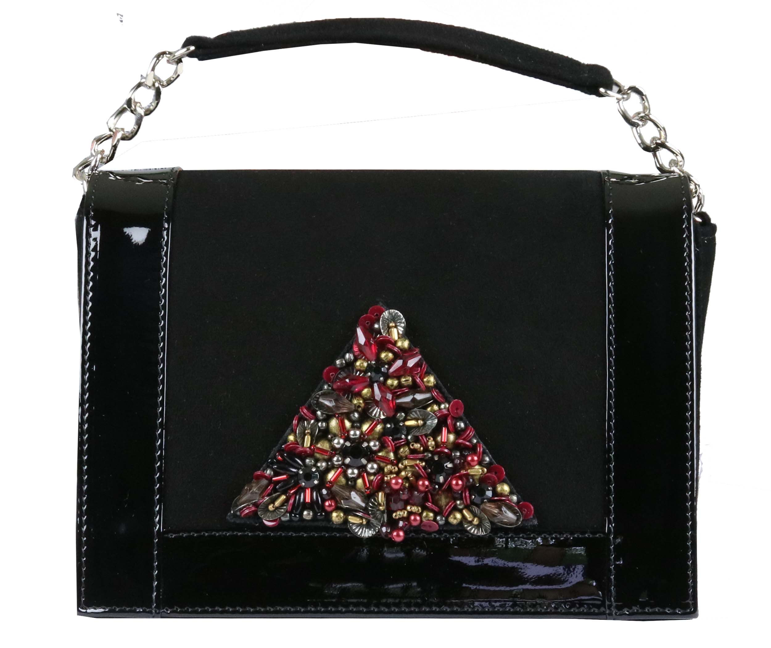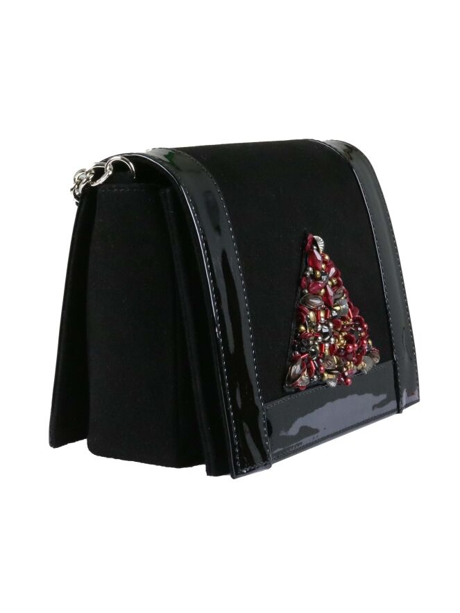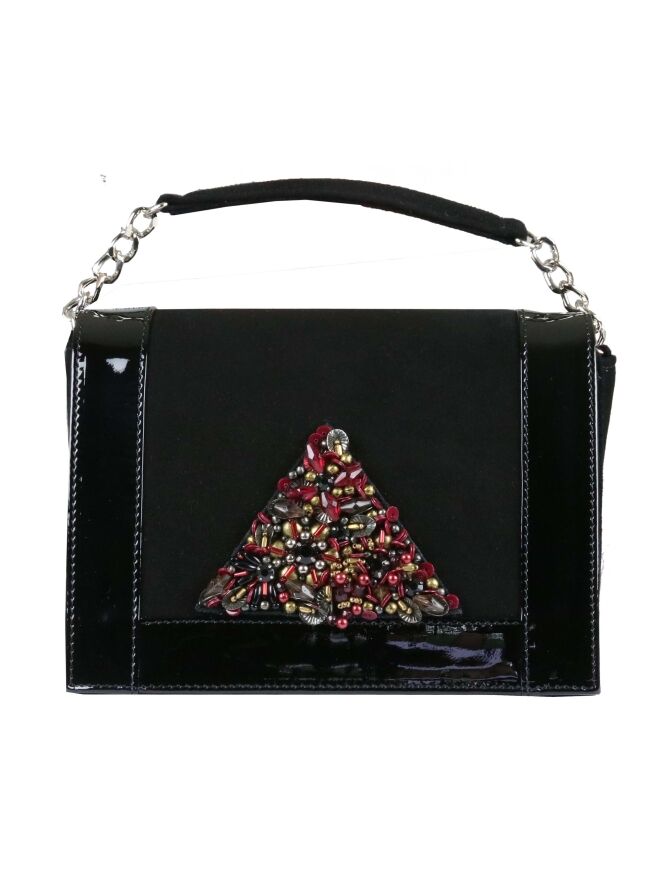 Sac de la marque Voltan, de couleur noire. Les bords et le dos sont en cuir verni noir. Le devant, en daim Camoscio, est orné d'un triangle de strass et de paillettes aux couleurs rouge rubis, bronze et cuivre. Le sac est équipé d'une courte et d'une longue poignée en chaîne argentée. L'intérieur est doublé d'un tissu rouge.