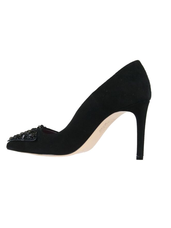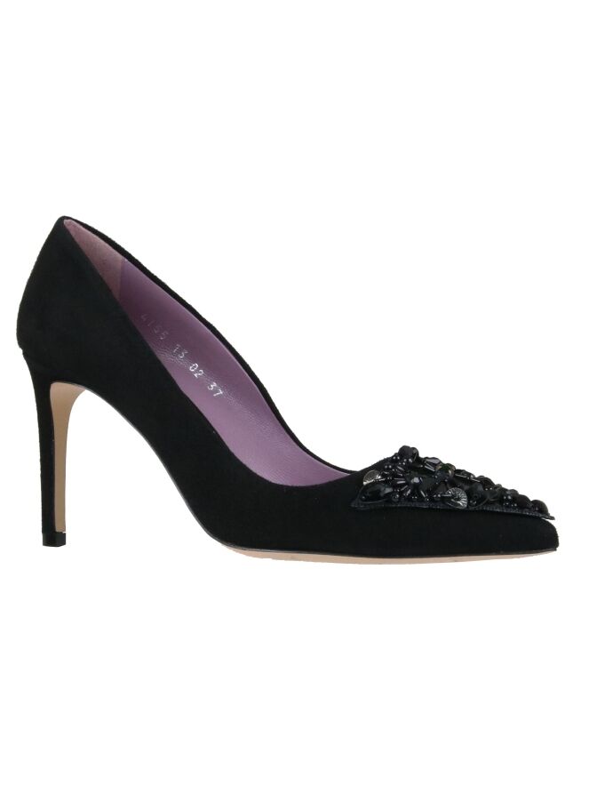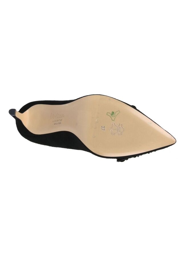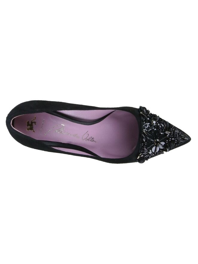 Elégant escarpin à talon haut, de la marque Voltan, de couleur noire. L’avant-pied est orné de strass et de paillettes noirs en forme de triangle. Le nez est pointu et l'intérieur est doublé de cuir.